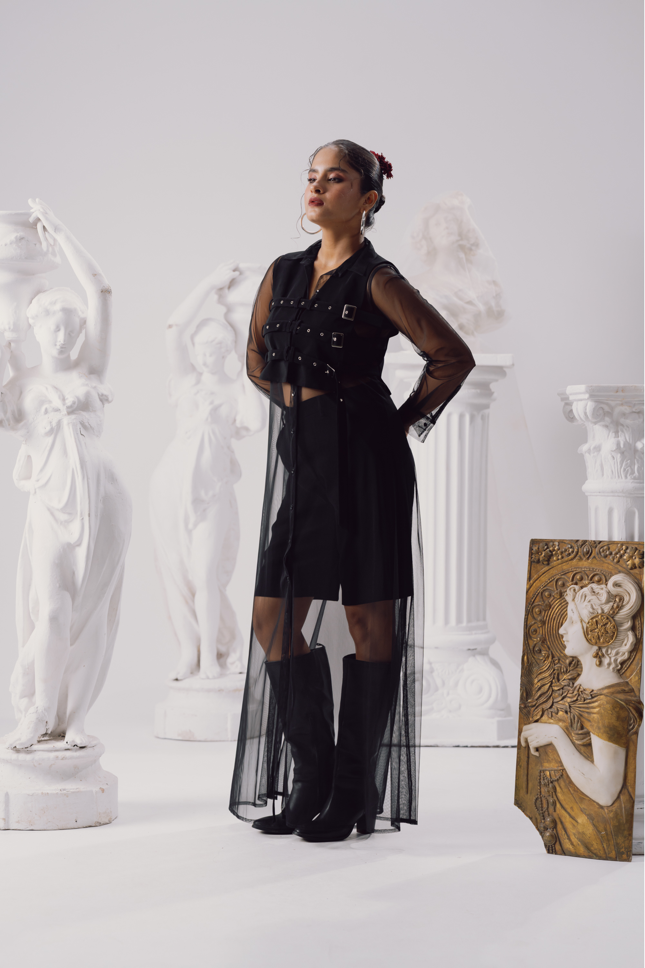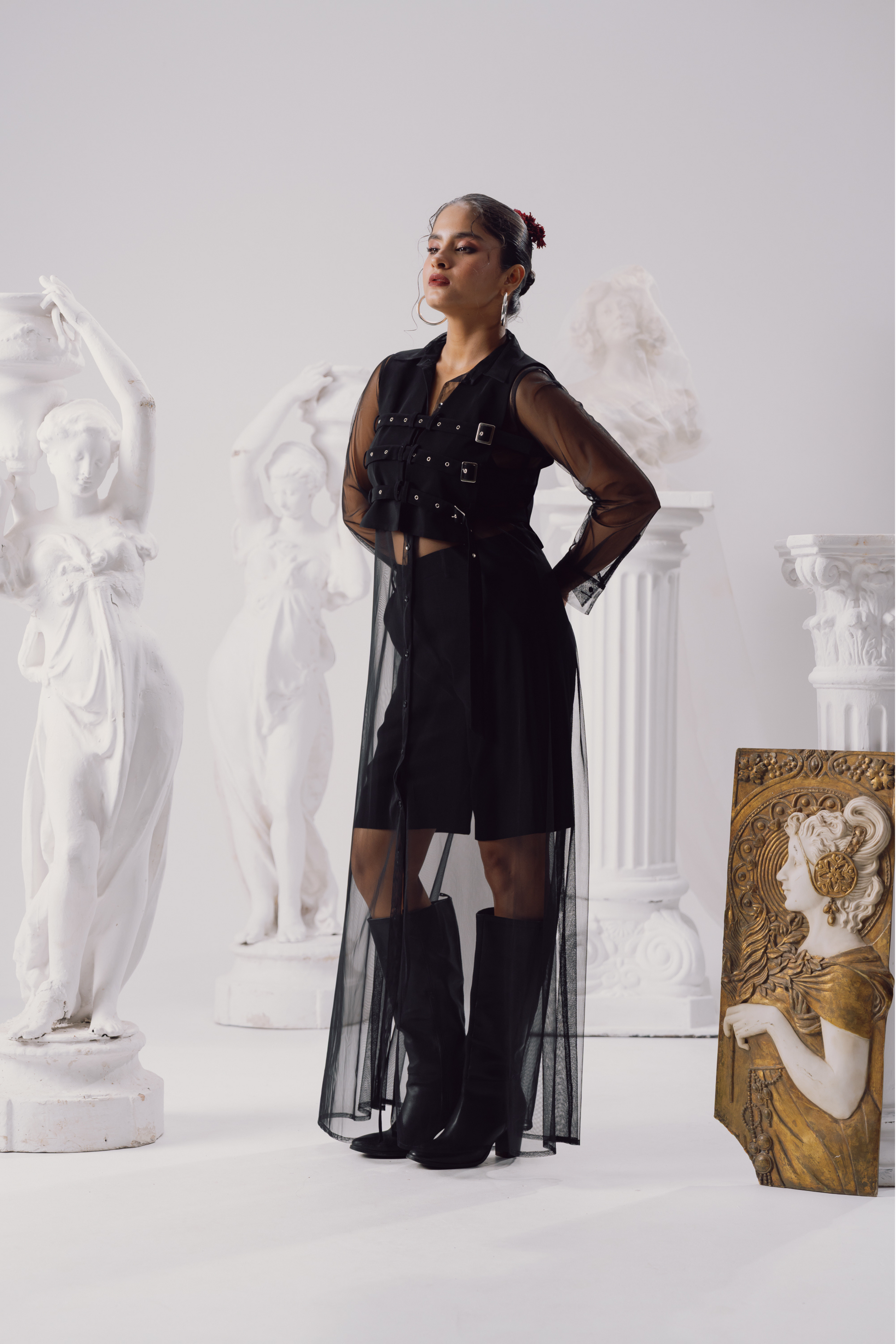 Designed in black viscose-blend fabric, these relaxed-fit over jacket shows a comfortable look, offering a refined yet casual silhouette. Featuring a front button and zipper opening, belt loops, and functional side pockets, the design merges utility with ease. Part of the Genesis Pre-Fall 2025–26 collection, the piece reflects a versatile aesthetic that transitions effortlessly across everyday wear.