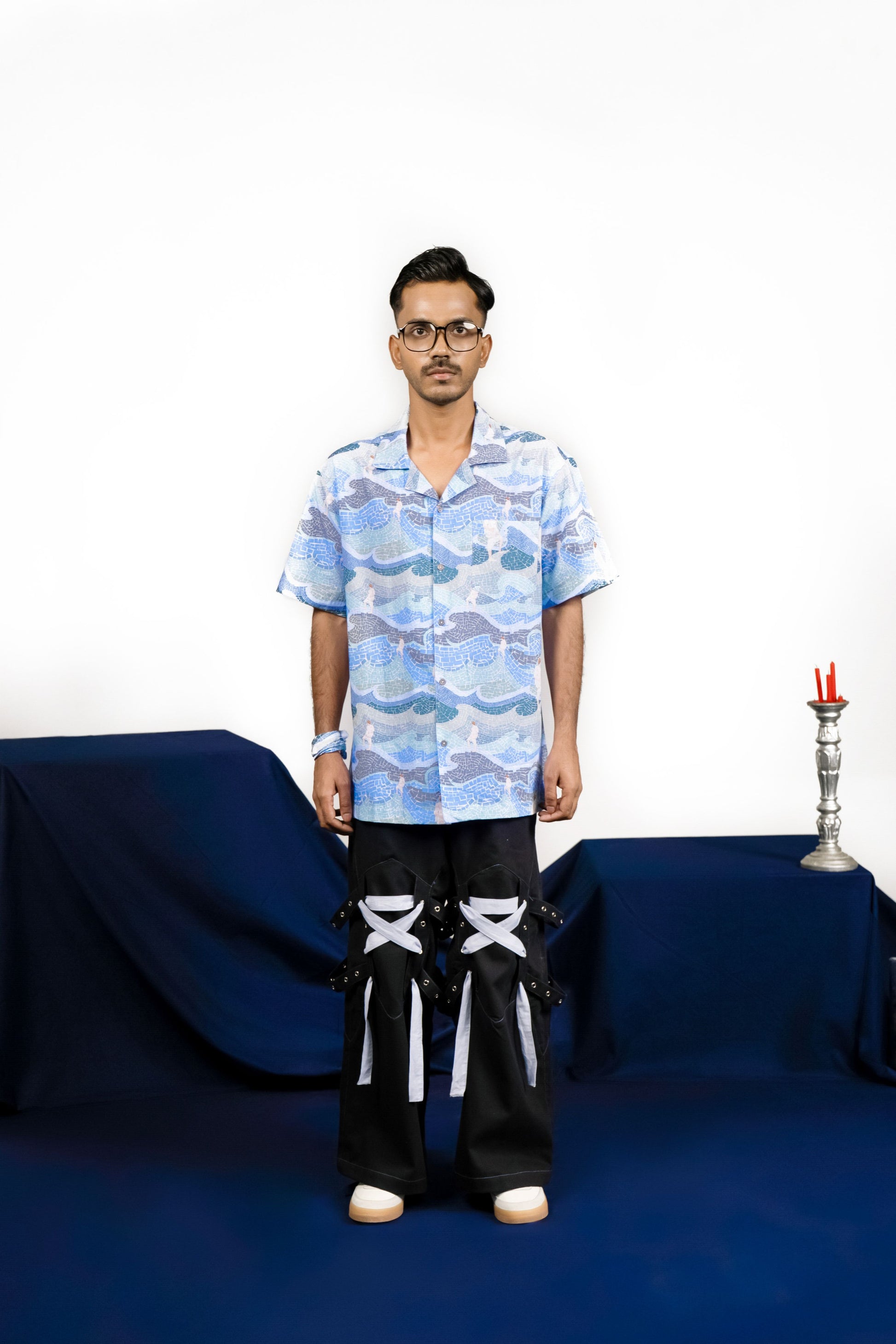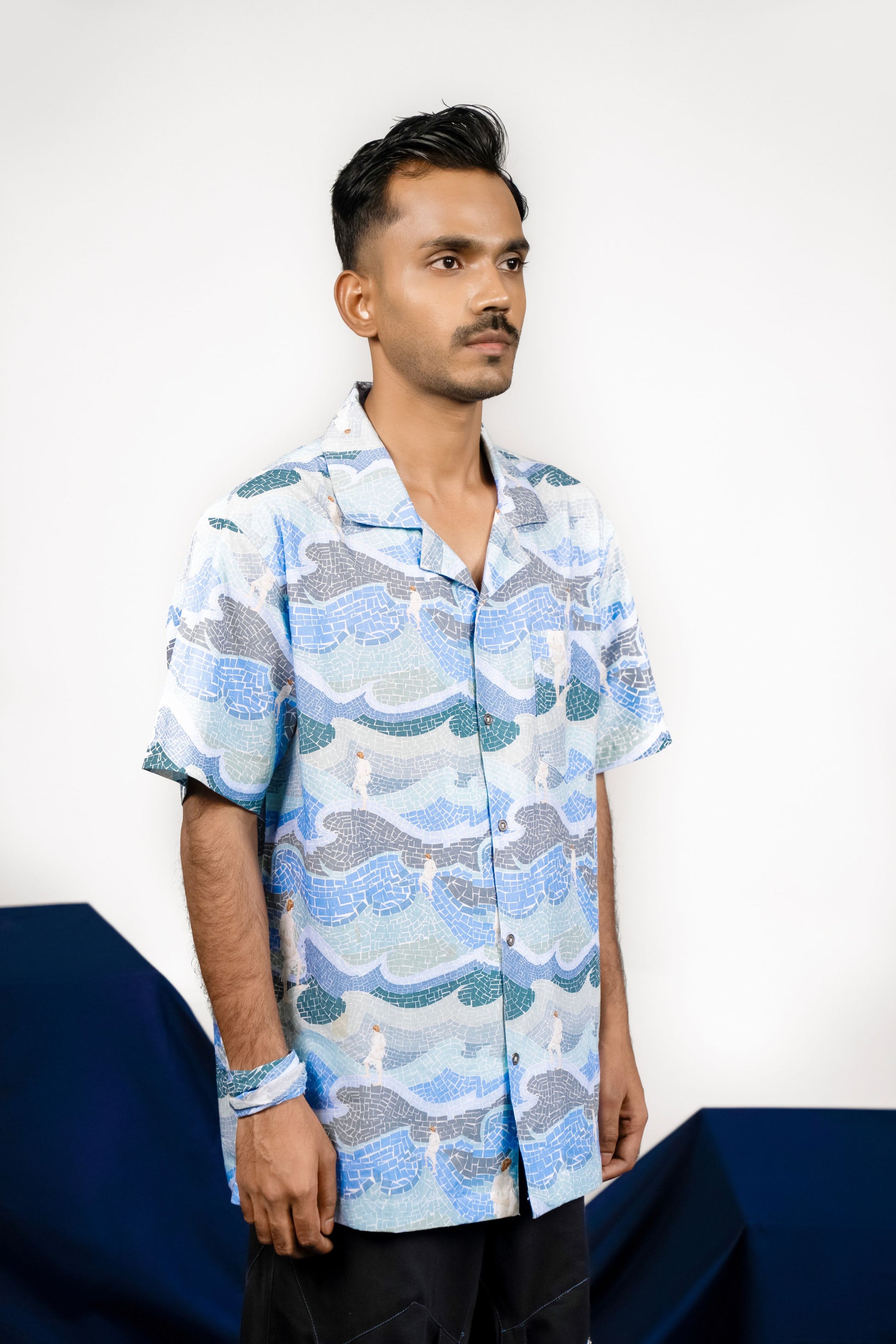 Made in a Thnwhn original print “Against the tide “ , inspired from the constant tides and struggles we face as we move ahead and the strength to remain unshaken. It showcases a person riding the high waves that try to drown them. This shirt has a cuban collar and half-sleeve made in breathable and light cotton poplin fabric.