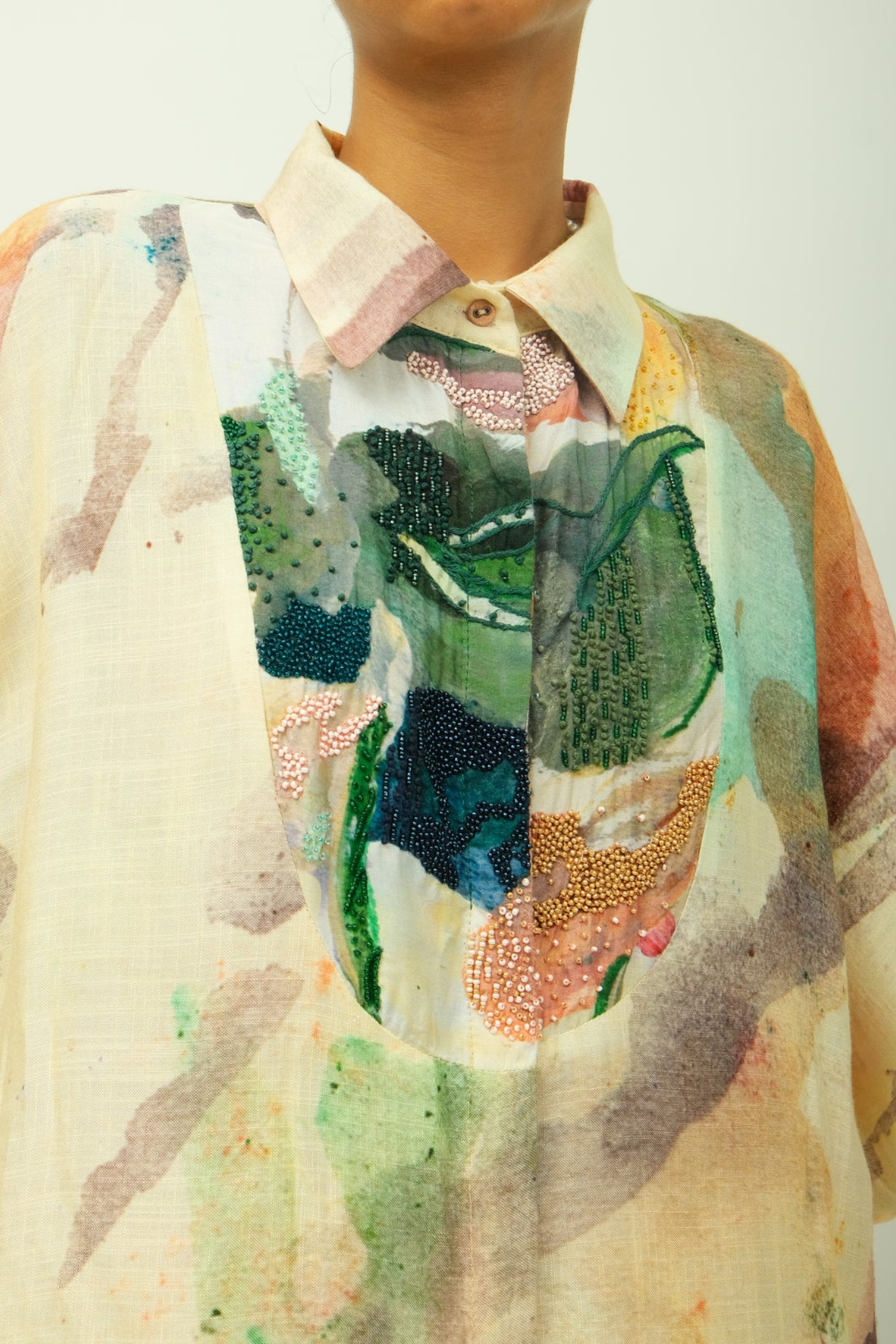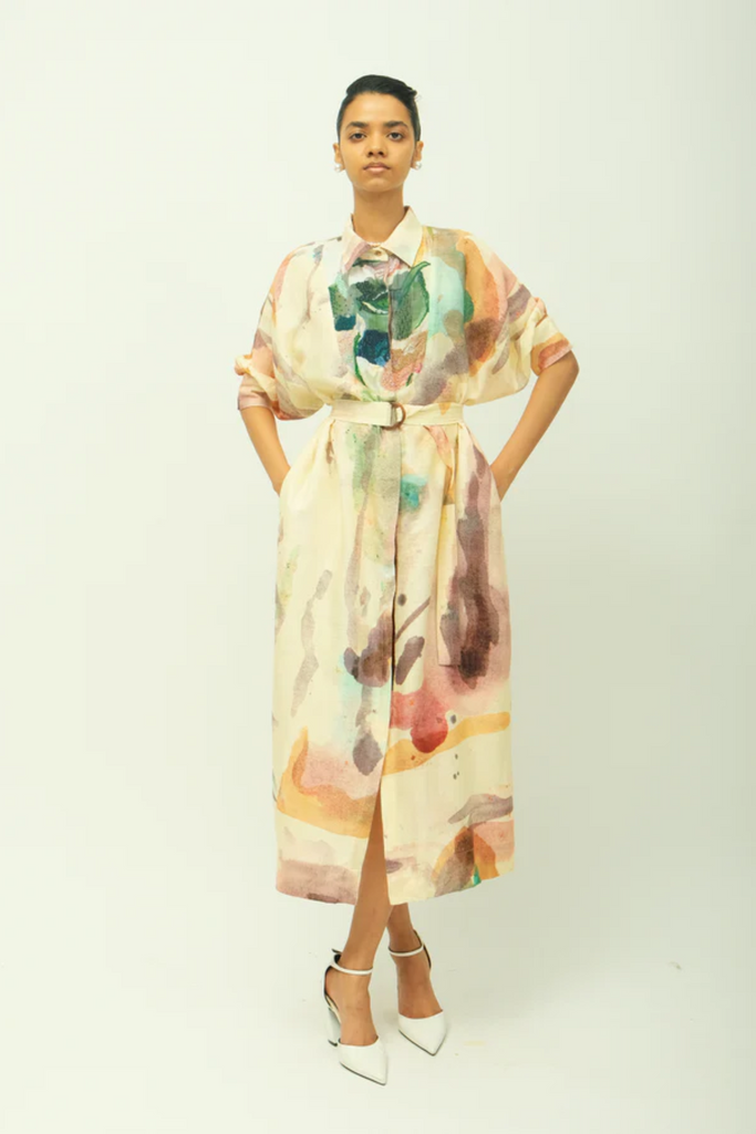 Anti-Fit Dress, asymmetrical yoke, bead detailing, shirt collar, full concealed placket, three-fourth sleeves, side pockets, hand-painted abstract expressionist digitally transferred print,. Variations in color, texture, and weave are inherent due to the hand-made nature of the garment- Single piece.