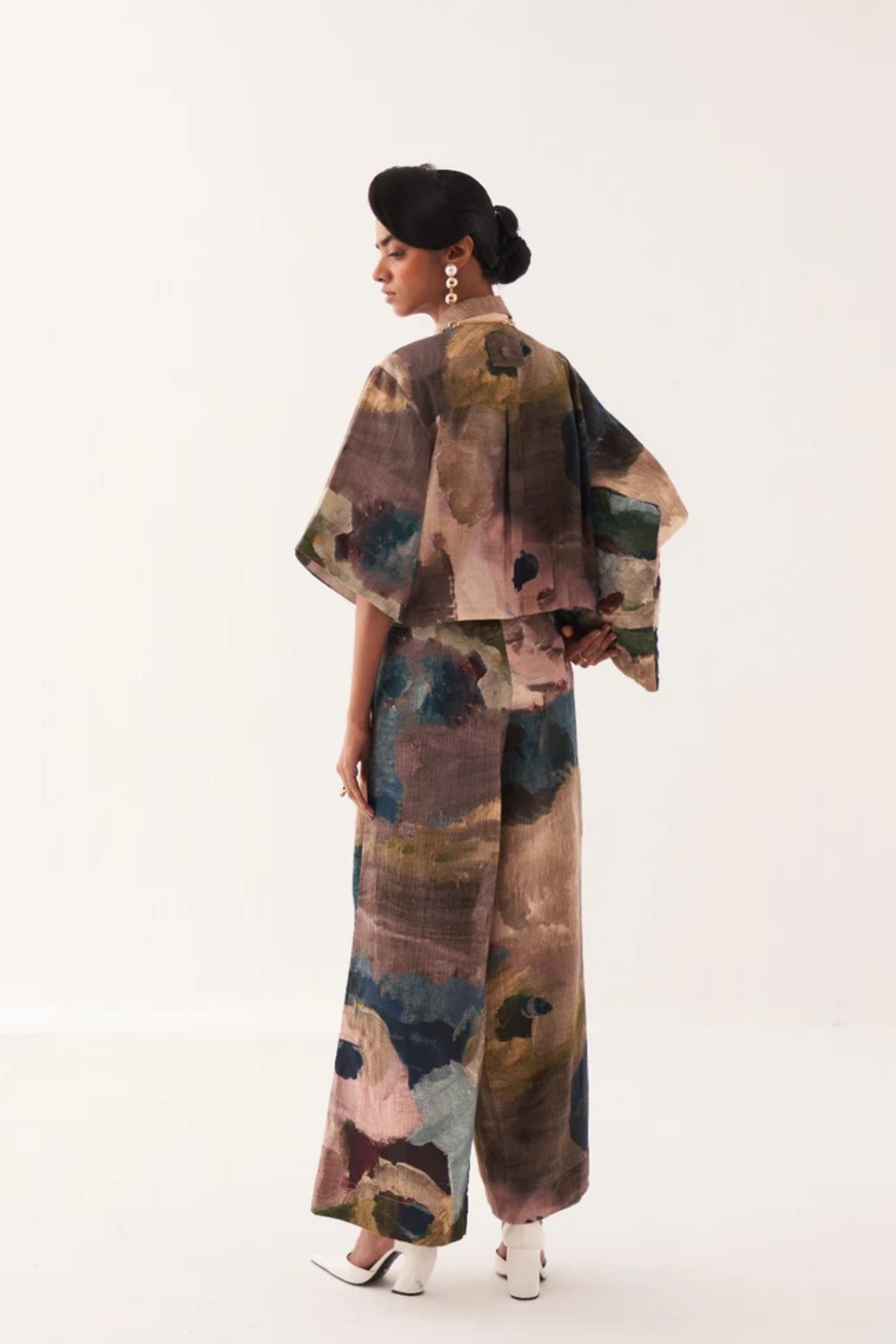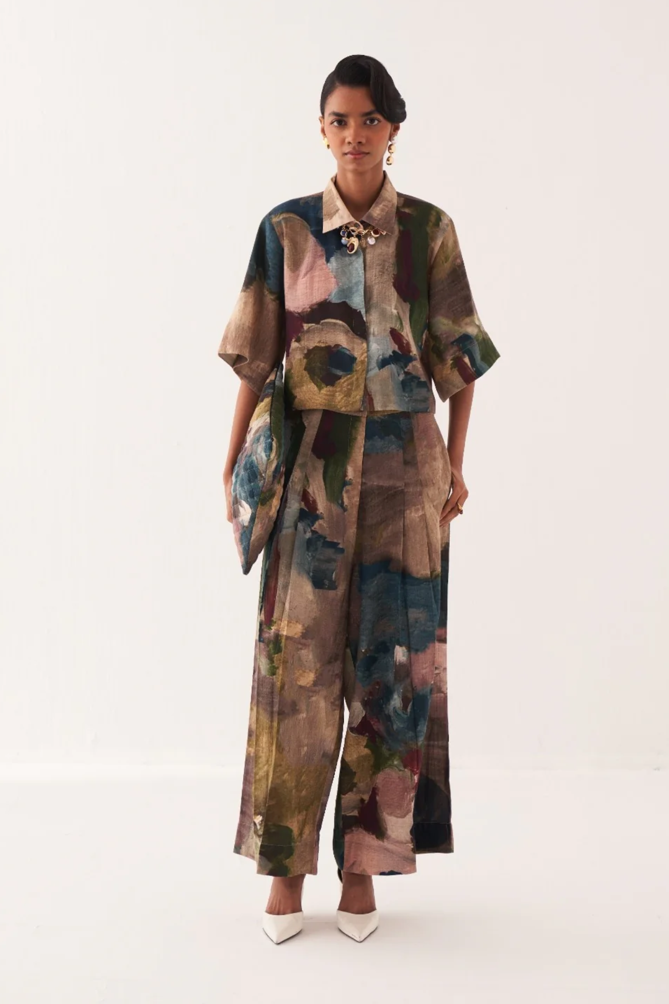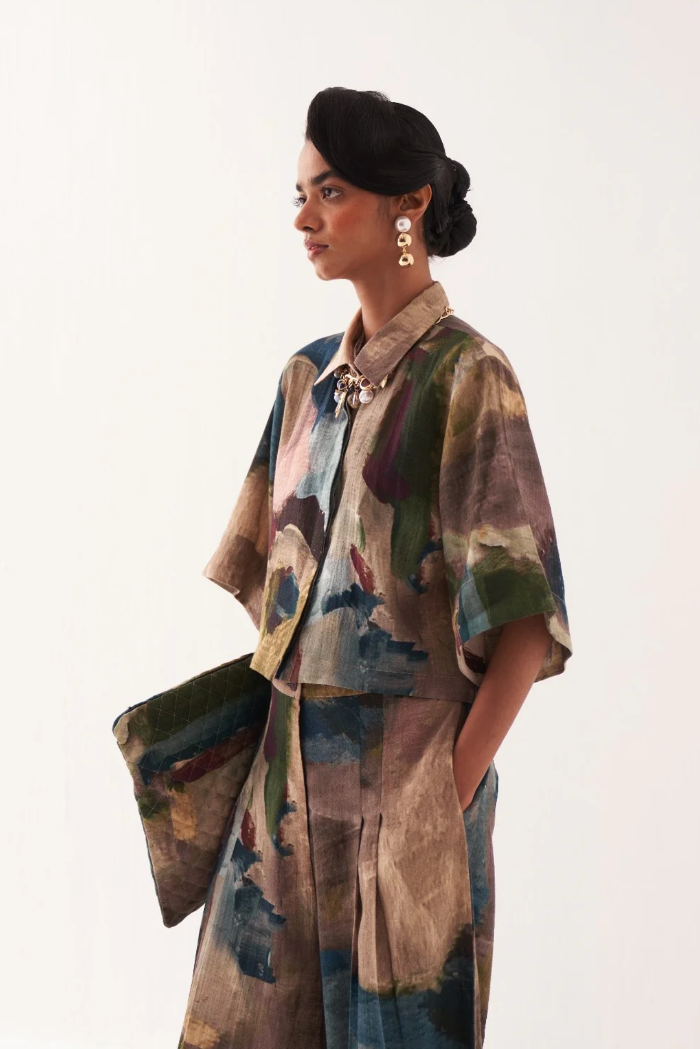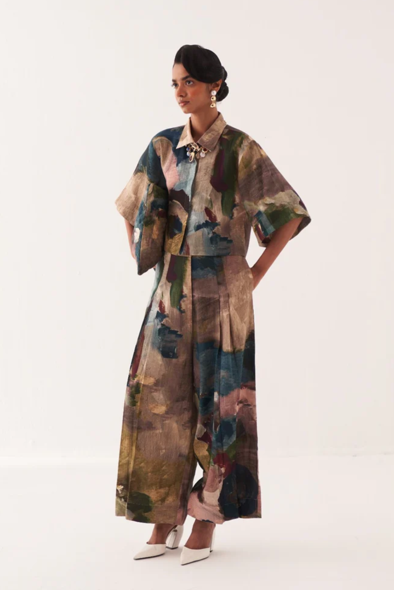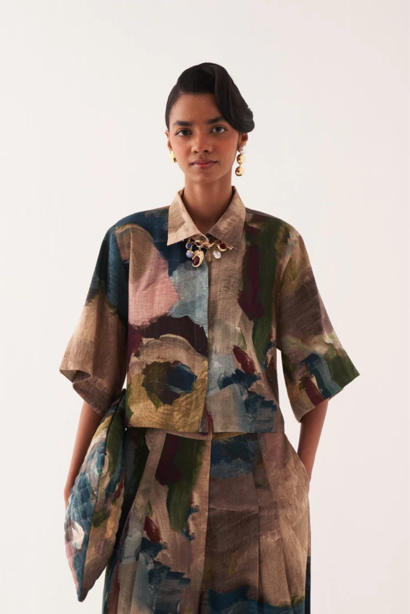 •Contemporary Crop Top: An anti–fit cropped shirt featuring a hand–painted abstract expressionist print digitally transferred for an artistic look, detailed with a back yoke and an elegant box pleat.
