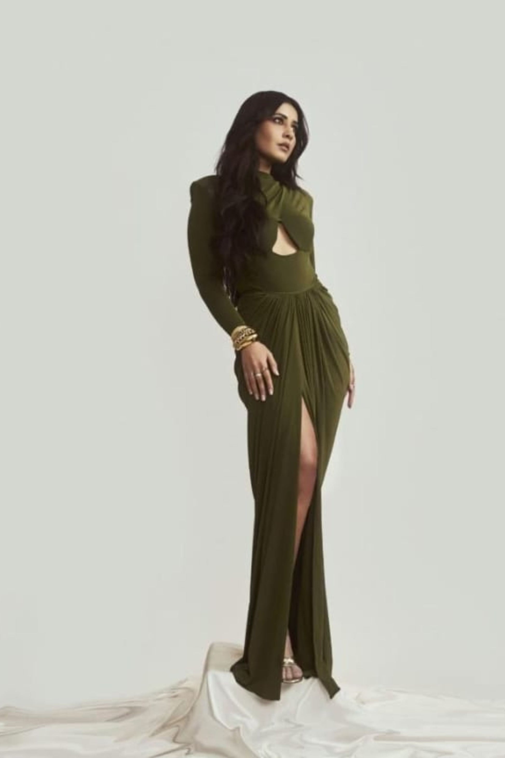 The design showcases a flowing, full-lenth skirt with an elegant front slit. this slit not only adds a touch of sophistication but also allows for ease of movement, enhancing the overall grace of the garment. The draping of the skirt createsa beautiful, fluid silhouette, perfect for making a statement at any event.