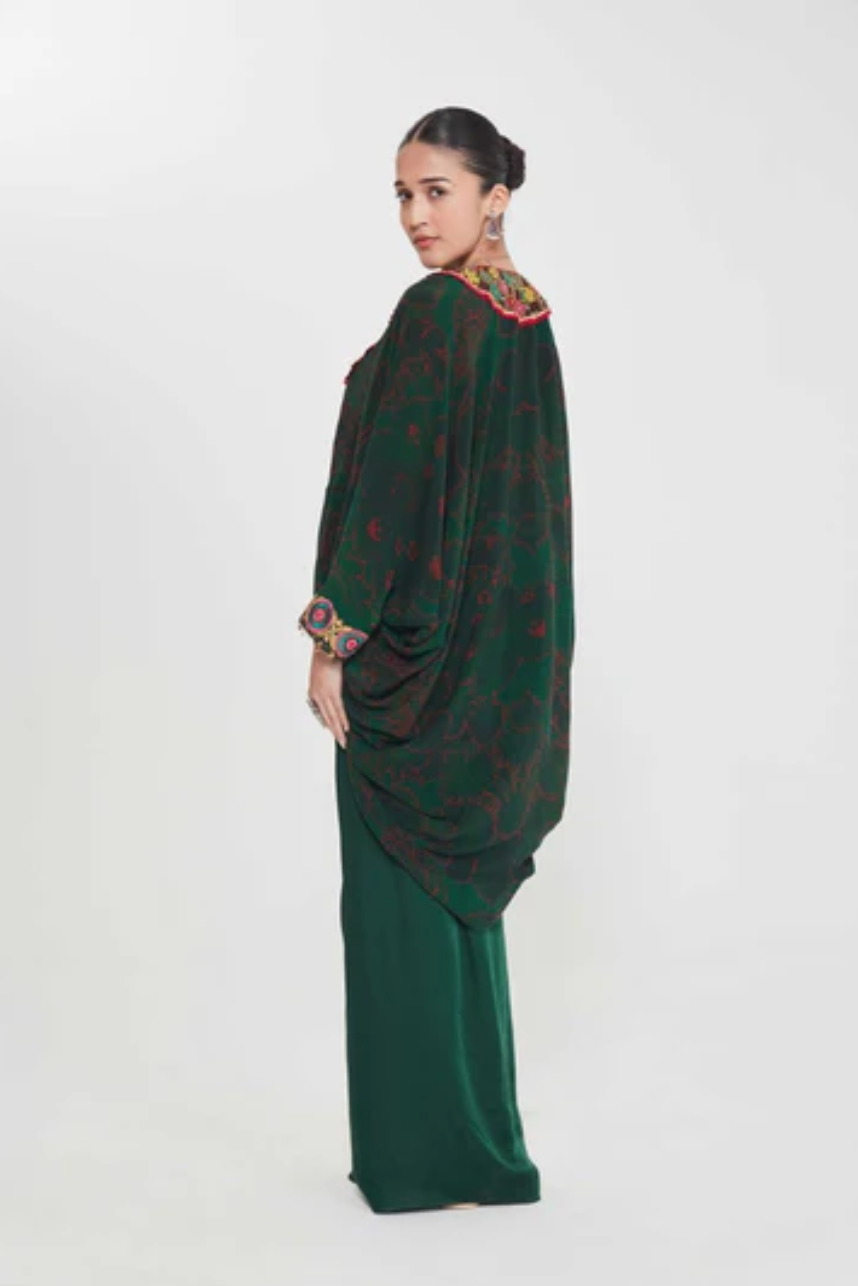 Description Sb Signature Emerald Green Shrug Set With Intricate Hand Embellished Border Paired With Printed Blouse And Drape Skirt. Product Code