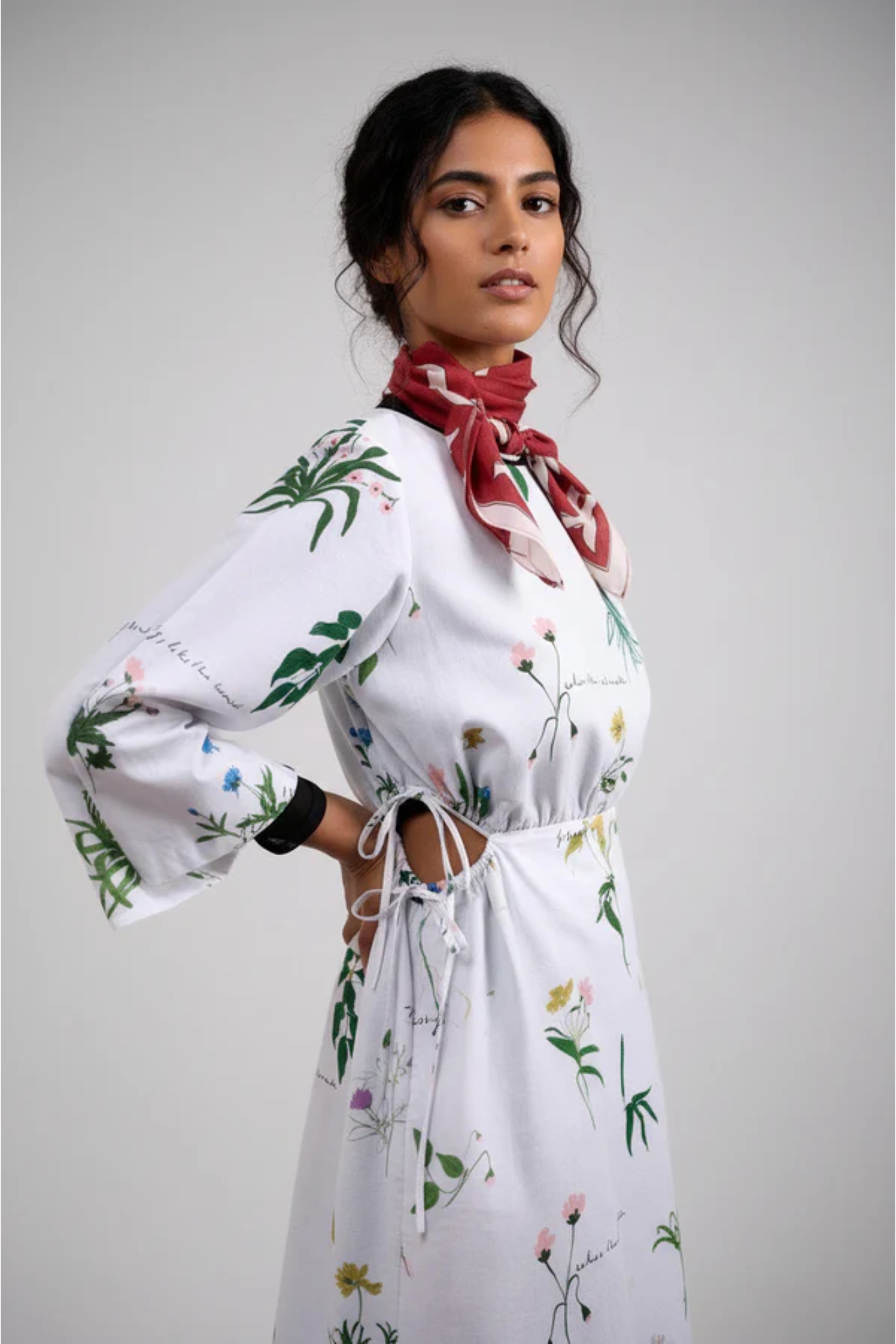 A contemporary and playful piece, this mini dress is crafted in breathable linen with an all-over print. Designed with side cut-outs and quarter-length sleeves, it adds a modern twist to a relaxed silhouette. Lightweight and comfortable, this dress is perfect for casual outings, brunches, or warm-weather styling.