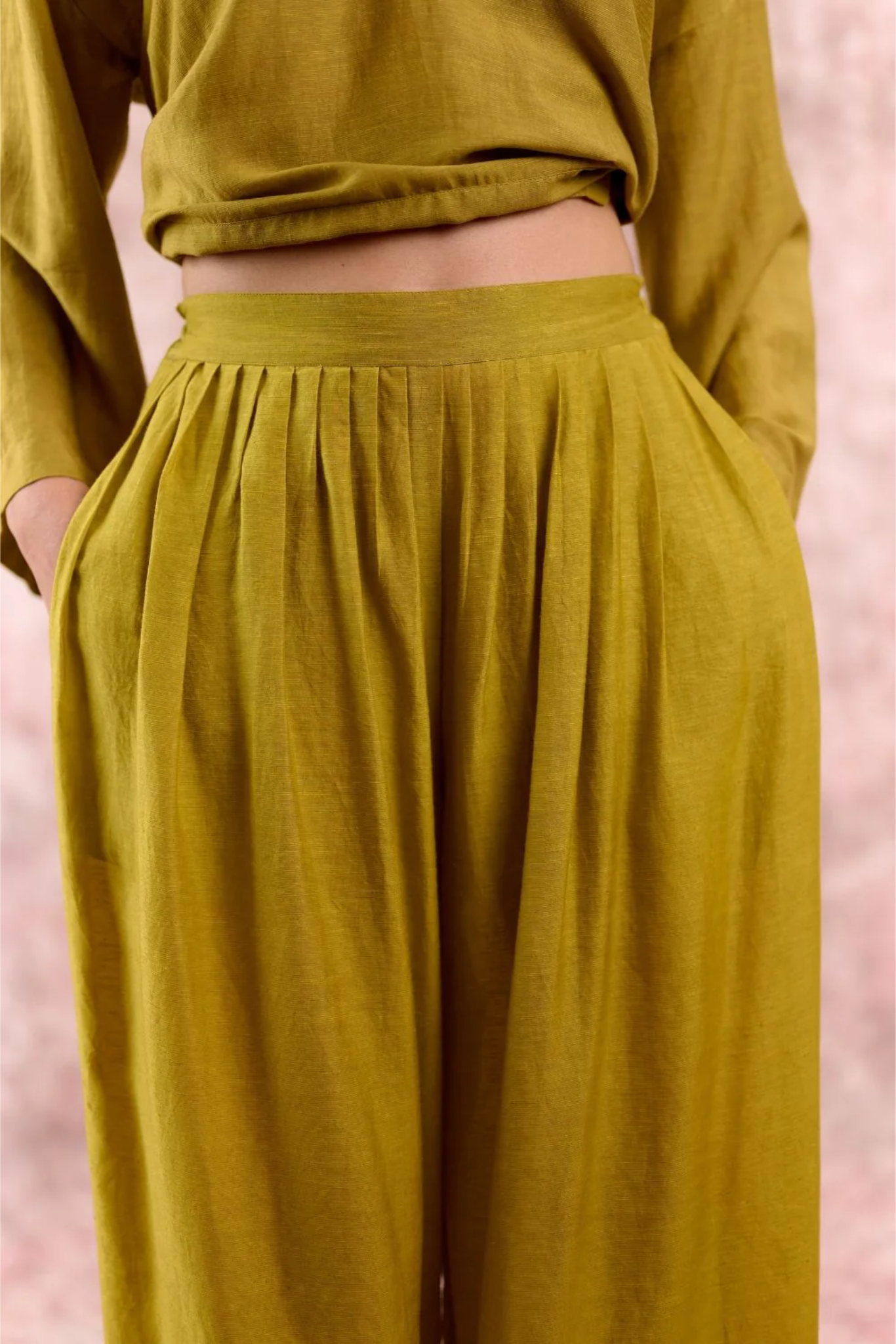 Relaxed fit pants with pleats at the front and a drawstring at the back to adjust.