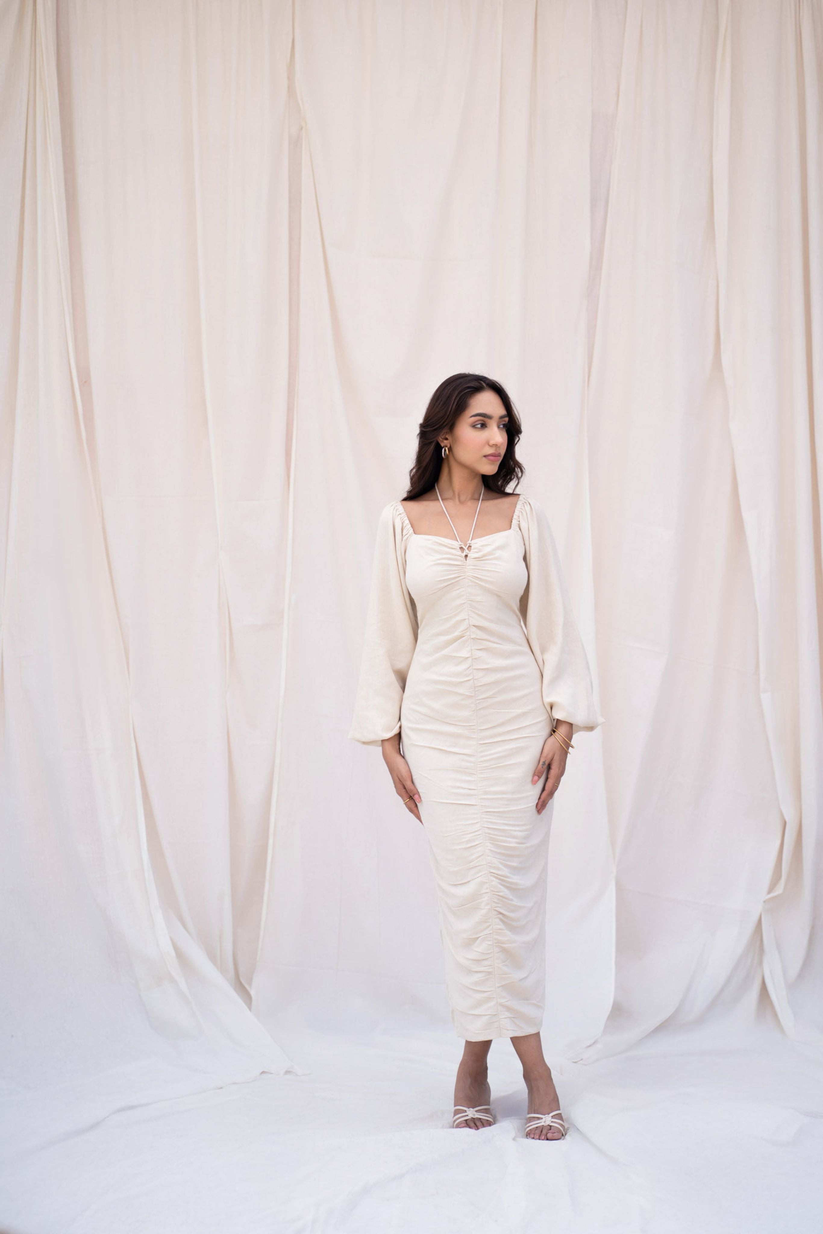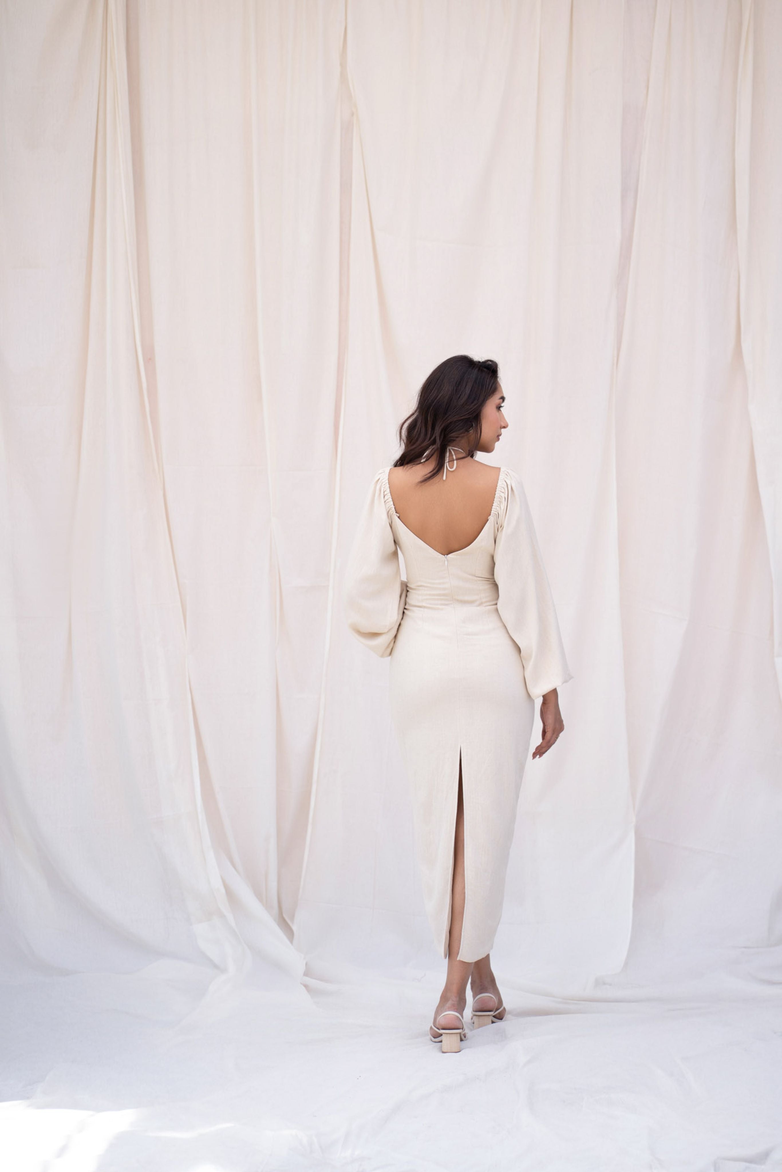 Elevate your style with this beige linen pleated midi dress featuring a flattering ruched front and billowy sleeves. Crafted for comfort and sophistication this versatile piece is perfect for brunch evenings and special occasions.