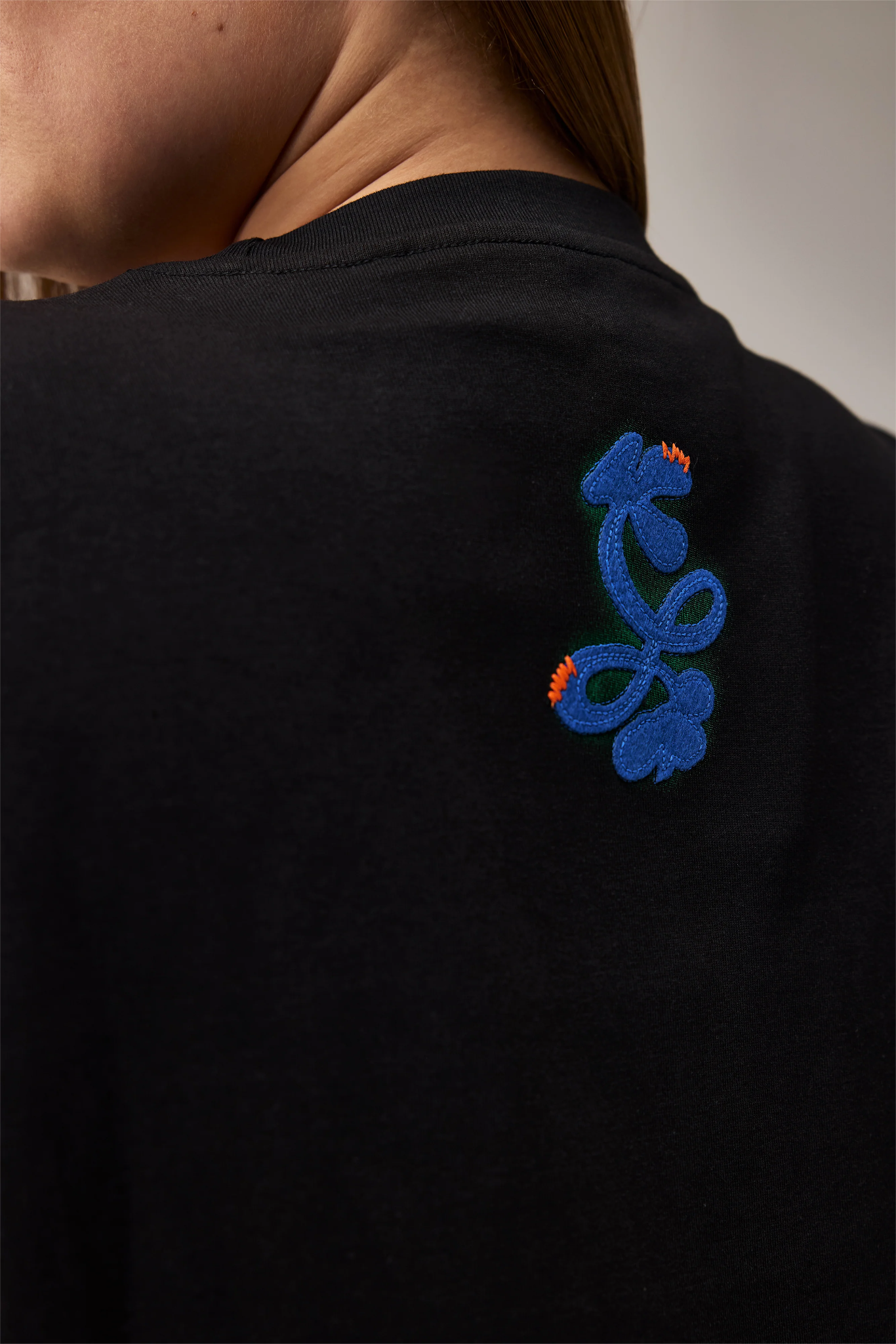 OUR OVERSIZED TSHIRT FEATURES THE LALAFLOWER LOGO PRINTED ALONG THE NECKLINE WITH HINTS OF EMBROIDERY AND ALSO COMES WITH OUR FLOWER DESIGN FELT EMBROIDERED BEHIND THE NECK.