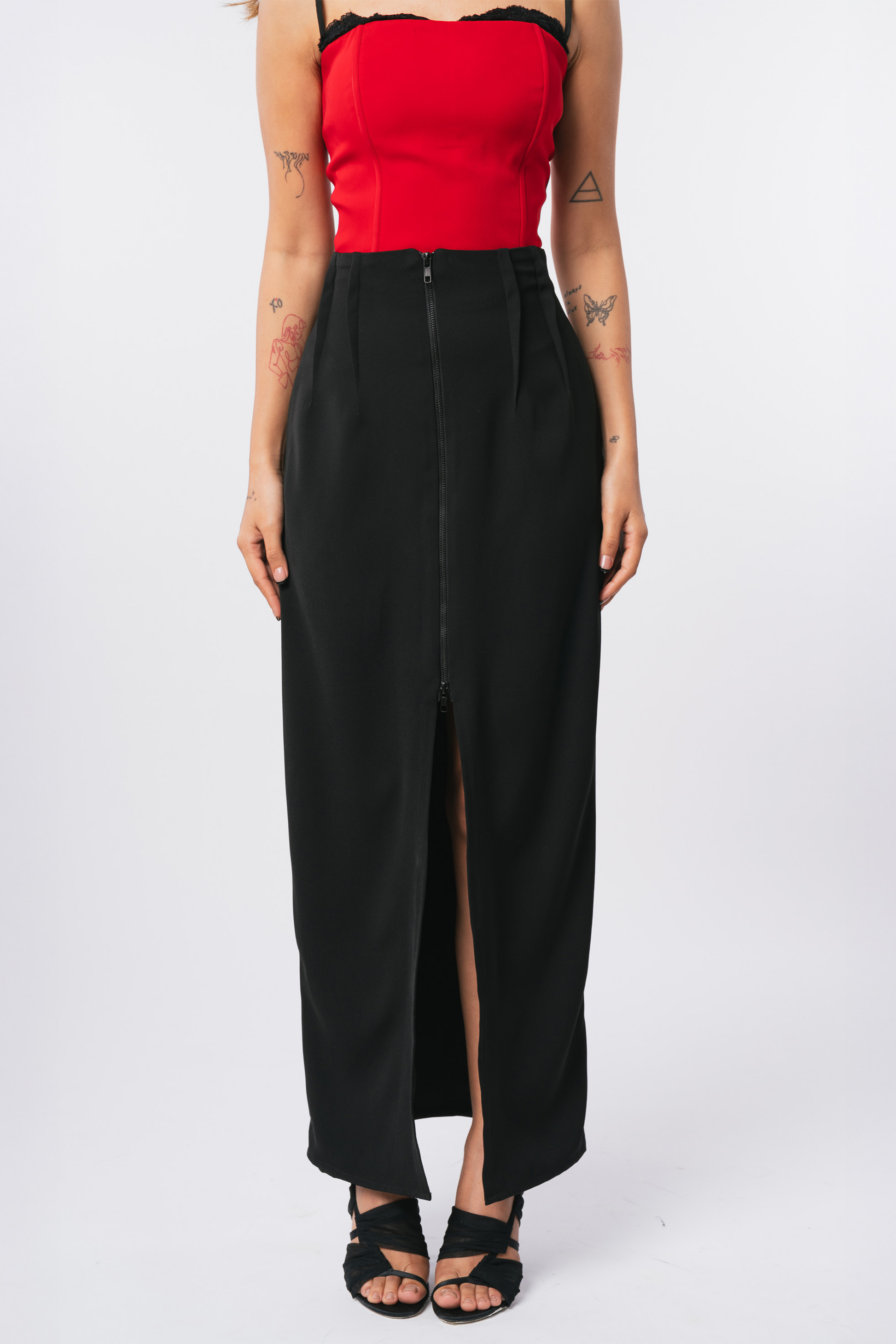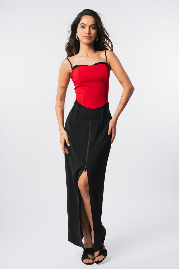 Skirt crafted from rayon fabric, featuring a two-way zipper at the front to enhance the chic slit detail. It includes pleats at the dart points, a high-waisted fit, and a concealed zipper closure at the back for a smooth and flattering silhouette.
