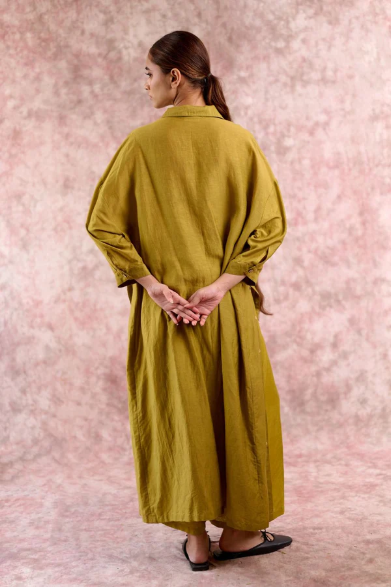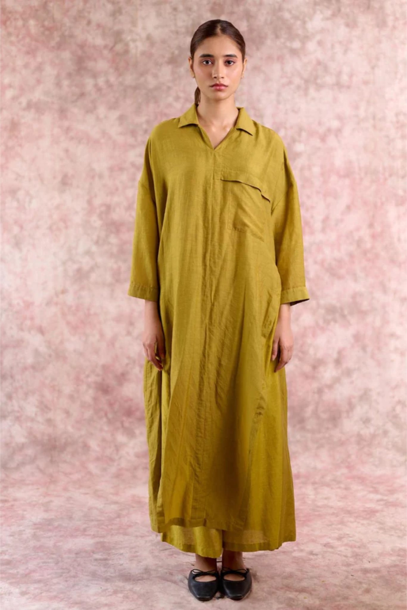 A thoughtfully designed co-ord set that blends ease with elegance. The oversized green tunic features sharp collars, cuffed sleeves, and long side slits that create fluid movement, while the relaxed-fit pants are tailored with soft front pleats and an adjustable drawstring at the back for a custom fit. Worn together, they create a contemporary silhouette that transitions seamlessly from day to evening, while each piece also stands strong, styled on its own.