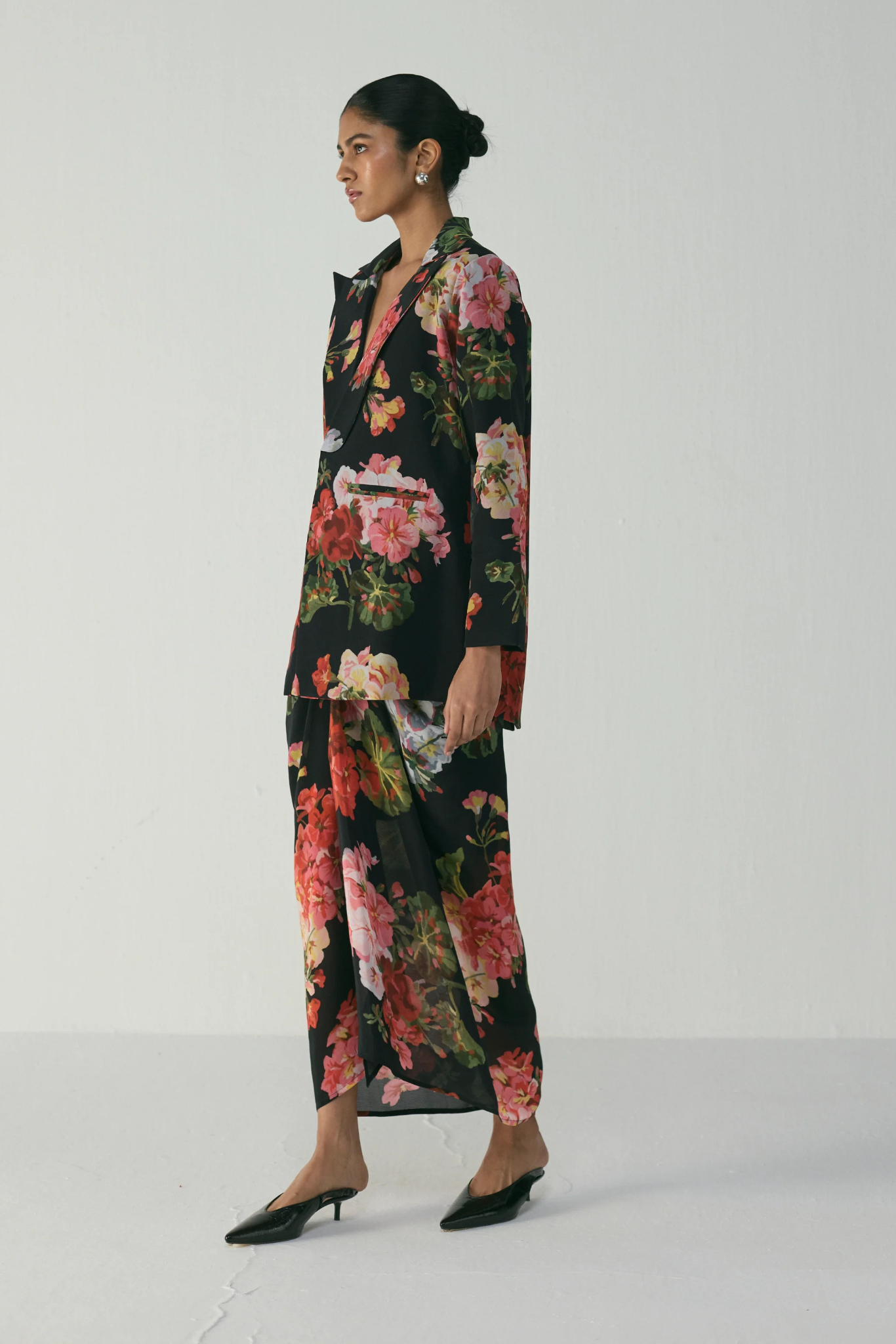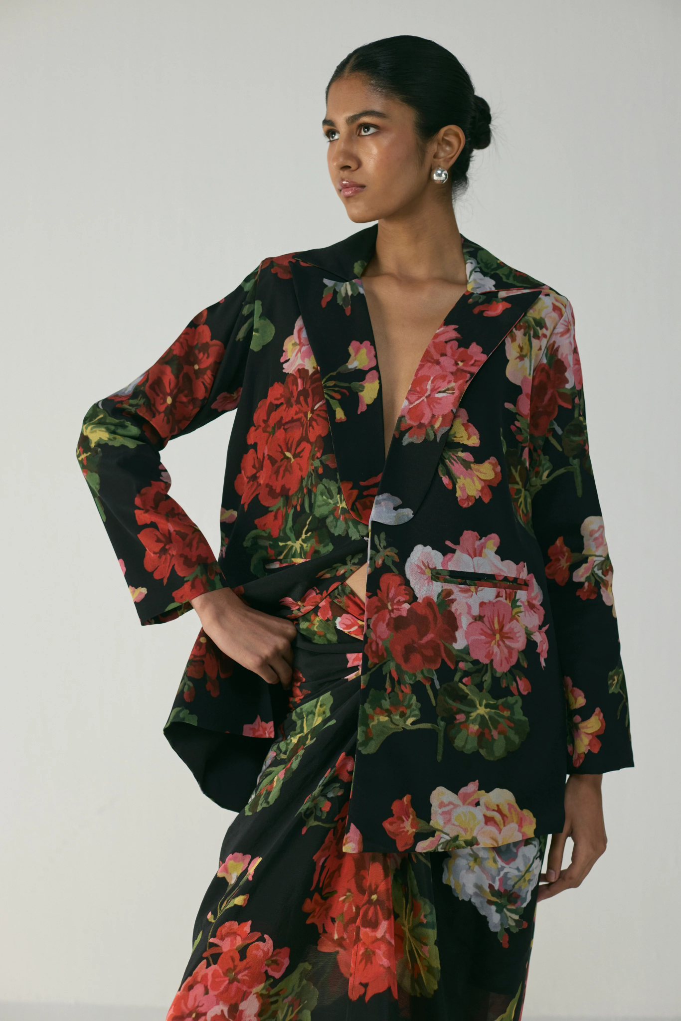 This statement Blazer and skirt set is a modern interpretation of floral elegance — crafted in luxurious crepe fabric for a smooth, fluid drape and polished finish. The set features a tailored floral blazer paired with a matching printed draped skirt, creating a striking balance of structure and softness.