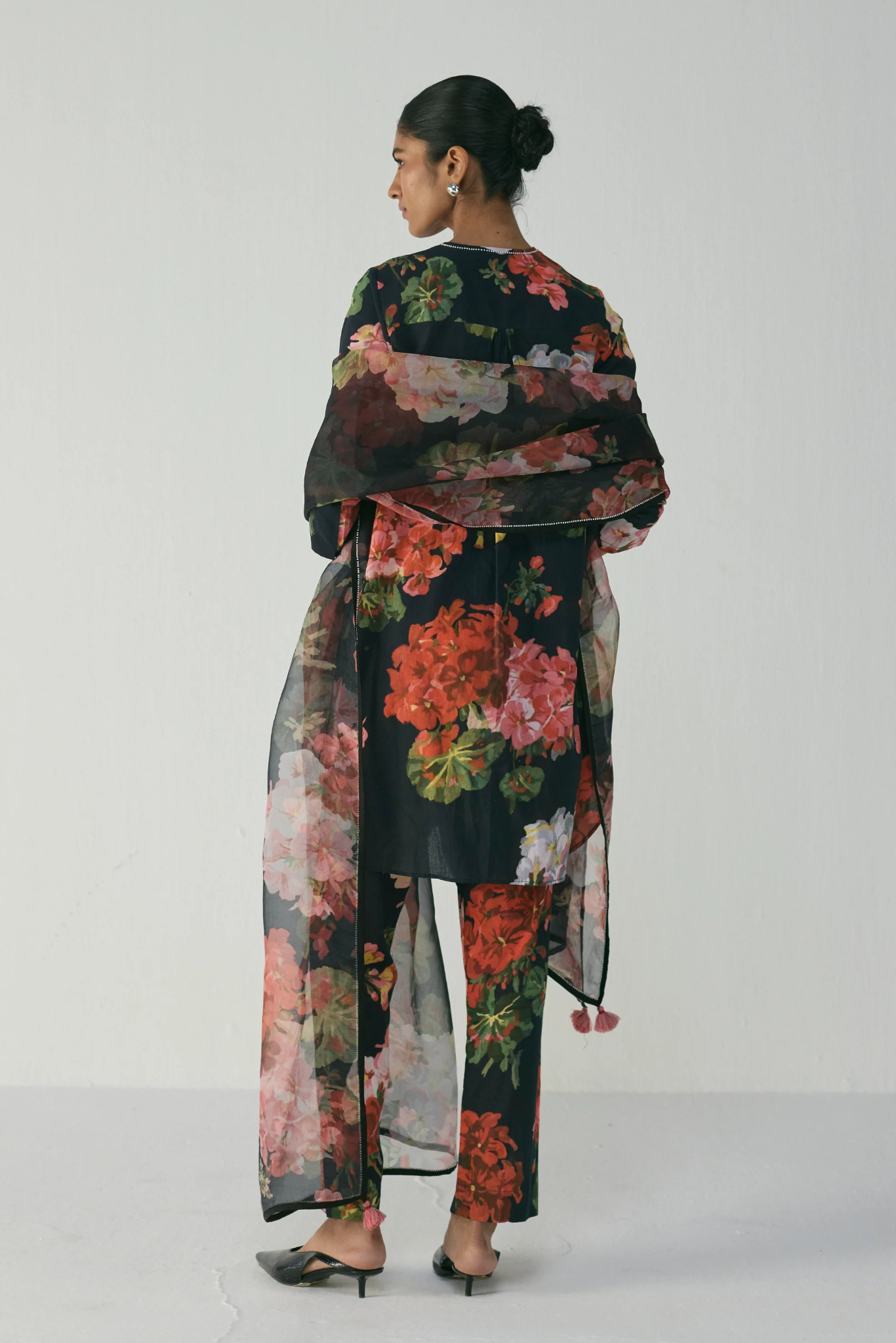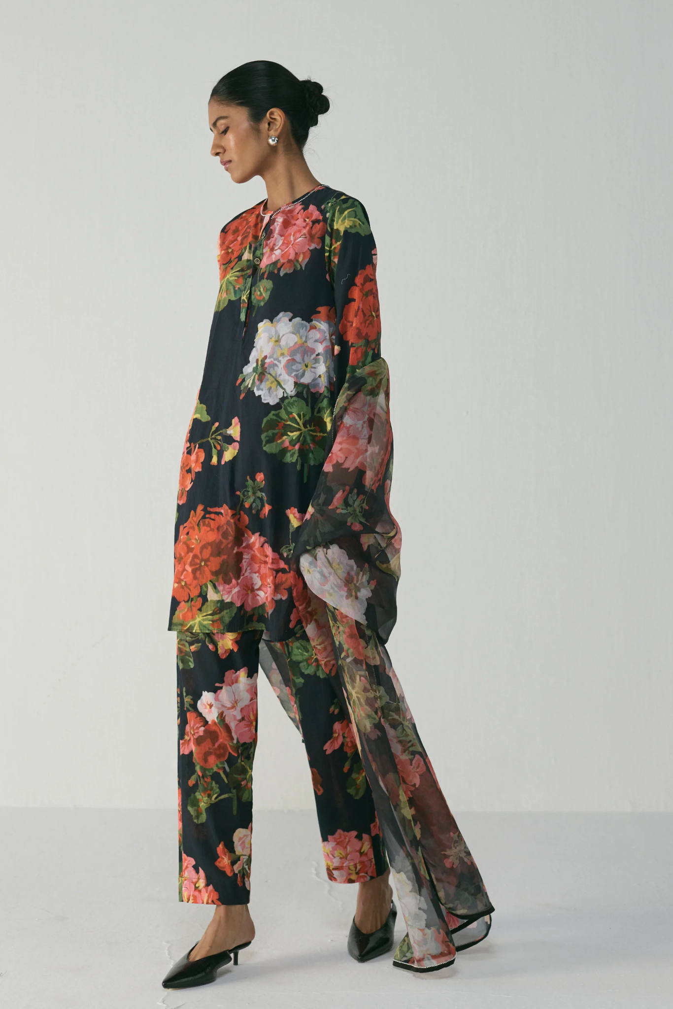 This striking floral kurta set showcases a bold play of blooms in vibrant red, blush, and green hues against a deep black base. Crafted in soft crepe fabric, it offers a fluid drape and effortless sophistication. The kurta features a straight silhouette with a round neckline, front hidden placket and full sleeves for a clean, contemporary look. Paired with matching straight pants, this set combines comfort and elegance seamlessly. The rich botanical print lends a timeless charm that’s perfect for day events or evening gatherings.