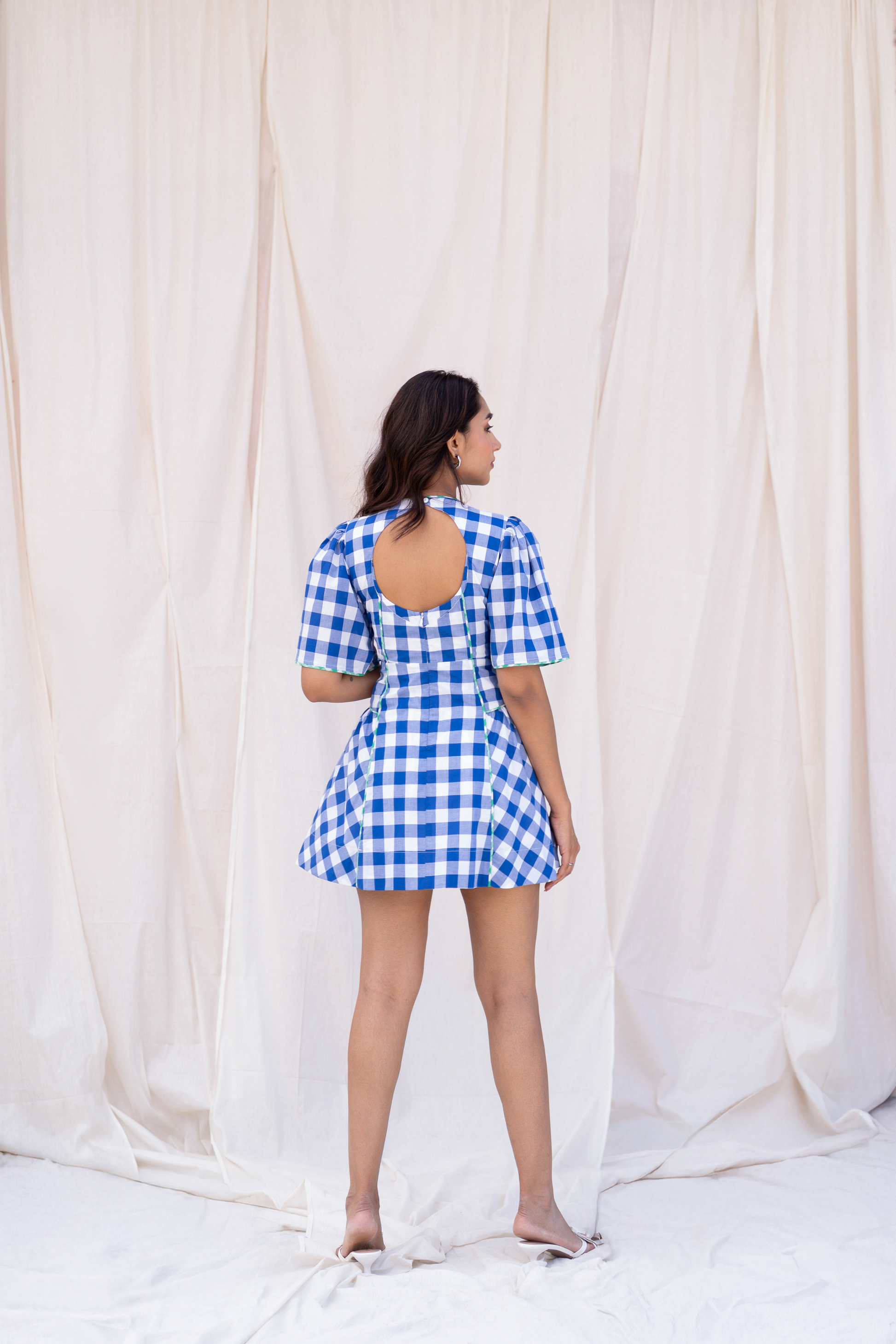 Add a playful edge to your wardrobe with this blue checks short dress featuring a chic heart cut-out. Perfect for day outings or weekend getaways, it blends comfort with standout style.
