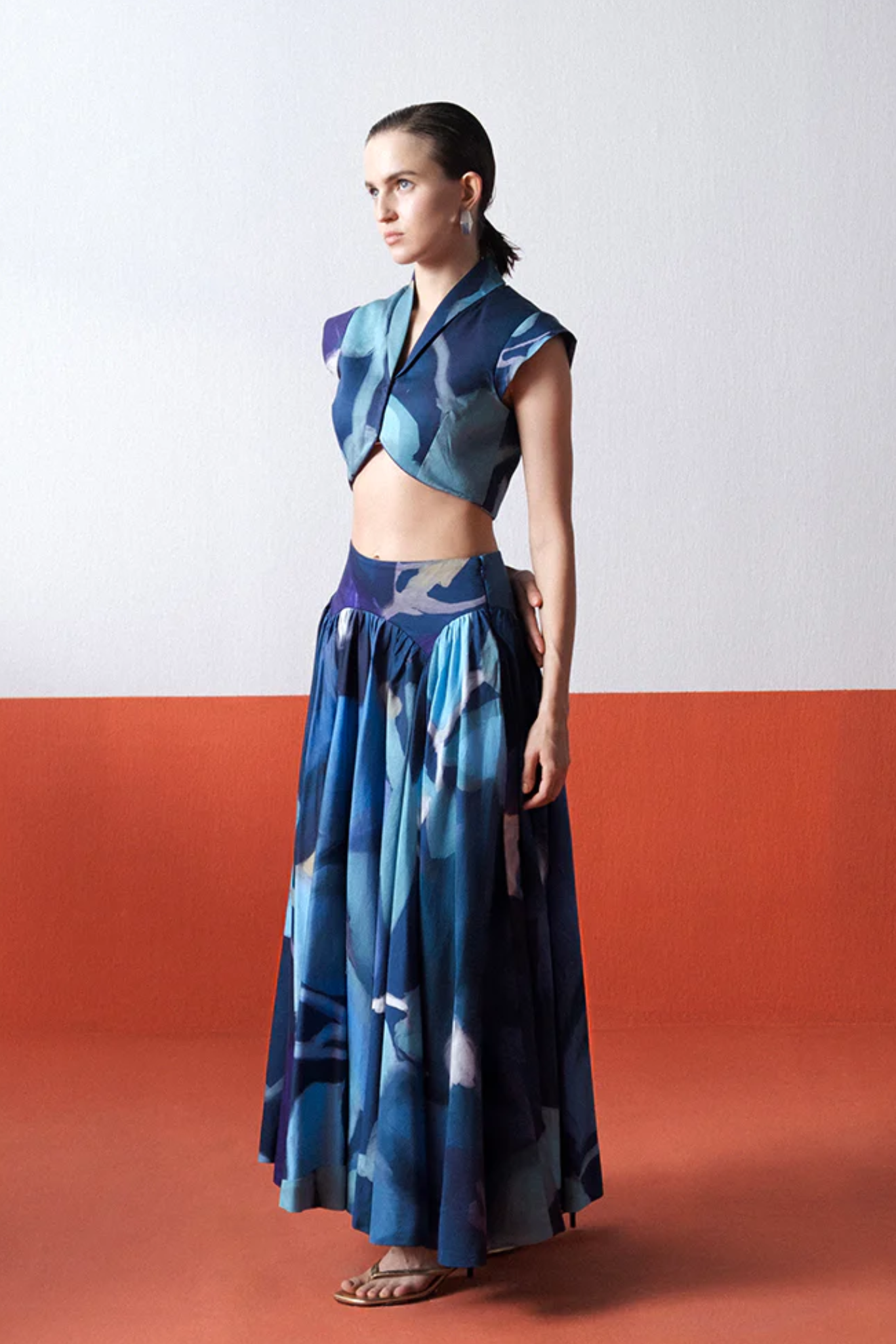 The cropped blouse showcases a sculpted silhouette with a collared neckline, front overlap detail, and cap sleeves — adding a bold, feminine edge. It pairs effortlessly with the voluminous gathered skirt that flows gracefully with every movement, crafted in a lightweight, breathable Cotton satin fabric that ensures ease and comfort.