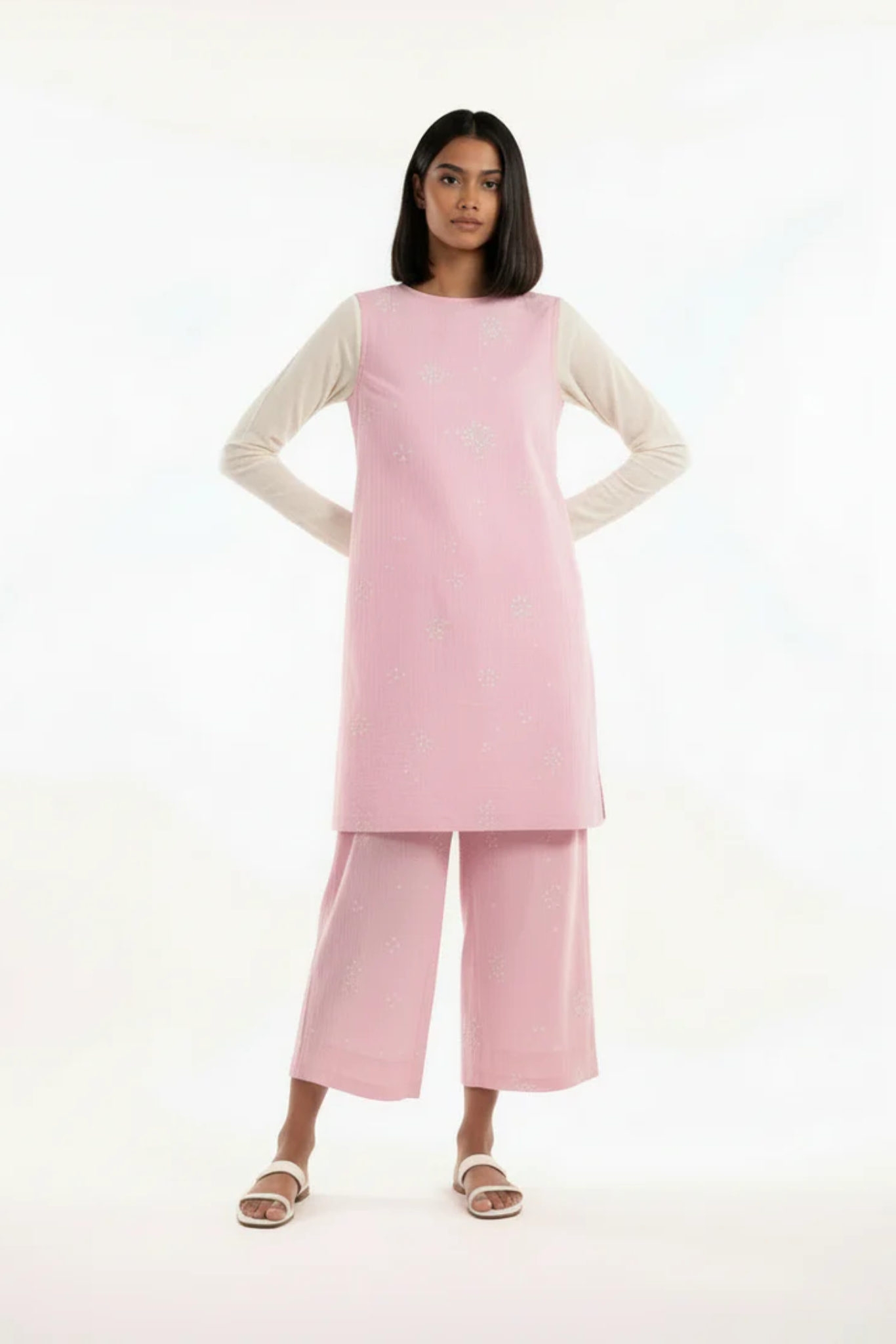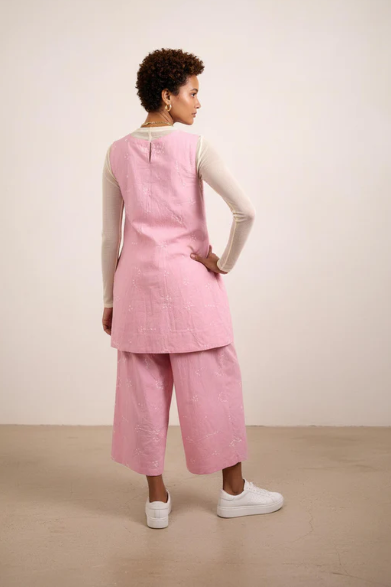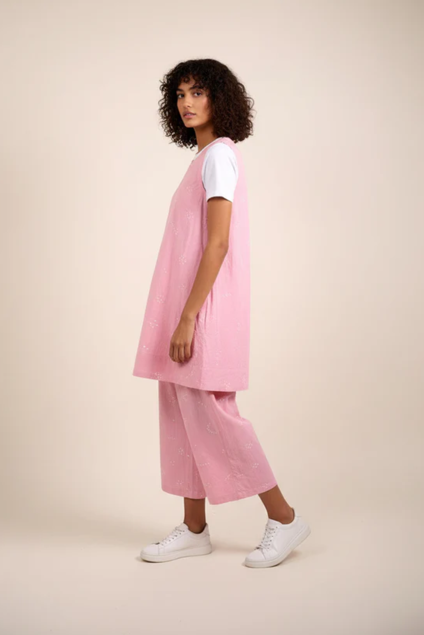A soothing co-ord set in naturally dyed pink organic cotton, featuring a relaxed A-line bandhani dress paired with easy-fit pants. The dress is detailed with side pockets and a loop-button neckline, offering effortless comfort and ease of movement. The pants are designed with front pleats and a drawstring at the back for an adjustable fit, complementing the fluid silhouette of the dress.