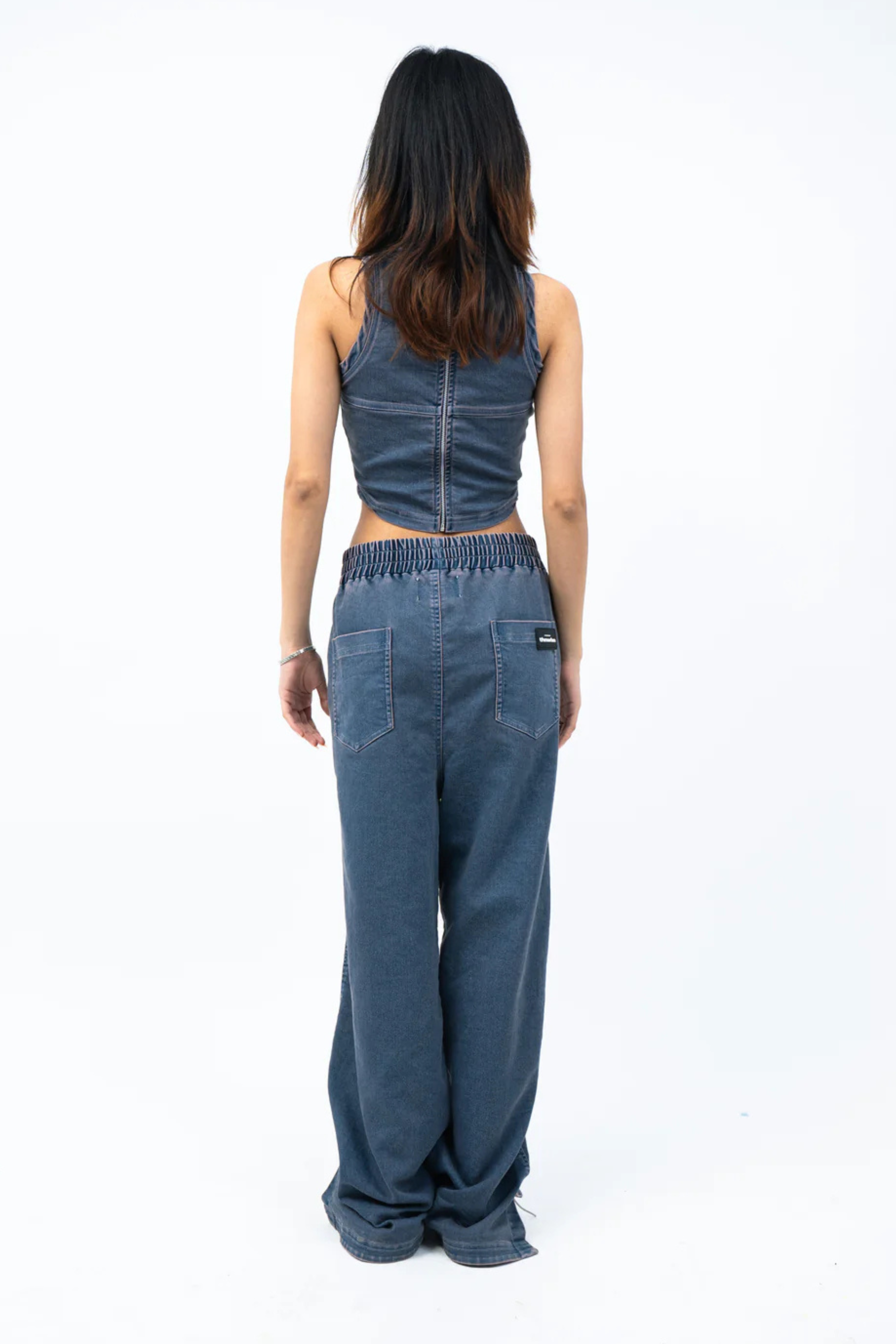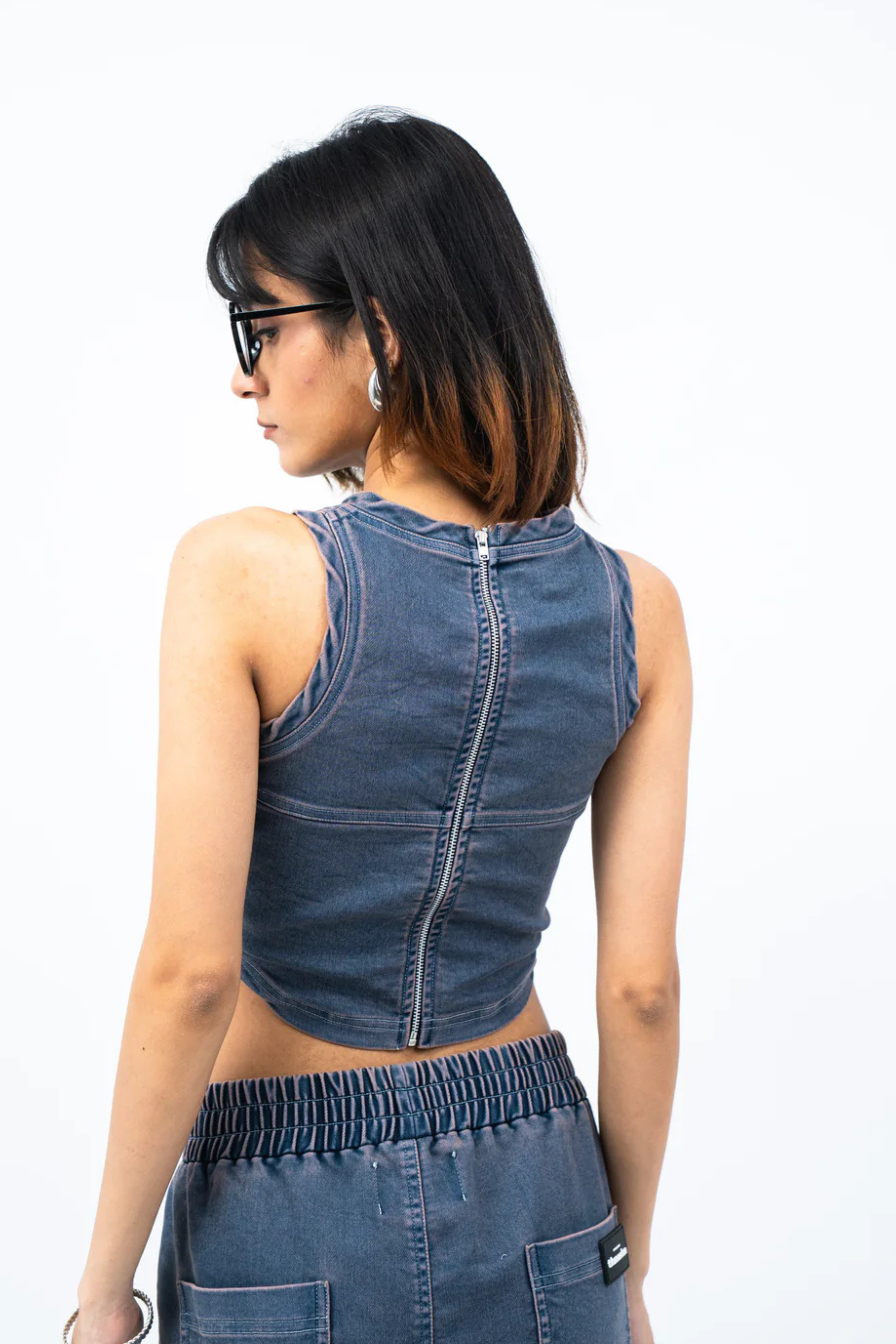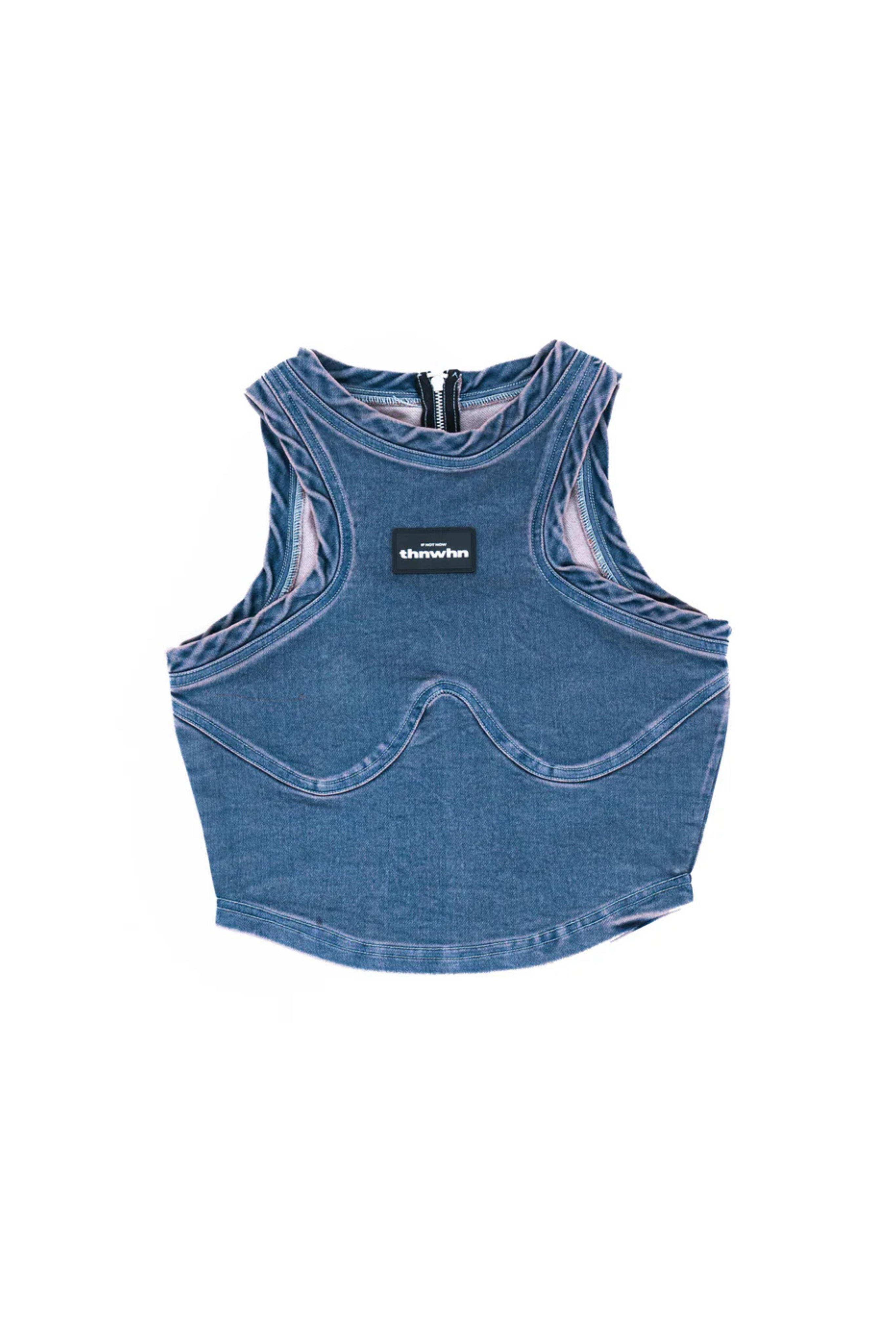 Crop Top Product Description Fitted crop top featuring a unique halter neckline and corset panelling along chest. It is made in a super comfortable knitted denim fabric dyed in a blue and subtle pink colour through acid wash technique perfect for summer. Signature branding on chest with metallic zipper fastening at the back. Product Code PTTHN074