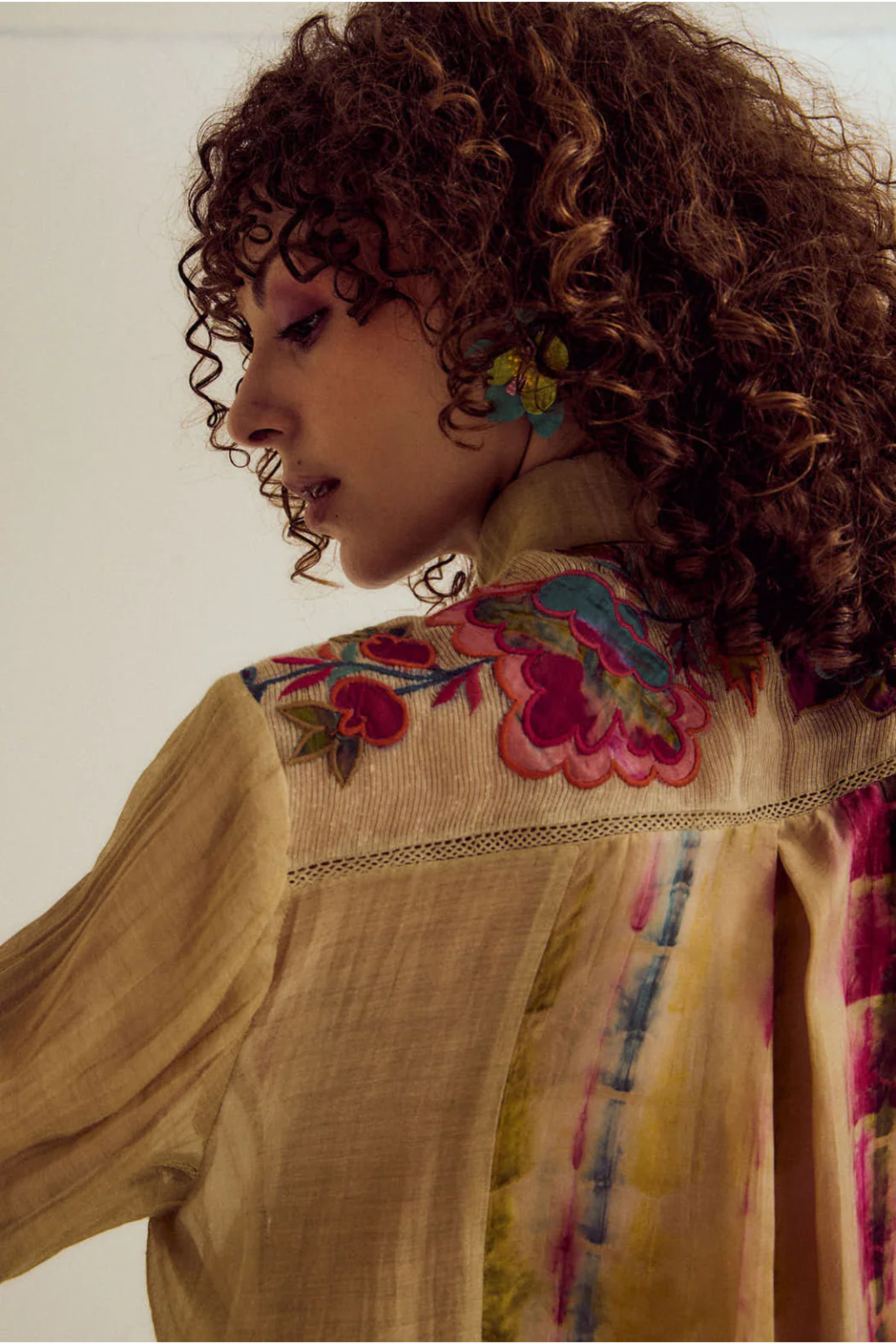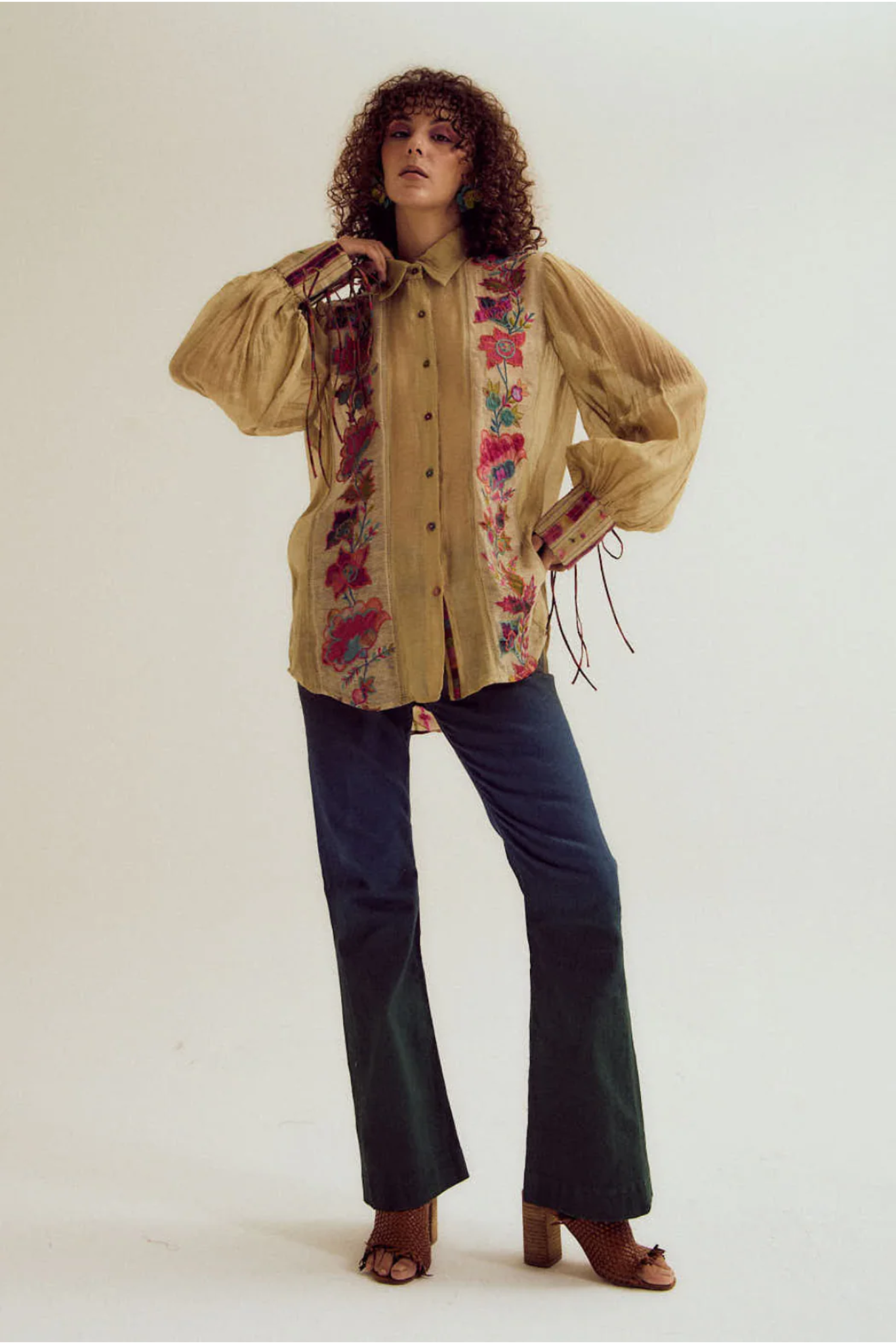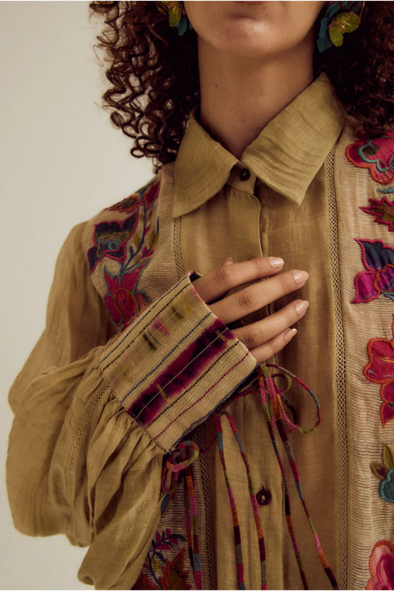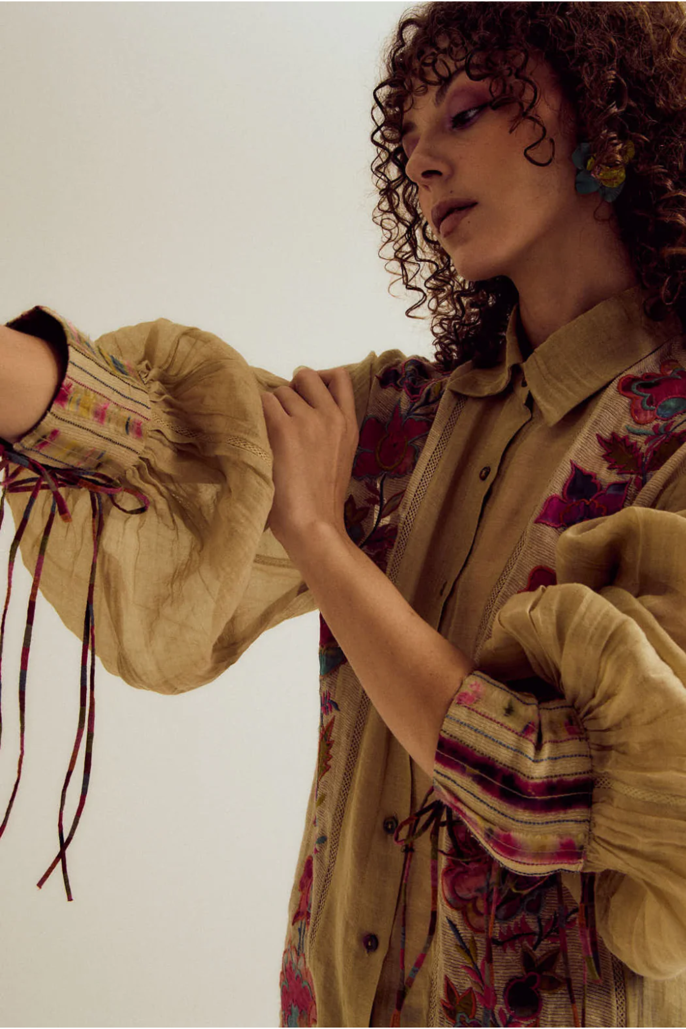 A refined front-open shirt in soft ecru, featuring delicate embroidered panel detailing that adds subtle texture and charm. Designed with gathered sleeves and finished with multi-string tie-knot cuffs, it blends artisanal detailing with modern ease - perfect for both statement and everyday styling.
