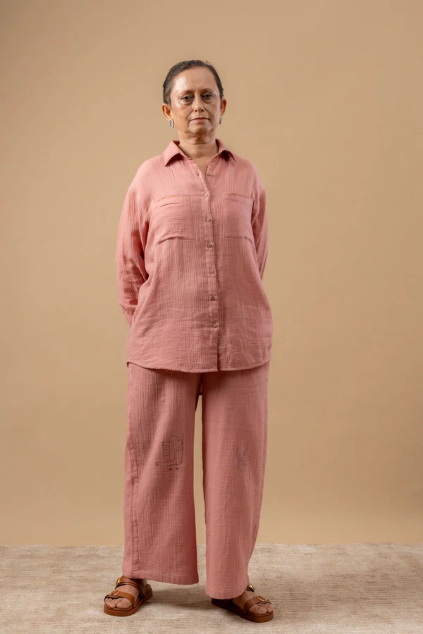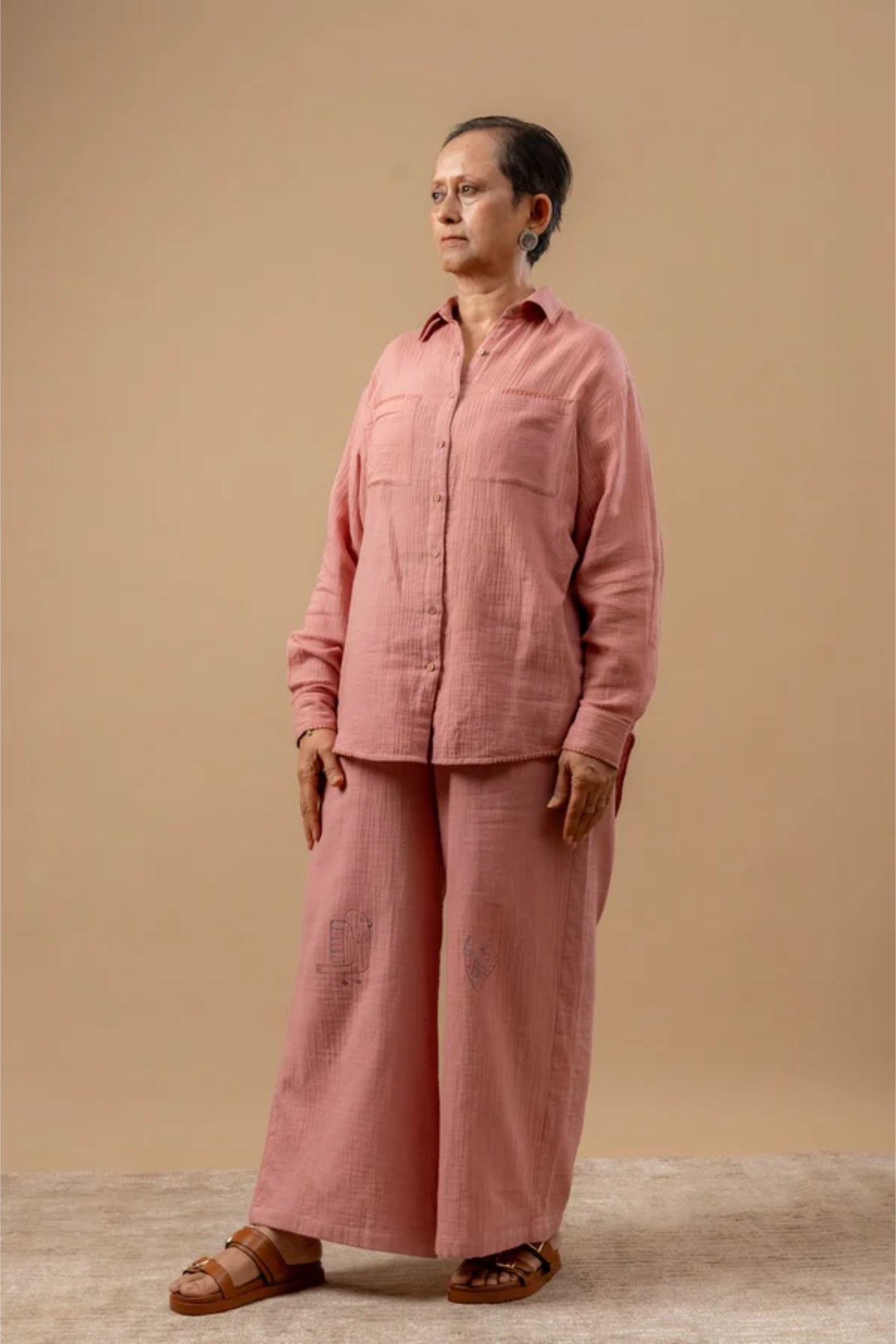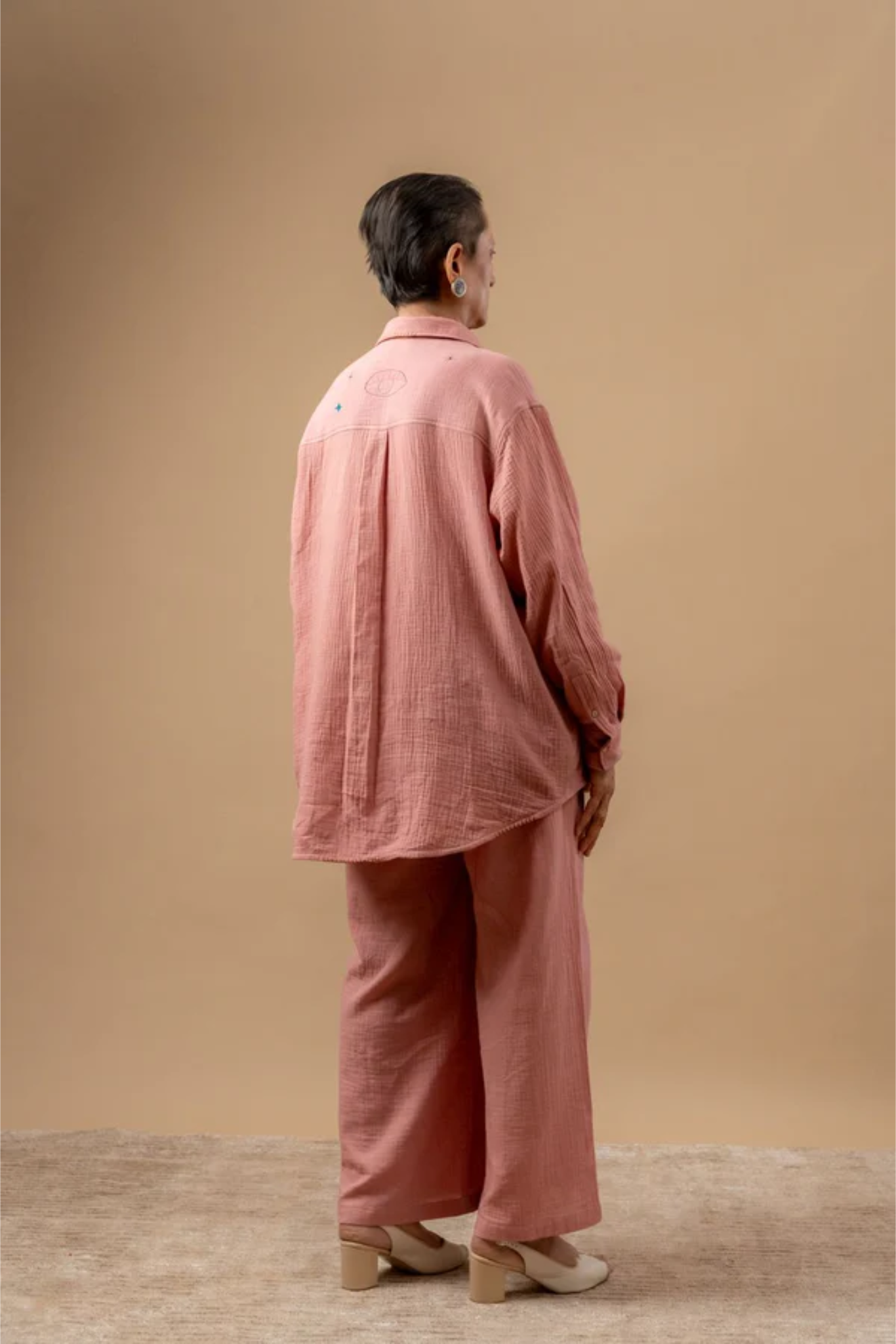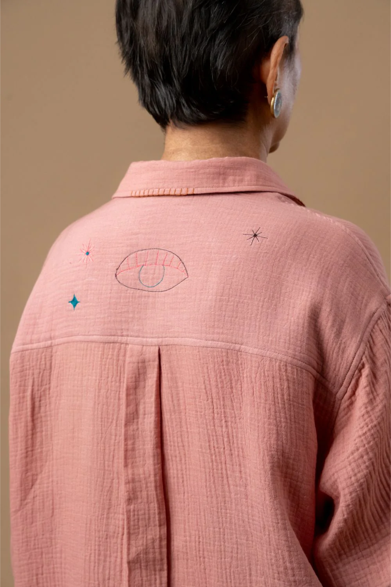 Oversized organic cotton shirt featuring a double collar and randomly placed doodle embroidery with details on the collar, pocket, and hem.