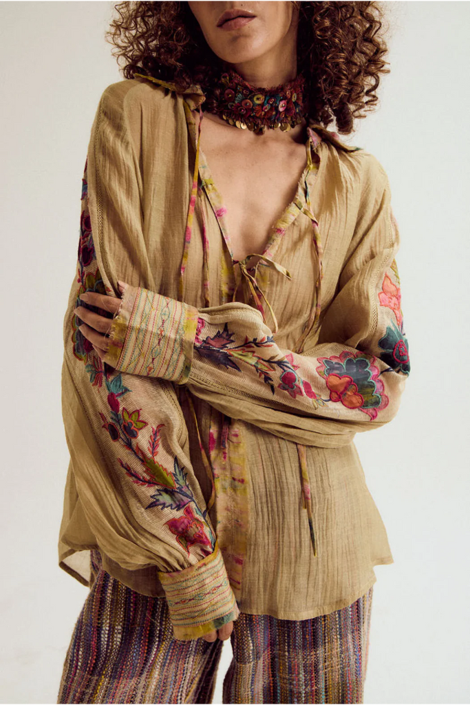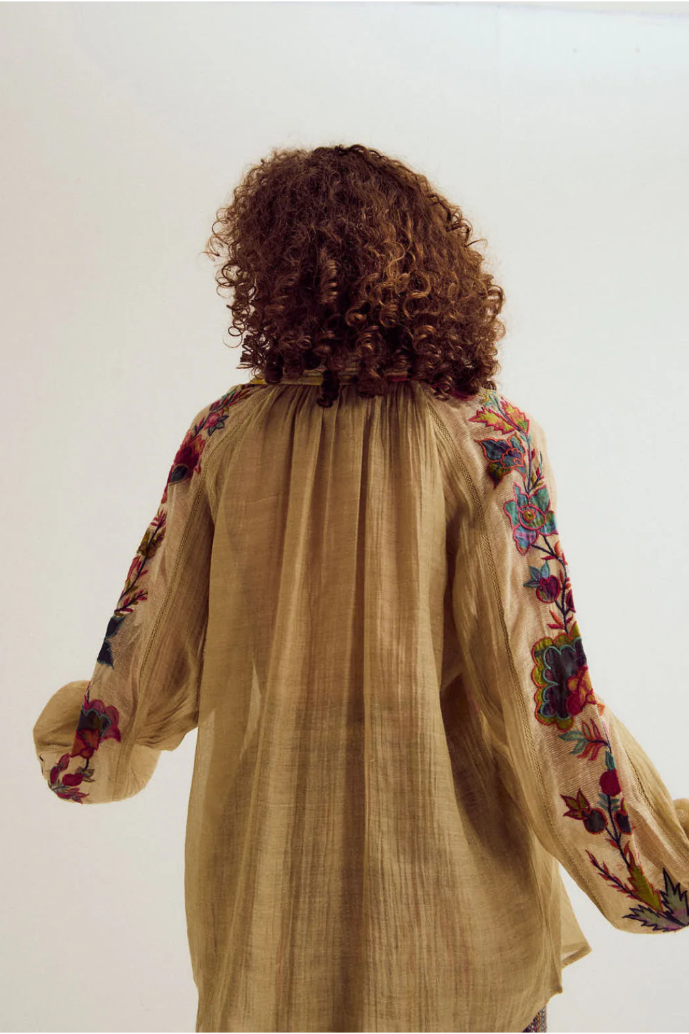 An elegant silk shirt with a subtle jute texture, featuring raglan sleeves for a relaxed drape. The design is elevated with an intricately embroidered collar and cuffs, blending artisanal detail with timeless sophistication. Perfect for pairing with tailored bottoms or flowing skirts for versatile day-to-night wear.