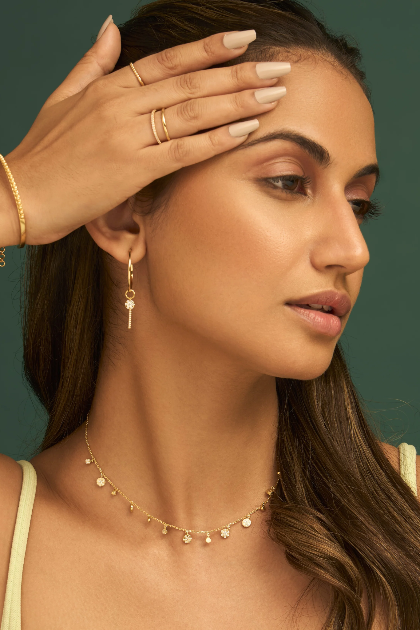 Introducing our Circe Dangle Necklace where each piece features a mesmerizing array of dangling round charms, varying in size and adorned with both sparkling CZ stones and sleek metal accents. Alluring and elegant, this necklace adds a touch of magic to any ensemble.