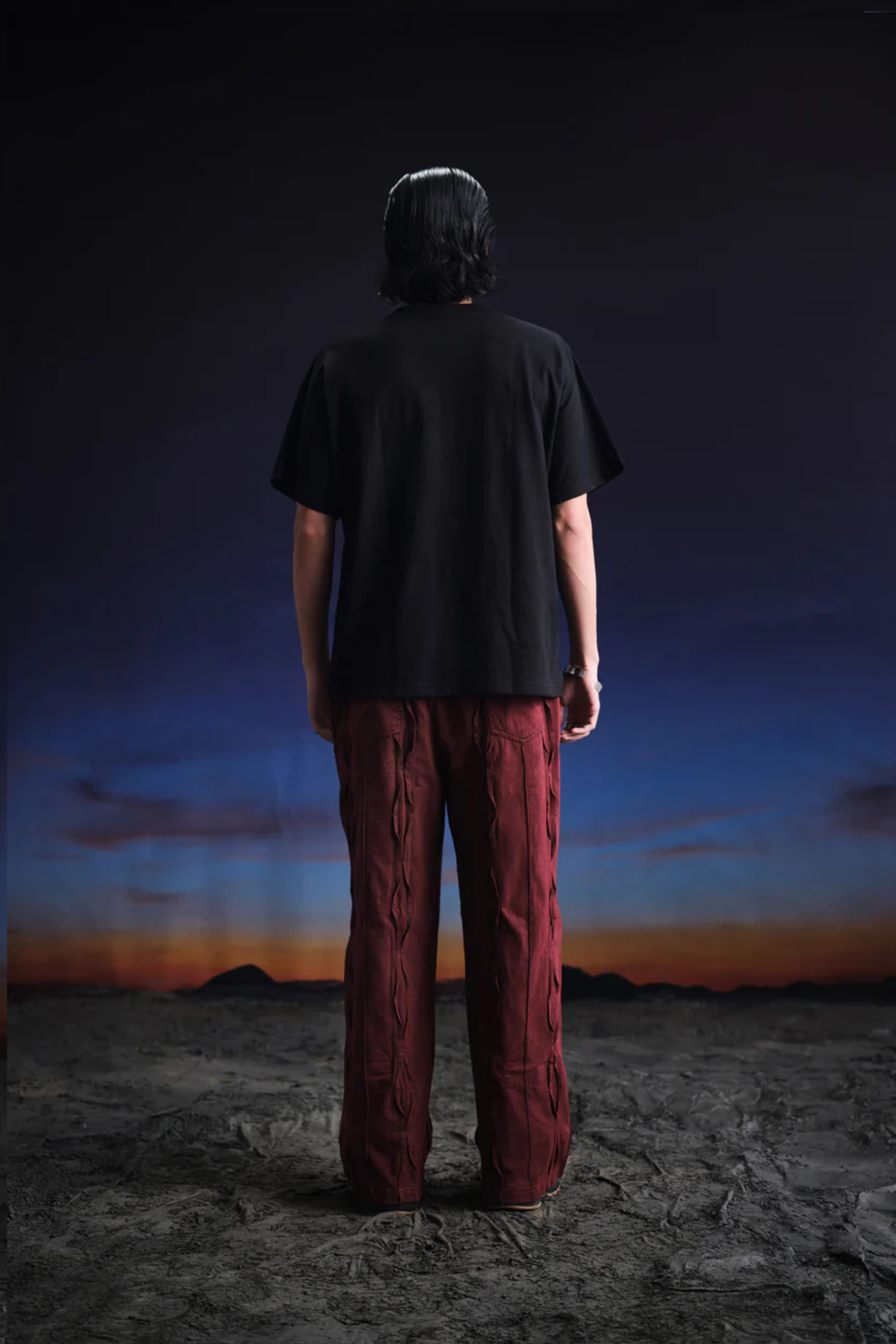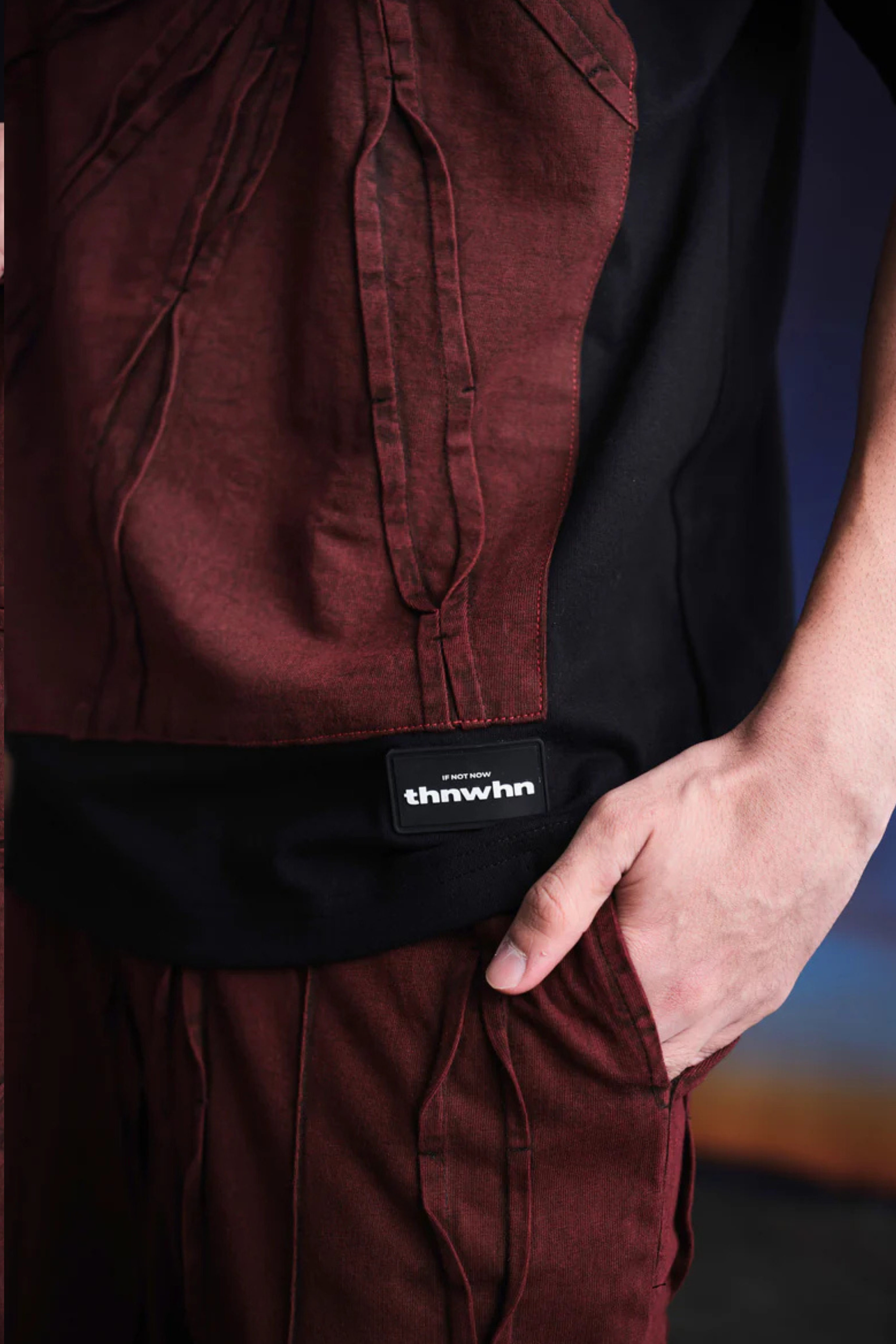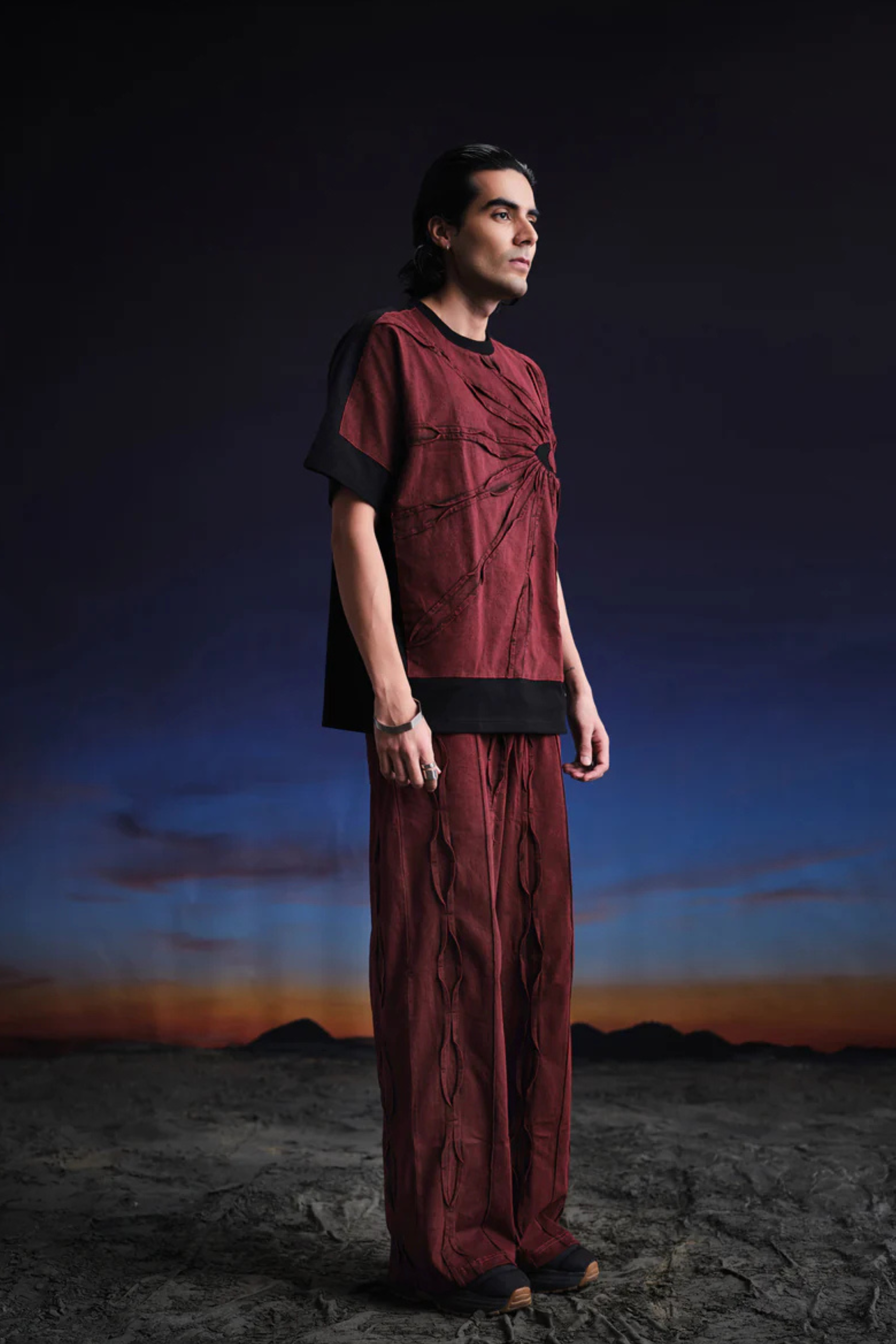 Inspired from the feelings of Awakening, this tshirt features an eye shaped panel on chest with precisely constructed pin tucks and wave tucks emerging as sun rays spreading all over. Each pin tuck is carefully placed and tucked in specific directions to form the seamless pattern. The panel is acid washed in a deep red colour that brings contrast and highlights the details. Once patched on top of a black tee, everything comes together with signature branding at hem. Product Code