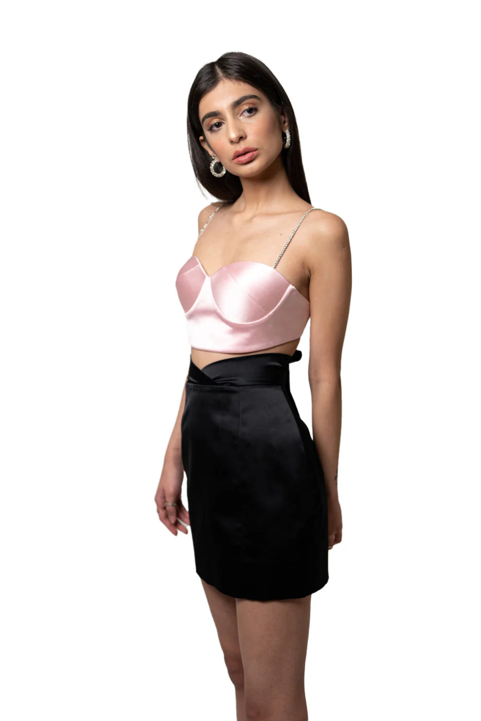 A cropped corset made out of satin. Featuring hook & eye opening at the back, crystal straps & padded cups for that extra boost. Fit