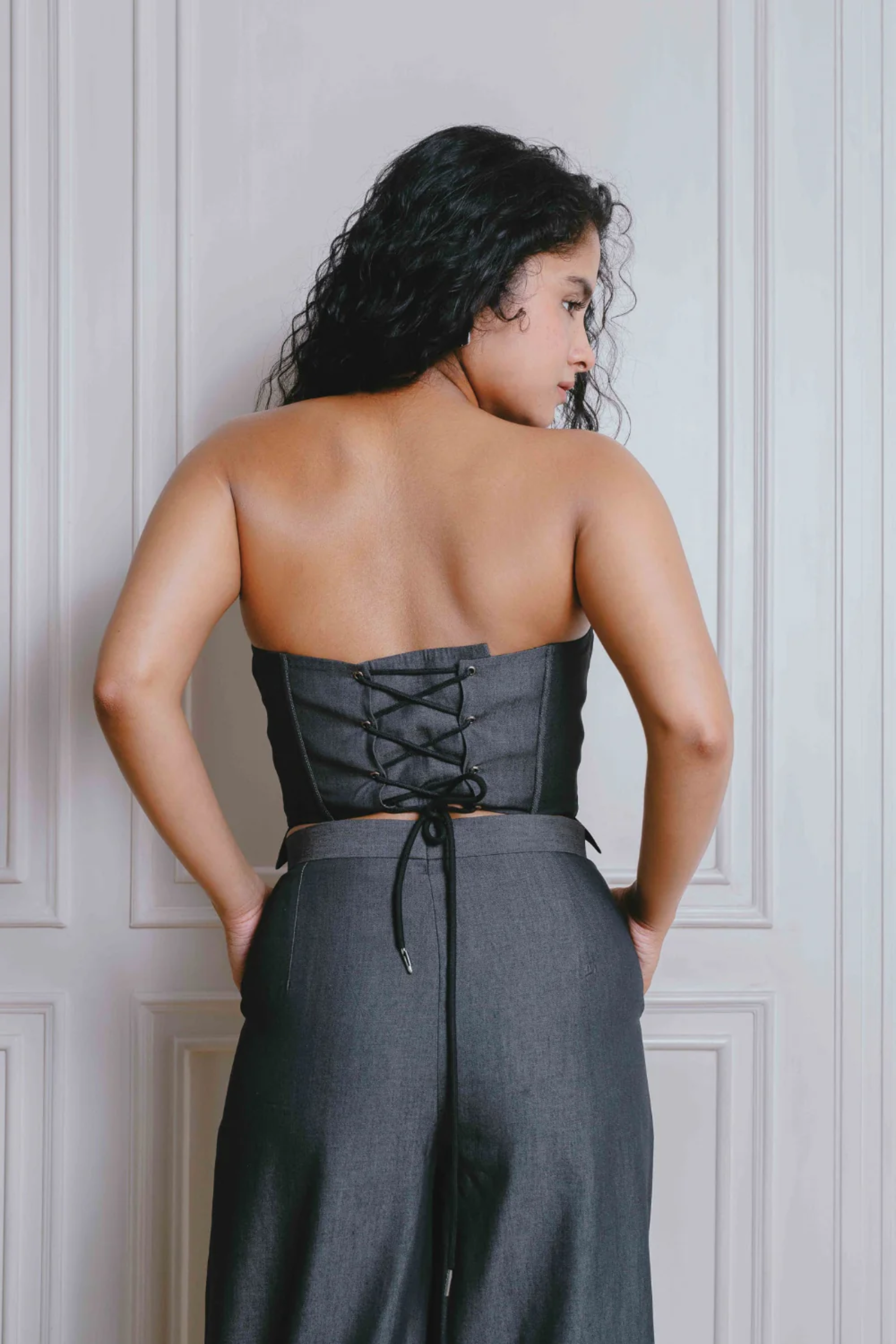 Wide-legged trousers crafted in denim, featuring front 1/4-inch pleats and functional pockets for added ease. Product Code