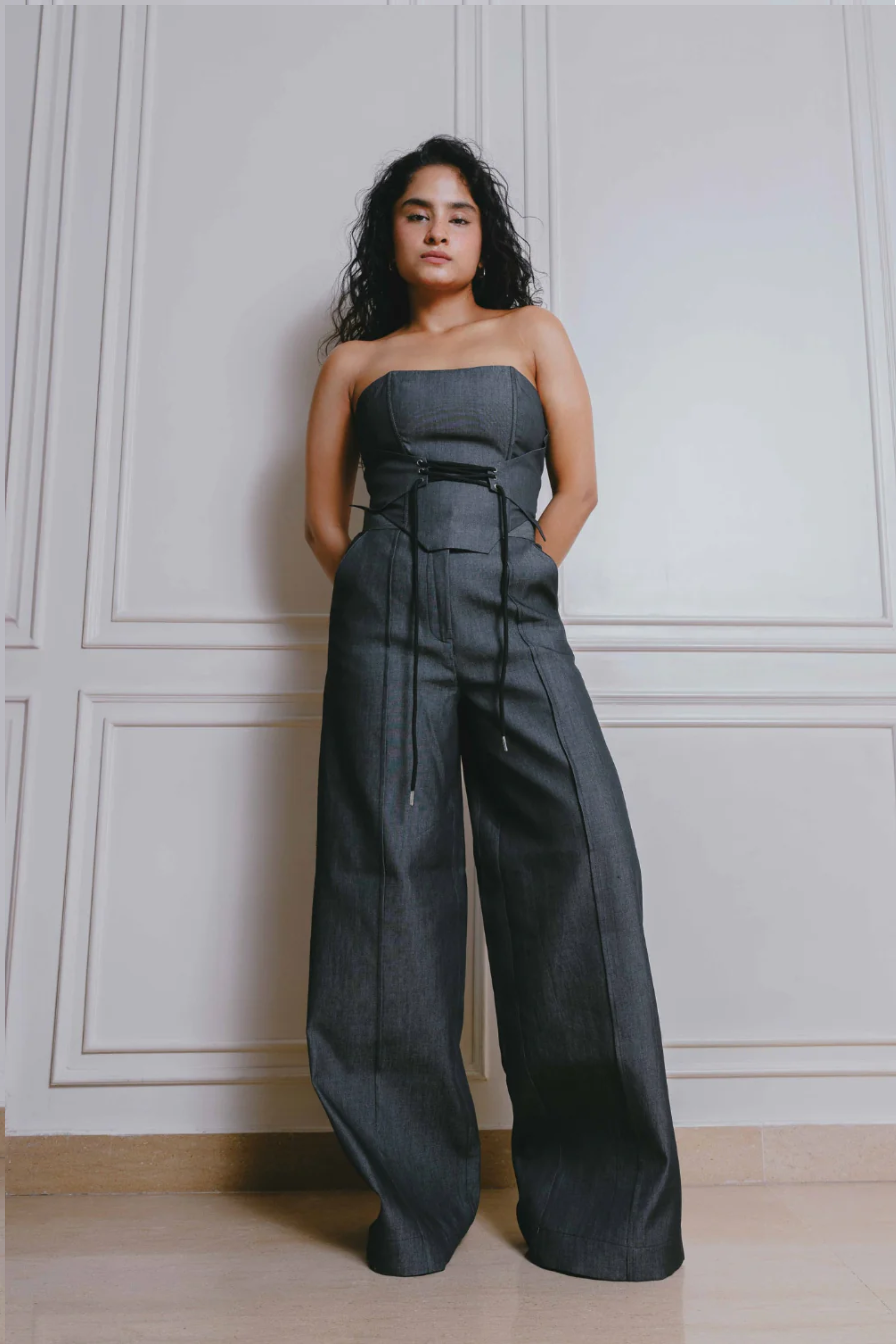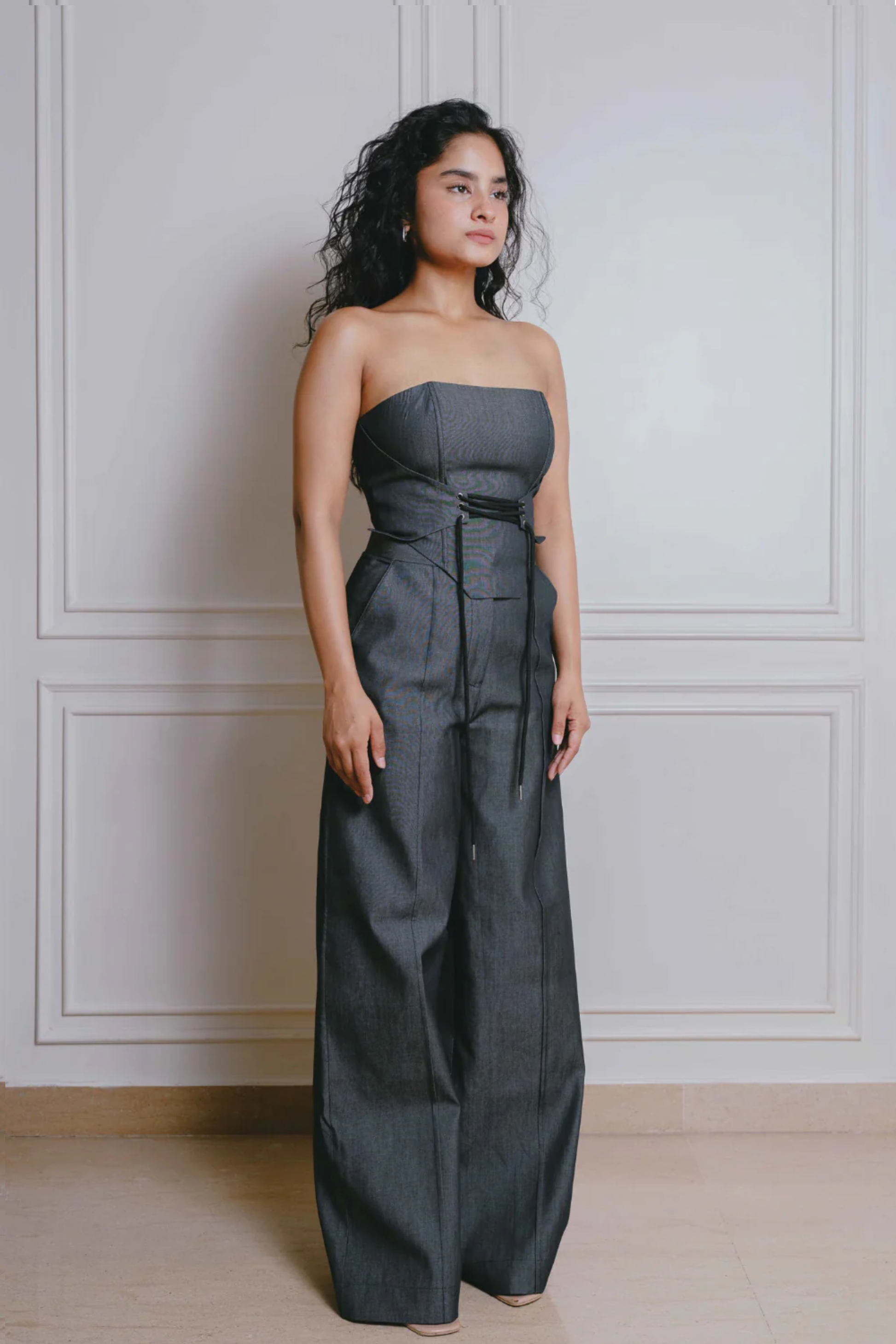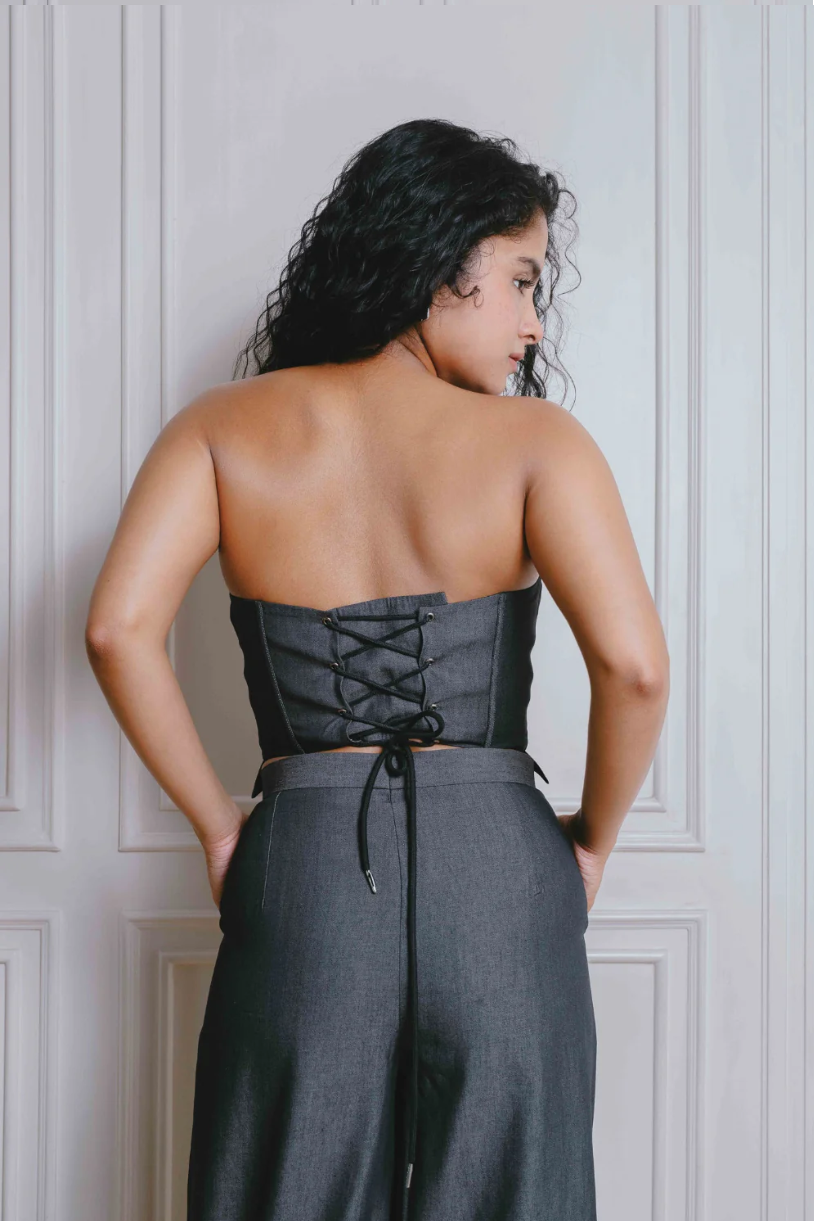 Corset top cut in Denim Fabric. Structured with internal boning and adorned with two panels and a contrast drawstring detail at the front. Features an adjustable eyelet opening on the back for a perfect fit. Product Code