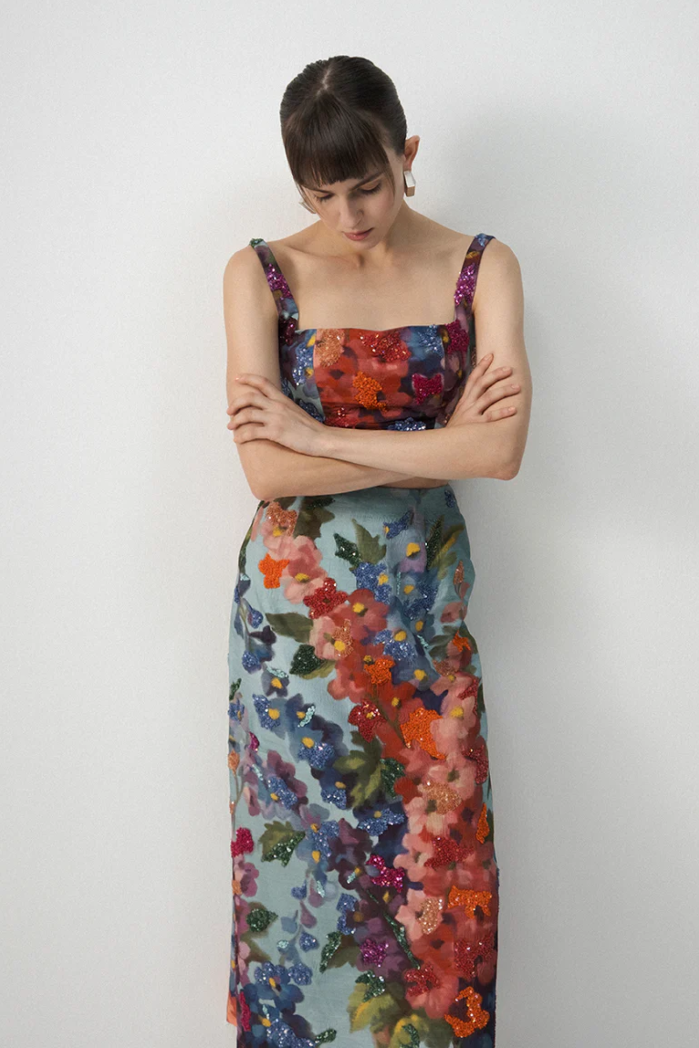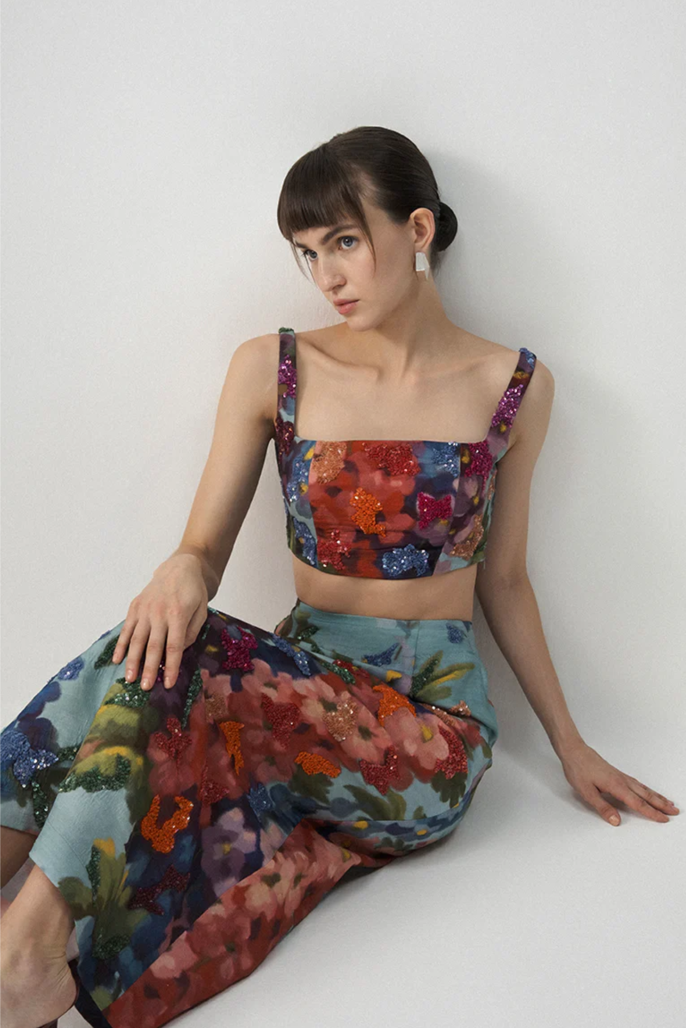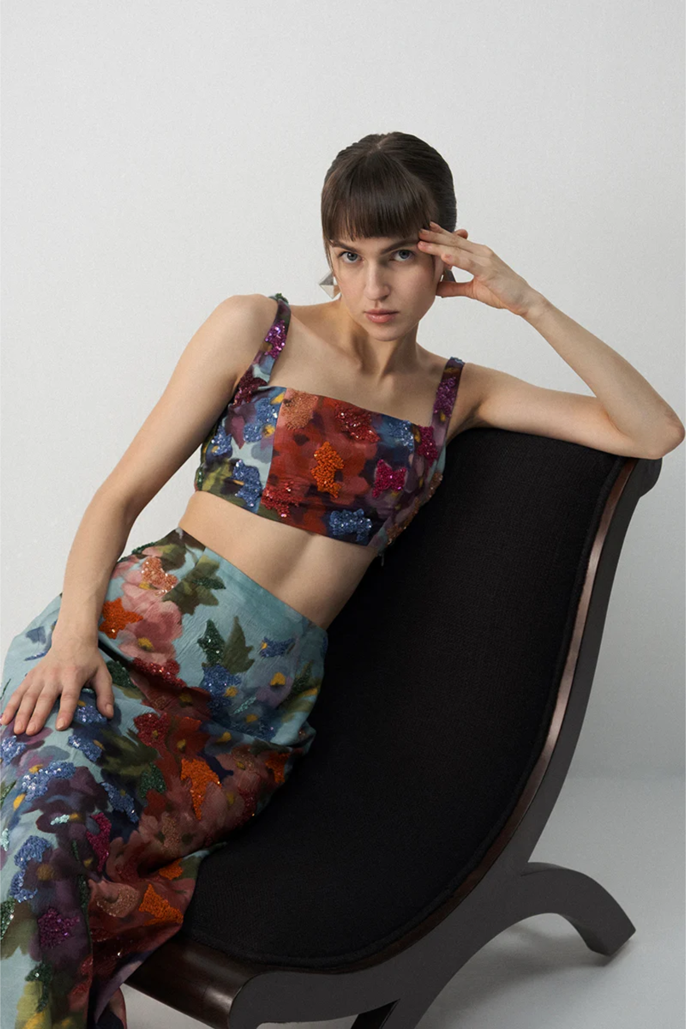 Featuring a structured cropped bustier top paired with a sleek straight-fit skirt, this ensemble celebrates fluid femininity through its vibrant floral artwork inspired by hand-painted botanicals. The digitally rendered blooms in shades of crimson, coral, indigo, and moss green cascade beautifully over a soft grey base, lending the outfit a sense of movement and visual depth.