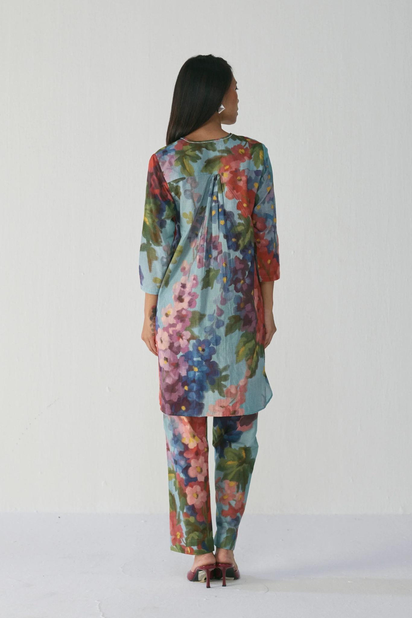 This Kurta is crafted from a cotton fabric , this ensemble features a straight-cut kurta and coordinated trousers, both adorned with an impressionist-style floral print in shades of jade, rose, violet, and moss. The kurta offers a relaxed silhouette with three-quarter sleeves and a minimal neckline with a concealed placket for a clean, elegant finish. The trousers mirror the botanical print, completing a seamless and graceful look.