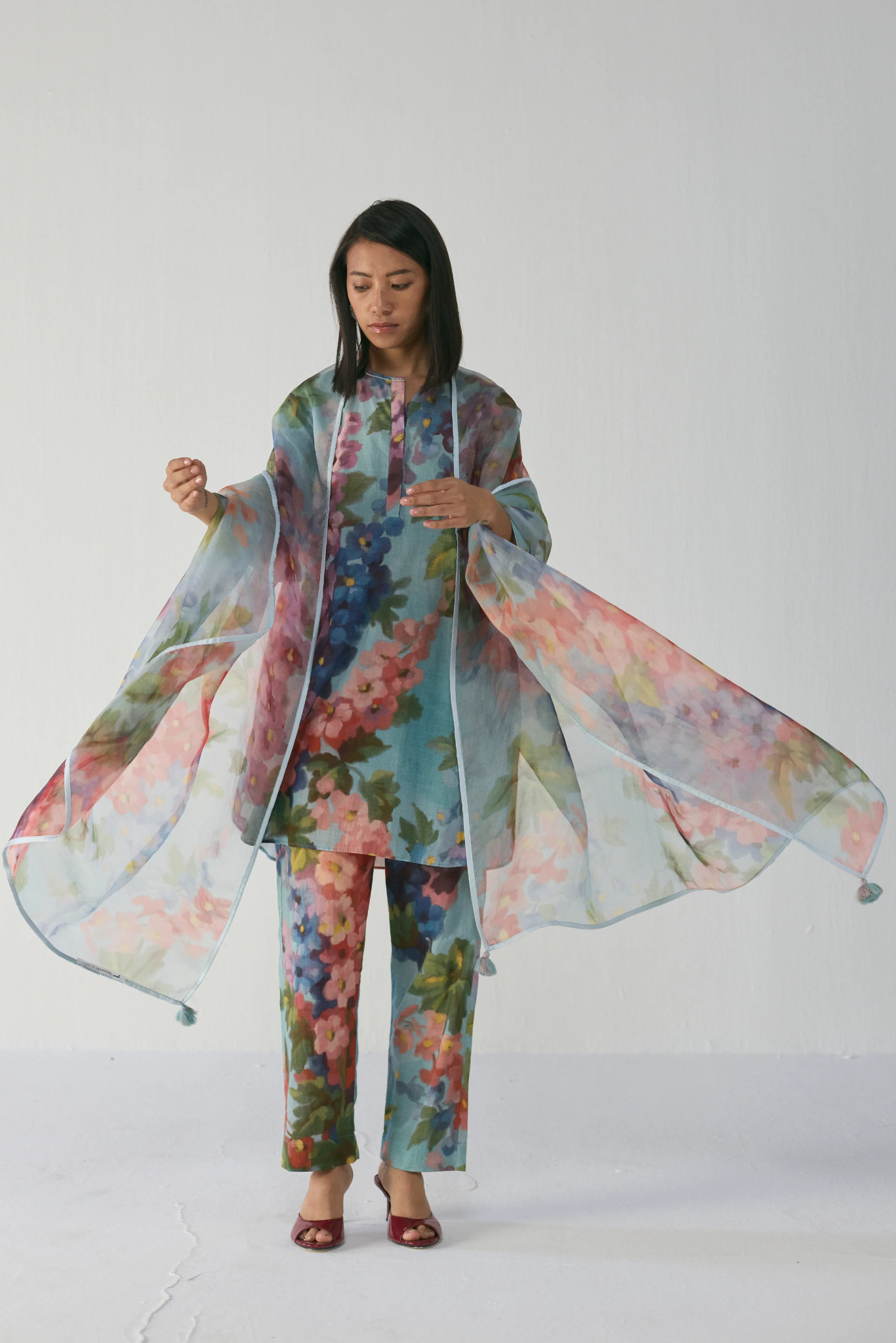 Elevate this set with strappy heels or block sandals and minimal gold jewelry for a refined, feminine statement. For festive occasions, style it with the matching Botanic Dream Dupatta for an airy, coordinated look. Keep makeup dewy and hair sleek to complement the lightness and painterly flow of the ensemble. Perfect for brunches, intimate celebrations, or artful evenings, the Botanic Dream Kurta Set blends comfort, sophistication, and creativity effortlessly.