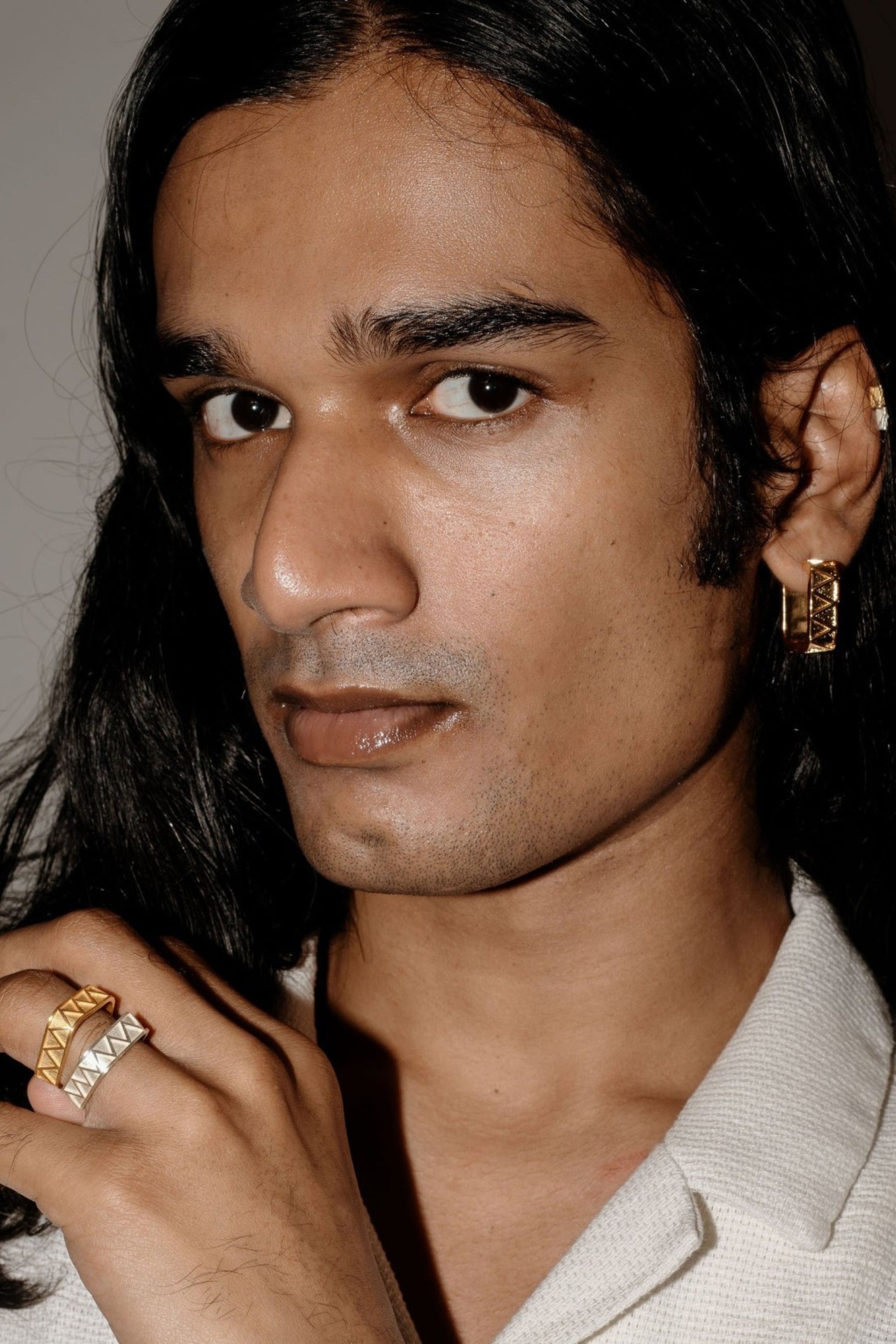 Rounded square ring with triangle detail. Handcrafted in Brass with 18k gold plating and rhodium plating.