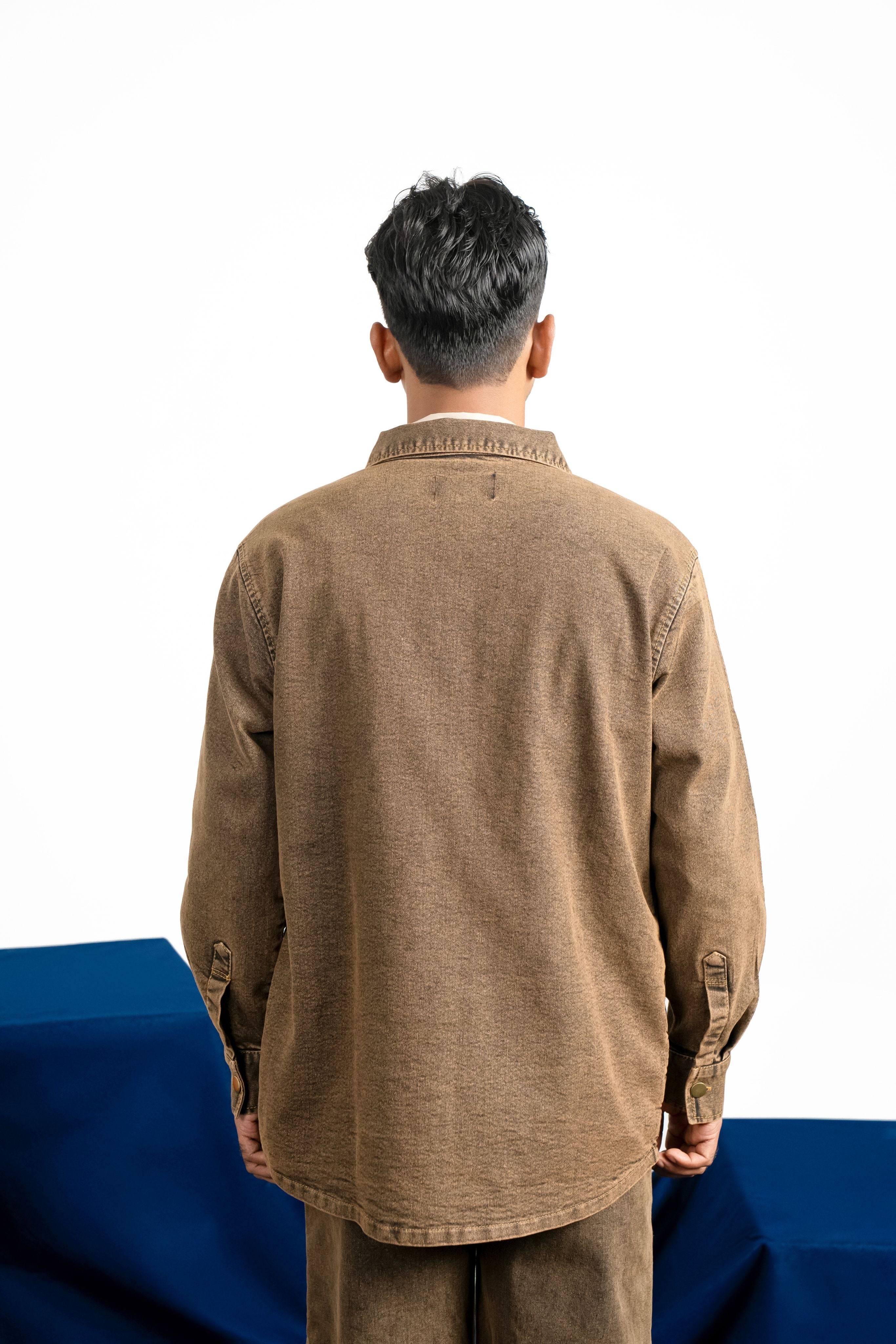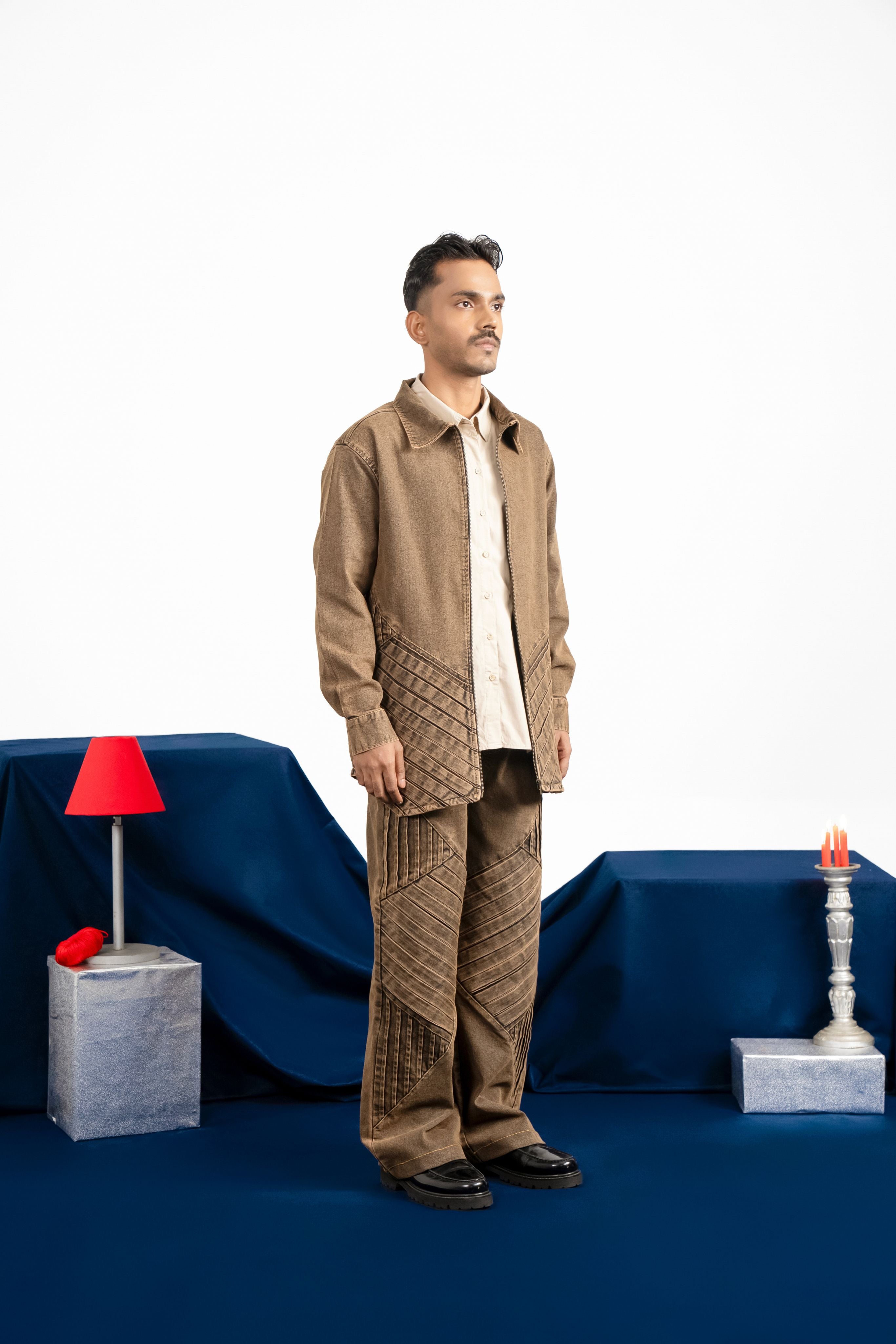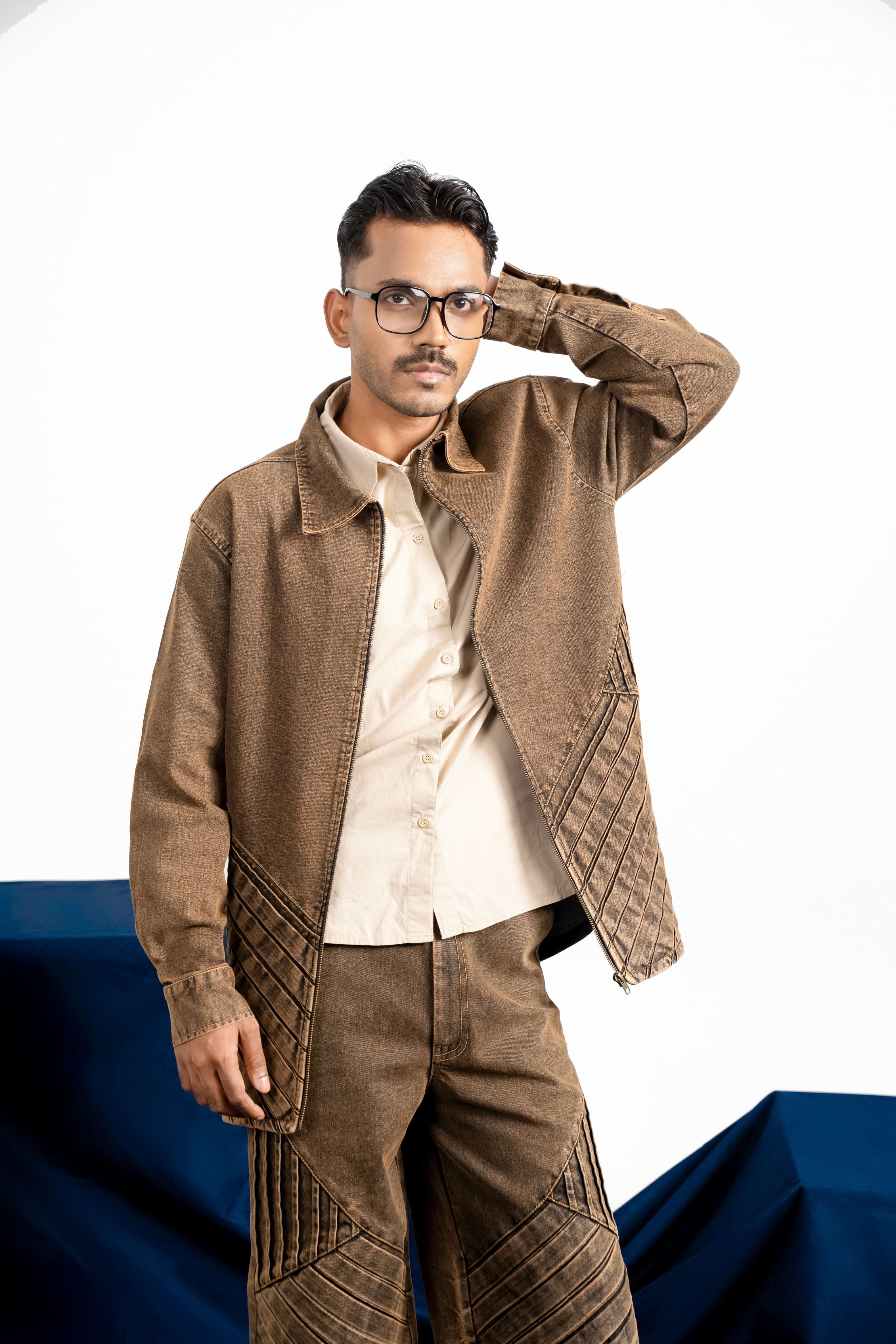 As the name suggests, this shirt symbolises a post apocalyptic world. It's a full-sleeve shirt crafted from our classic black denim fabric, washed and over-dyed in an orange brown shade. Our signature pleats and pintuck detail on it’s symmetric armour inspired panels takes it up a notch. Finished with antique open-ended zip at the front and buttons at the cuff that elevate this shirt.