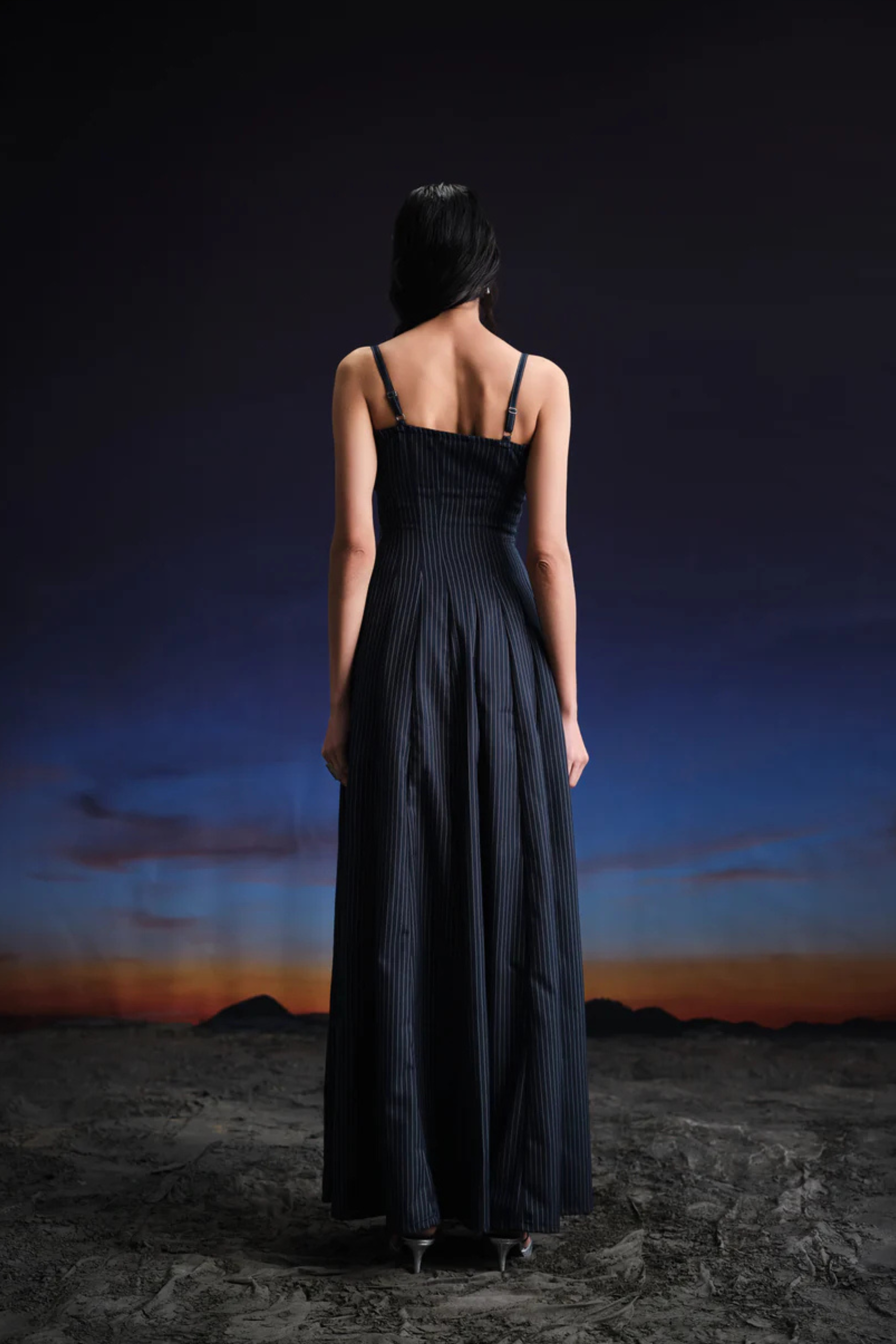 Product Type/Category Dress Product Description This full length, panelled a-line dress is crafted with a combination of classic navy blue pinstripe suiting fabric and light blue enzyme washed denim. The suiting fabric is representation of adulthood whereas denim reflects the ability to be fun and classic. On body it has thin straps with adjusters, a layered neckline and contrast lapel detail with overlapped denim panel on bust. An empire waistline skirt follows it to hem, with thin panels fitted at waist and flared at bottom, to give an A line shape. It is finished with a zipper at back. Product Code PTTHN045