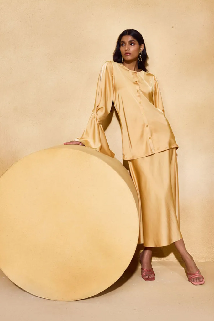Elegant, effortless, and elevated—the Echo Celine Co-ord Set is your go-to for understated sophistication. Crafted in a lustrous yellow satin, this two-piece set features a relaxed-fit top with soft tailoring and flared, gathered sleeves that add a romantic flair.