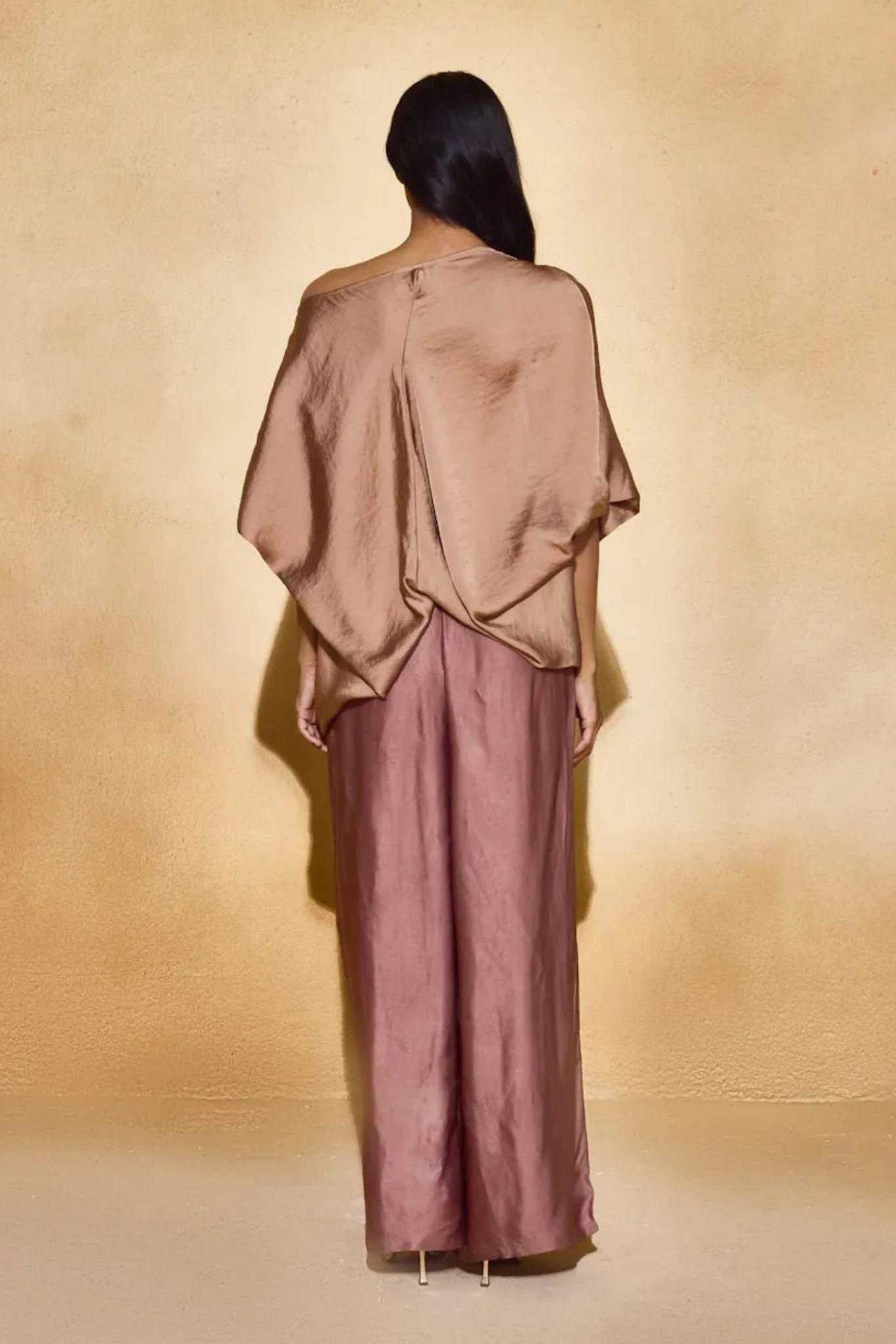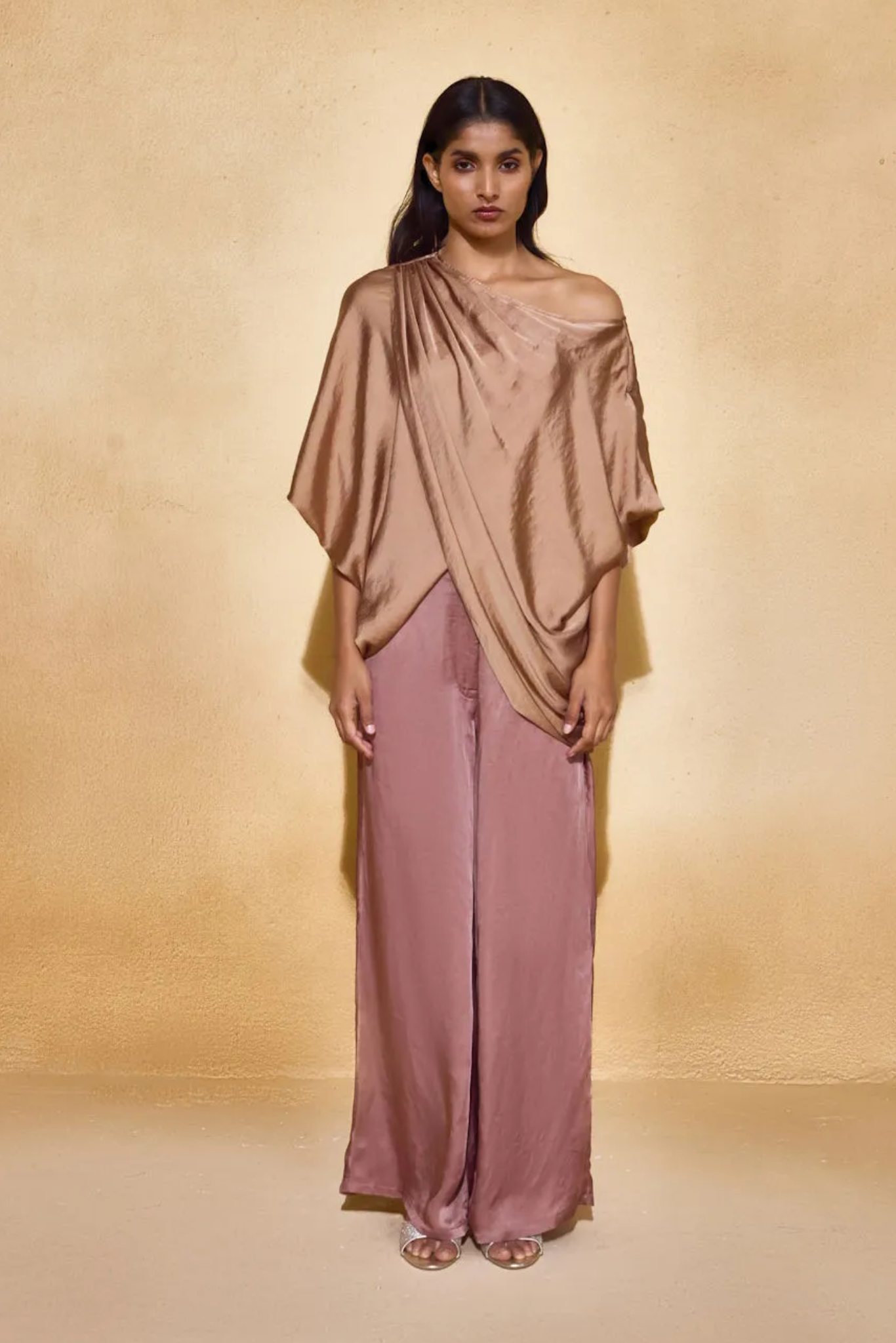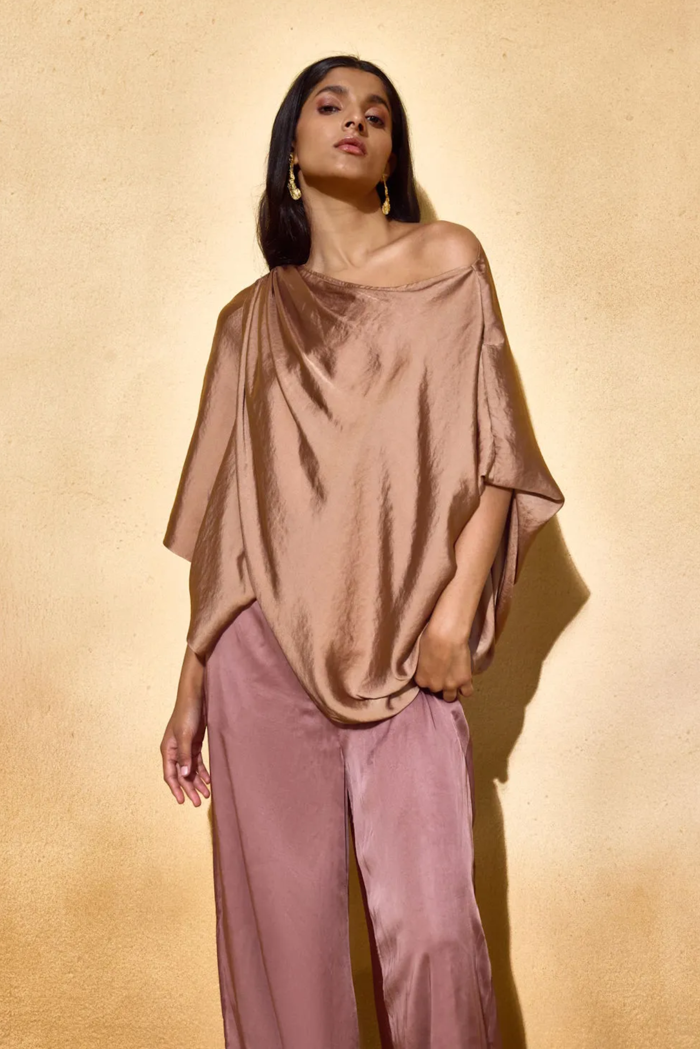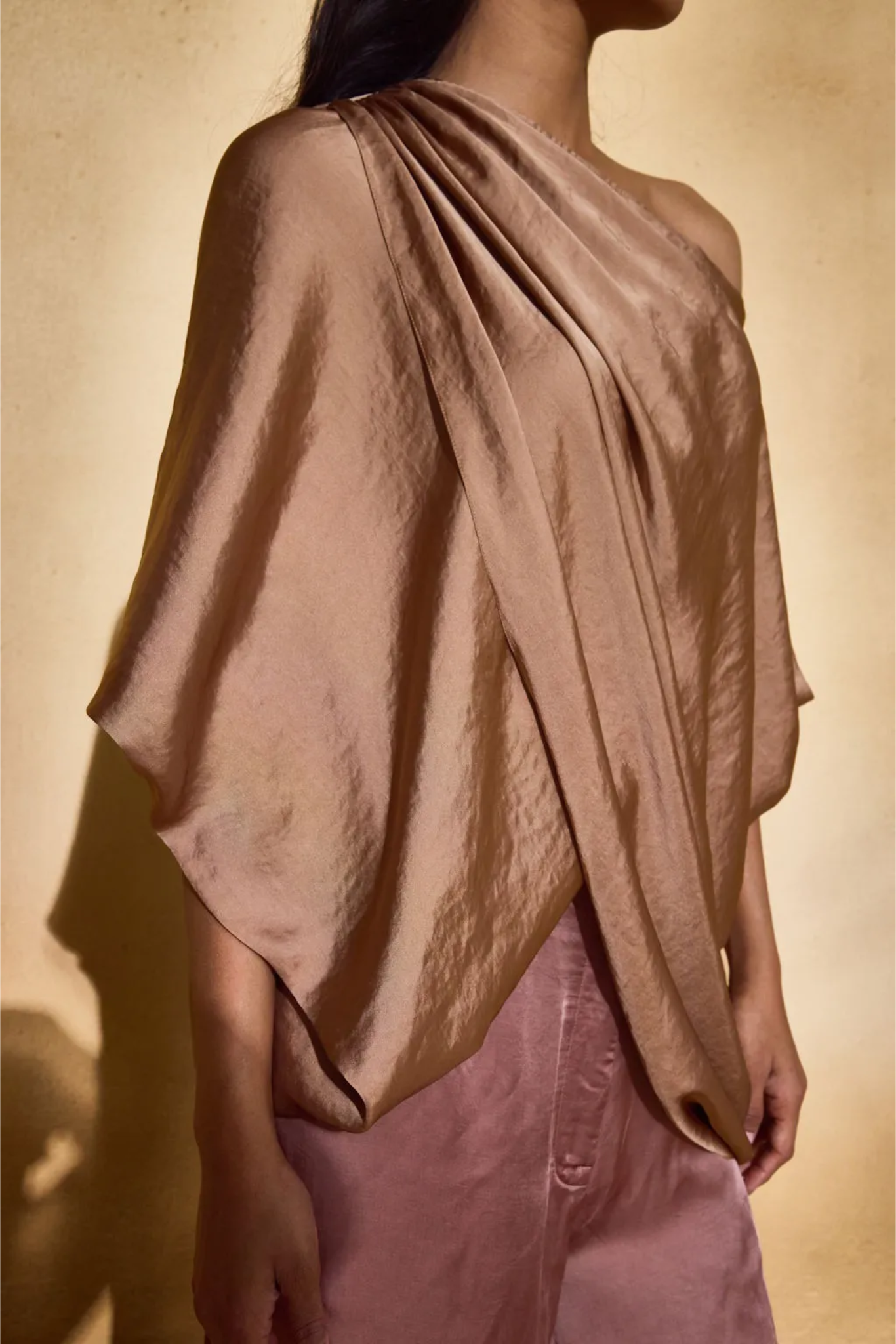 An ode to fluid form. The Lara Top features dramatic sleeves and a soft cut , off-shoulder neckline, crafted in lustrous satin that drapes like liquid. Voluminous yet refined, it pairs structure with softness, offering effortless movement and statement appeal.