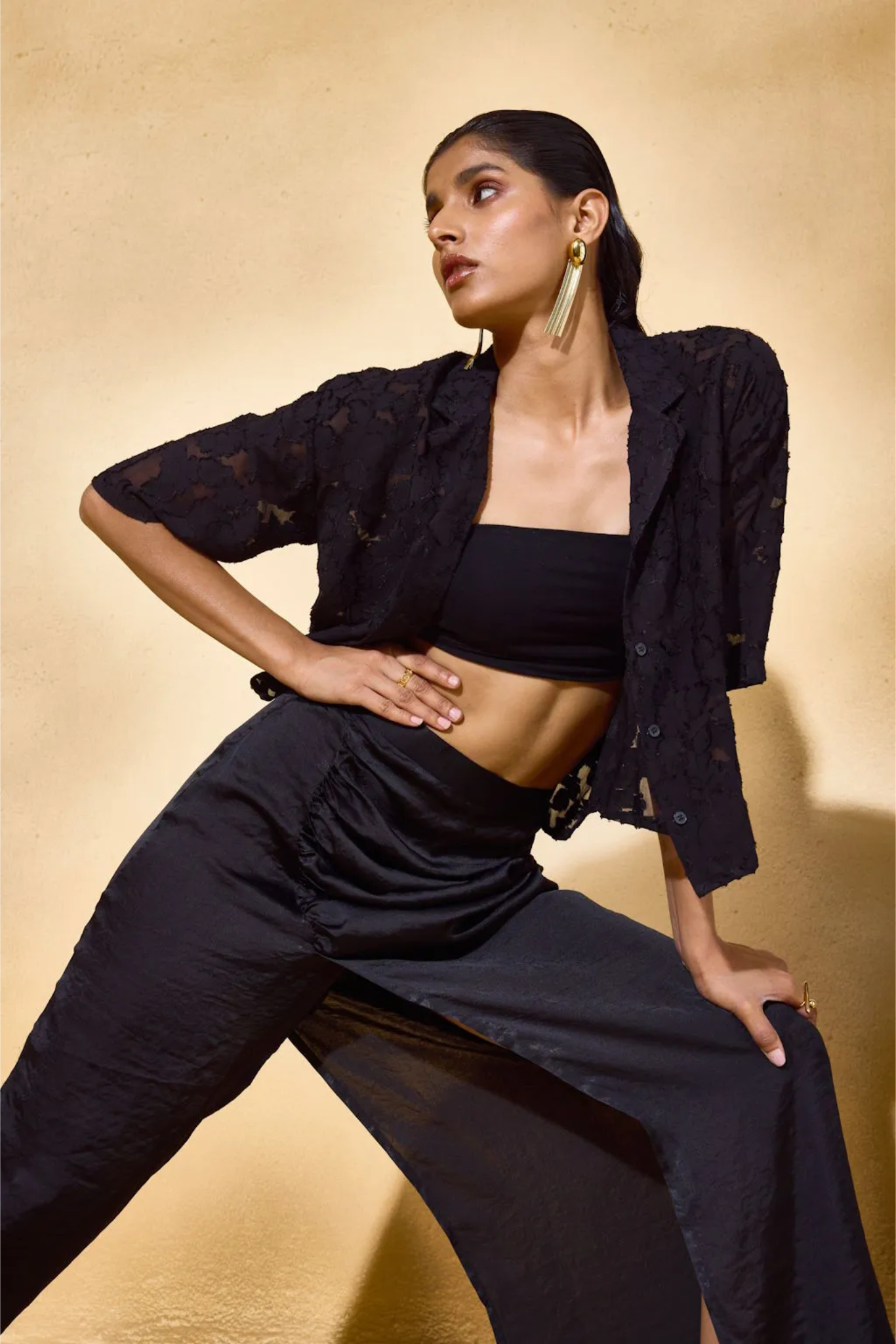 A bold twist on a classic silhouette, the Black Noir Skirt Pant blends structured tailoring with fluid movement. Featuring a sleek, high-waisted pant base seamlessly fused with an asymmetric overlay that mimics a skirt, this hybrid design is both edgy and elegant. Crafted in luxe black satin with a soft sheen, it drapes effortlessly while offering comfort and versatility. Pair it with a fitted top or a statement blouse for an elevated, fashion-forward look that commands attention.