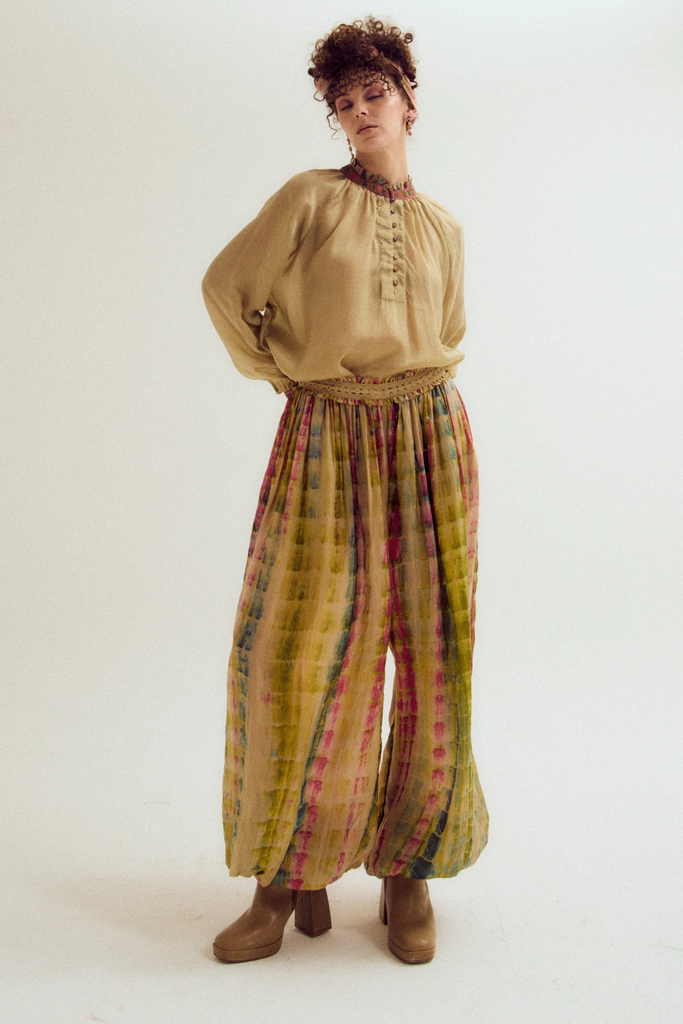 A refined two-piece ensemble that blends artisanal detail with relaxed elegance. The Eila Shirt features raglan sleeves with intricate embroidery on the band collar and cuffs, while the Bauhini Pants showcase a signature tie-dye finish, gathered silhouette, and an elasticated waistband with functional pockets. Delicate lace accents at the waist and hemline add a feminine touch, making this set perfect for elevated daywear or effortless evening style.