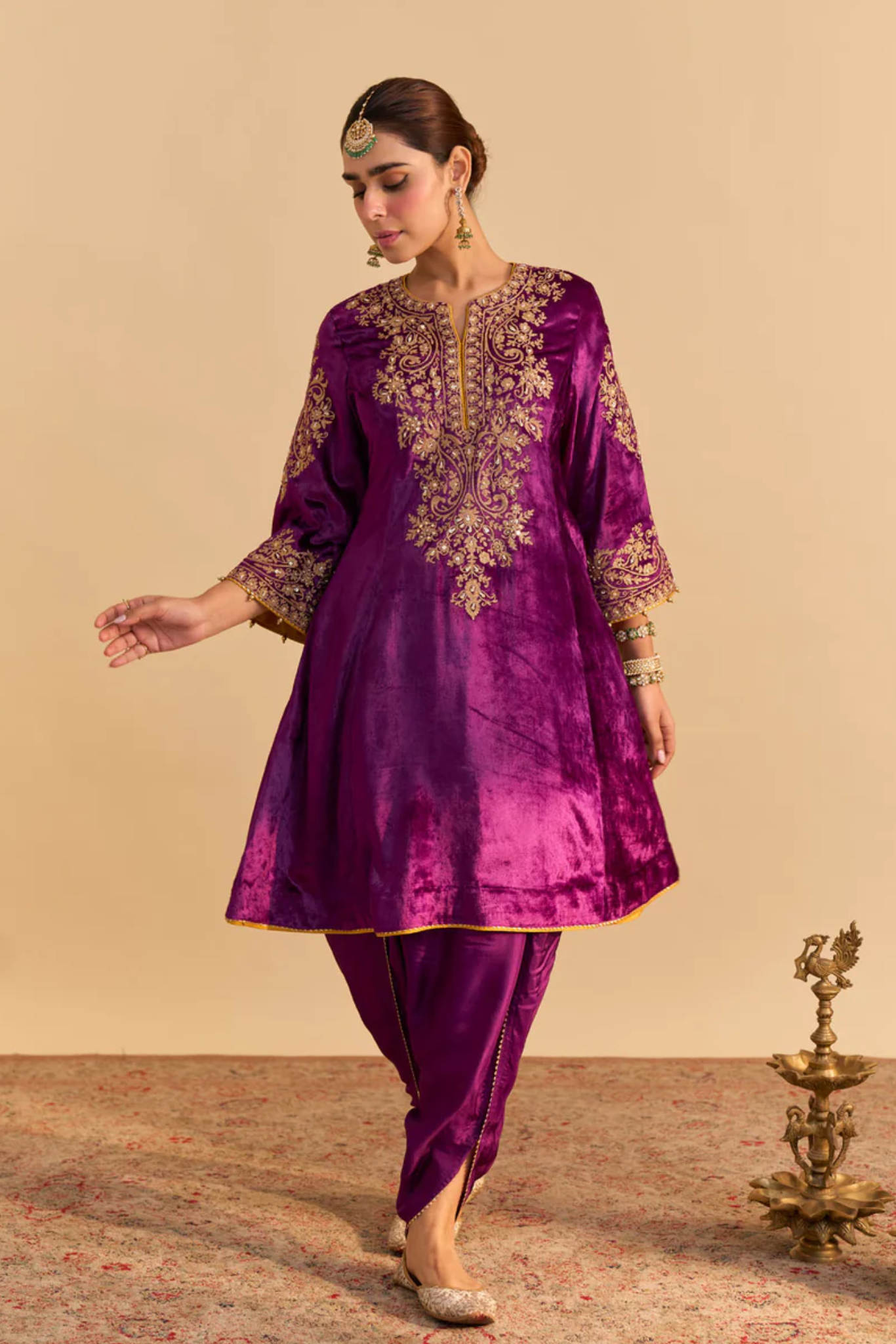 This short A-line kurta from our Velvet Collection features a zero neck with a long slit, a back zero neck, and three-quarter sleeves. It is paired with a stylish tulip dhoti for a contemporary yet traditional look. The kurta is adorned with aari tilla embroidery, beautifully highlighted with pearls and sequins, adding richness and festive charm to the ensemble.