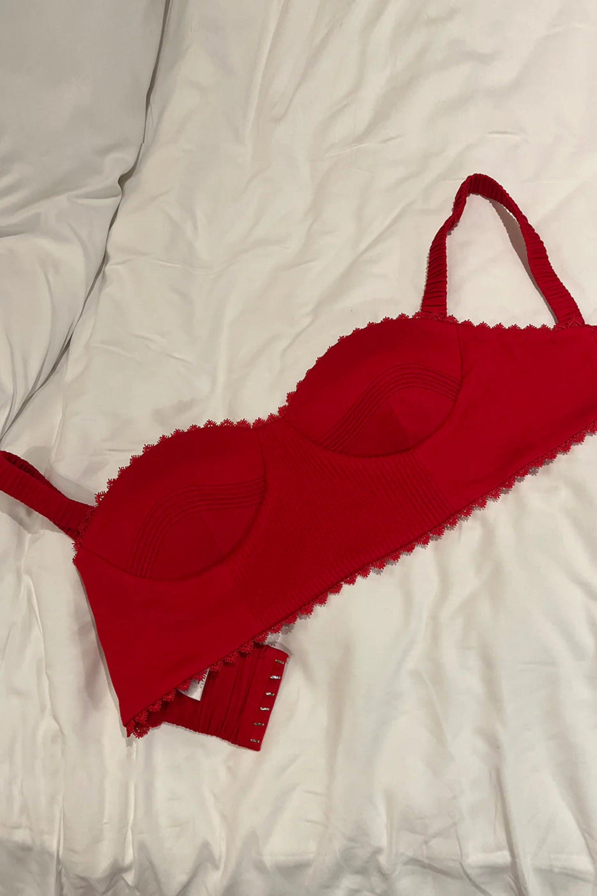 A cropped corset featuring stylised lines on the cup & centre front panel, hook & eye opening at the back & scrunchie straps.