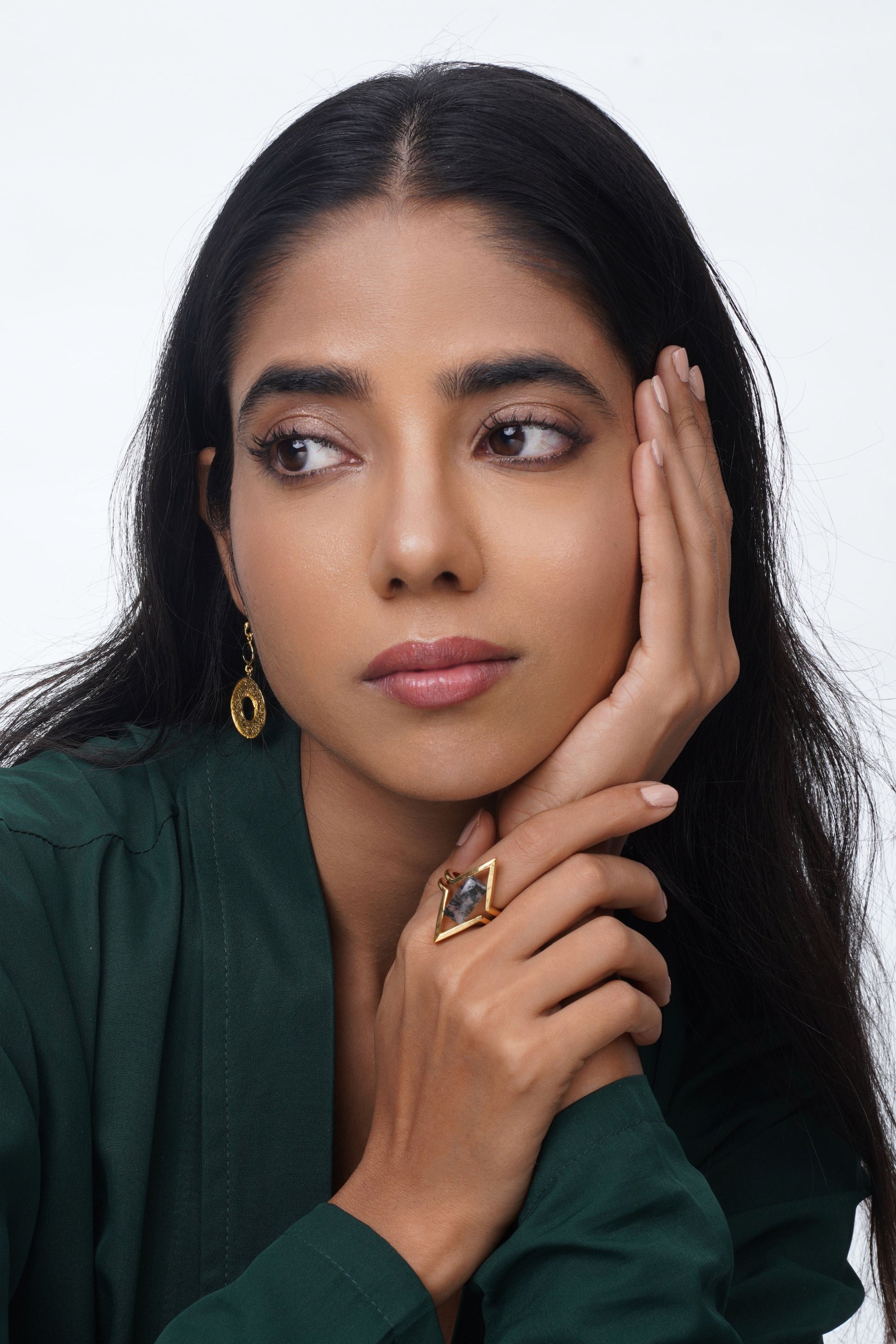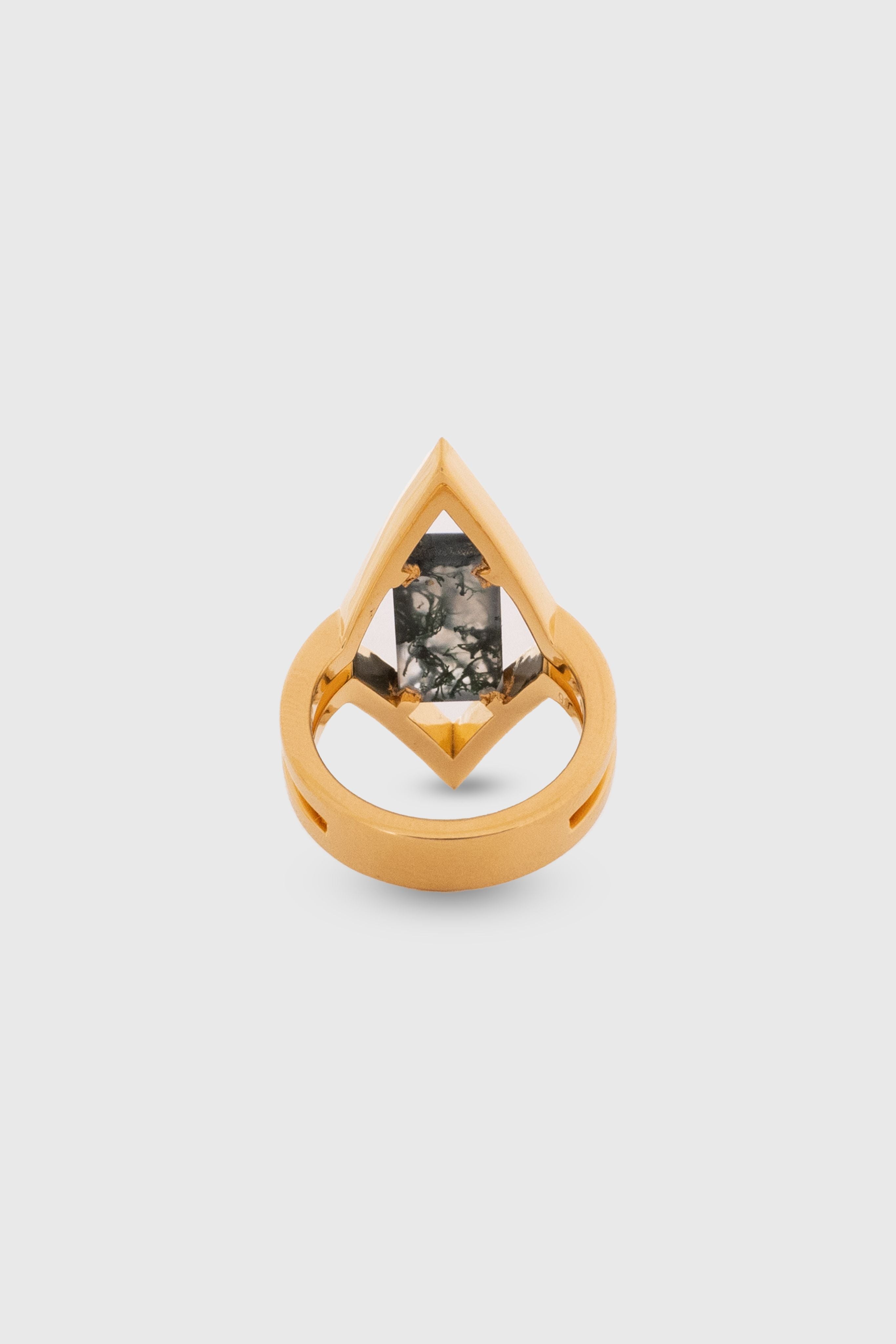 The Eternal Ring is a signature piece and object of art. It is a creative combination of the eternal eye and geometry. A Moss Agate baguette cabochon with organic green patterns constructed within a double V shape frame, V for VODA.