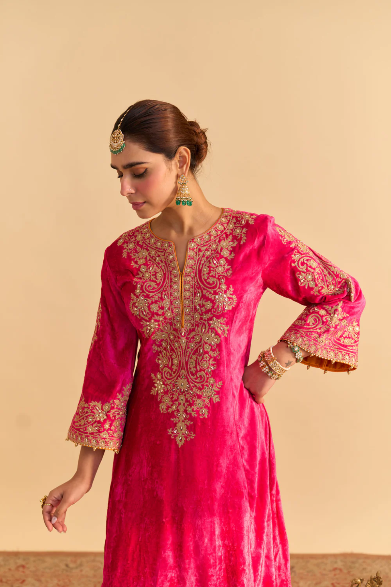 This kurta set is from our Velvet Collection. It features a short velvet kurta paired with a silk salwar and crafted with three-quarter sleeves. The kurta has a zero neck with a slit and is embellished with kirandori embroidery done in aari, highlighted with pearls. The salwar is finished with an embroidered border.