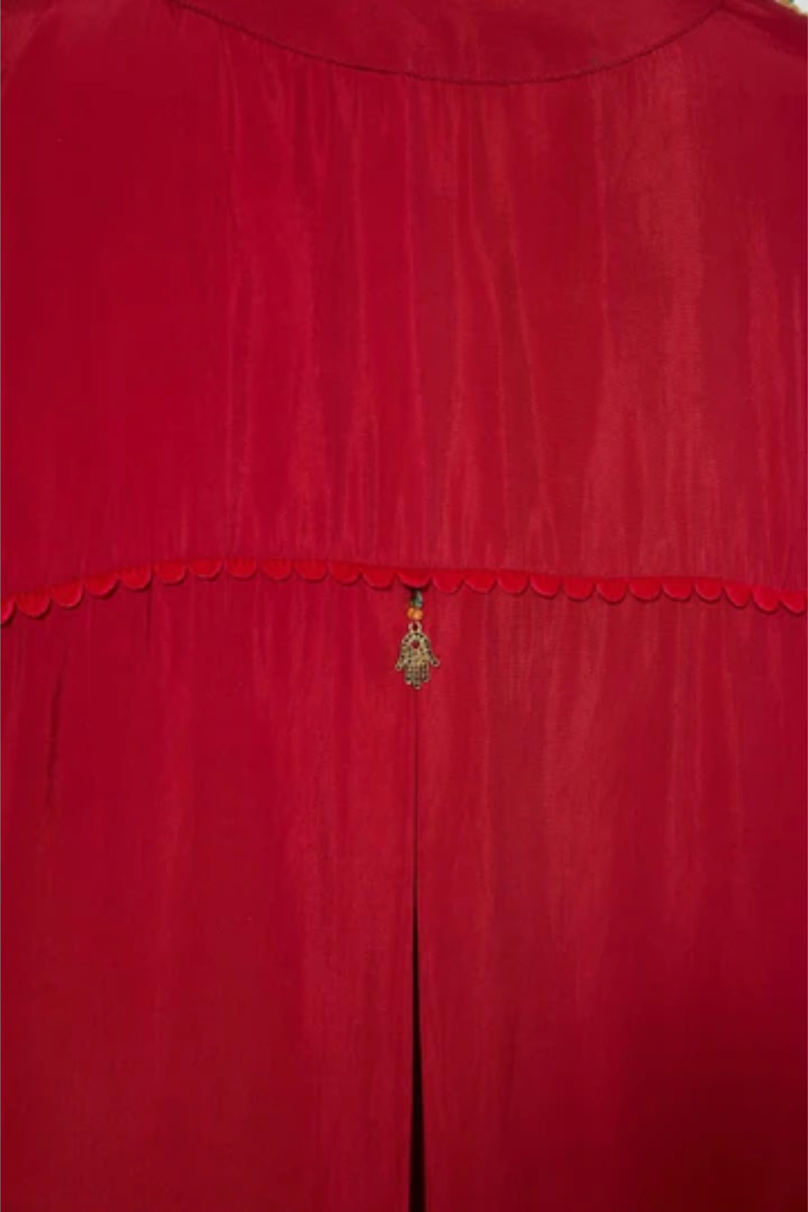 Description Cherry Red Free Size Kurta Featuring Hand Embroidery At Yoke And Sleeves, Paired With Matching Cherry Red Twill Pants With Hand Embroidery Detailing.