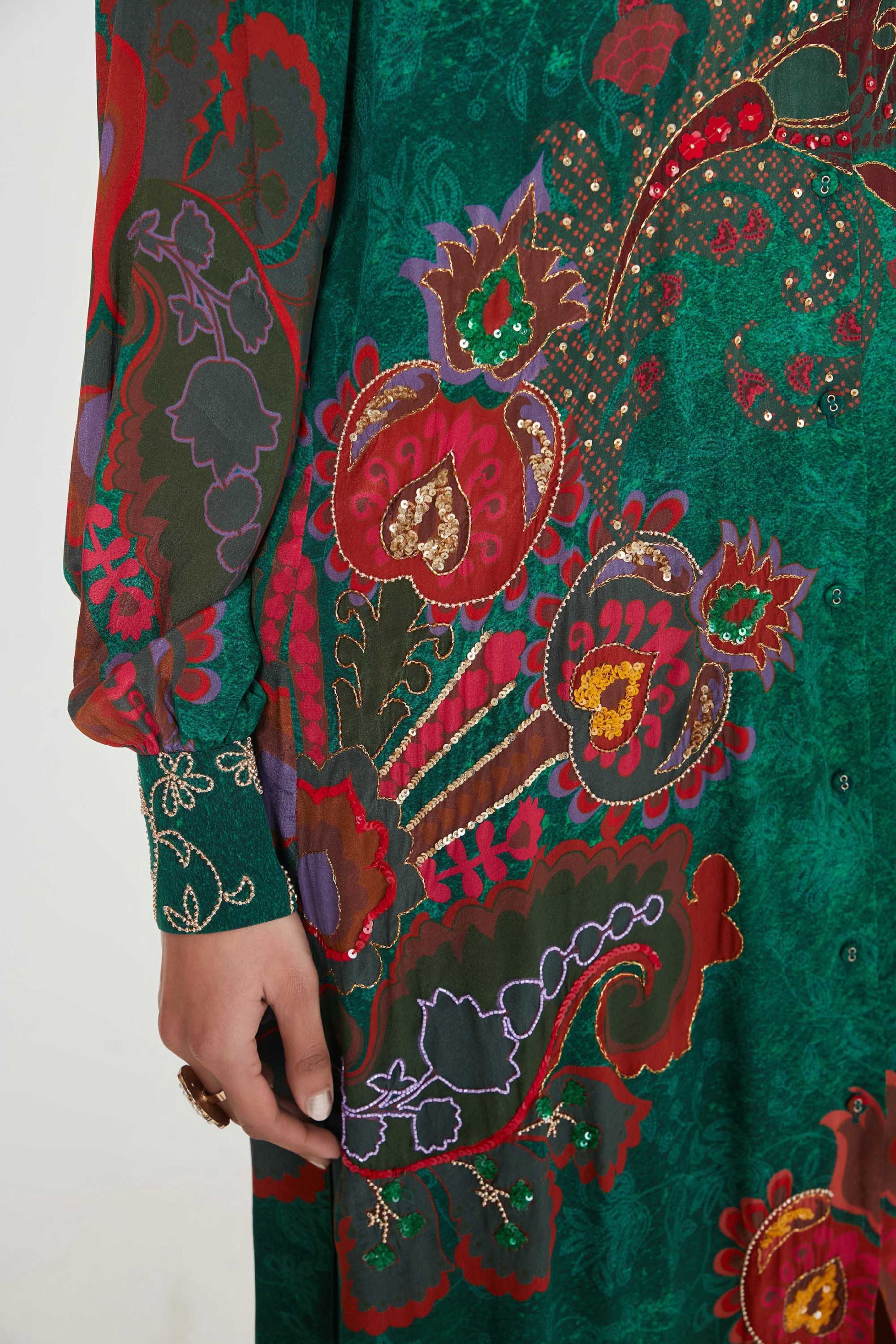 Description Royal Green Bold Paisley Printed Tunic Set Featuring Intricate Hand Embroidered And Tassel Details Paired With Moca Hand Embellished Pleated Pants.