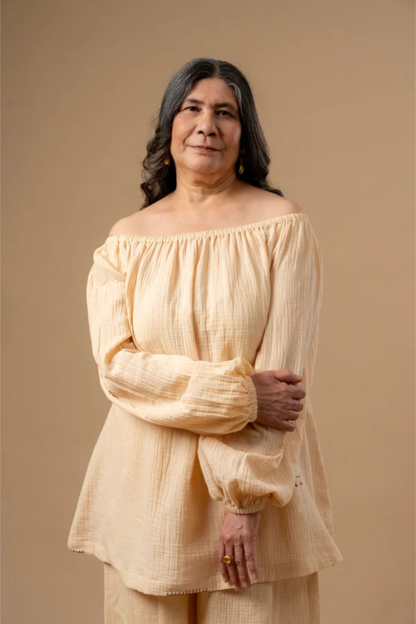 The set consists of an off-shoulder long top with an elasticated neck and cuffs, featuring randomly placed embroidery doodles, paired with flared organic cotton pants that have an elasticated back, a pleated front, pocket details, and randomly placed doodle embroidery.