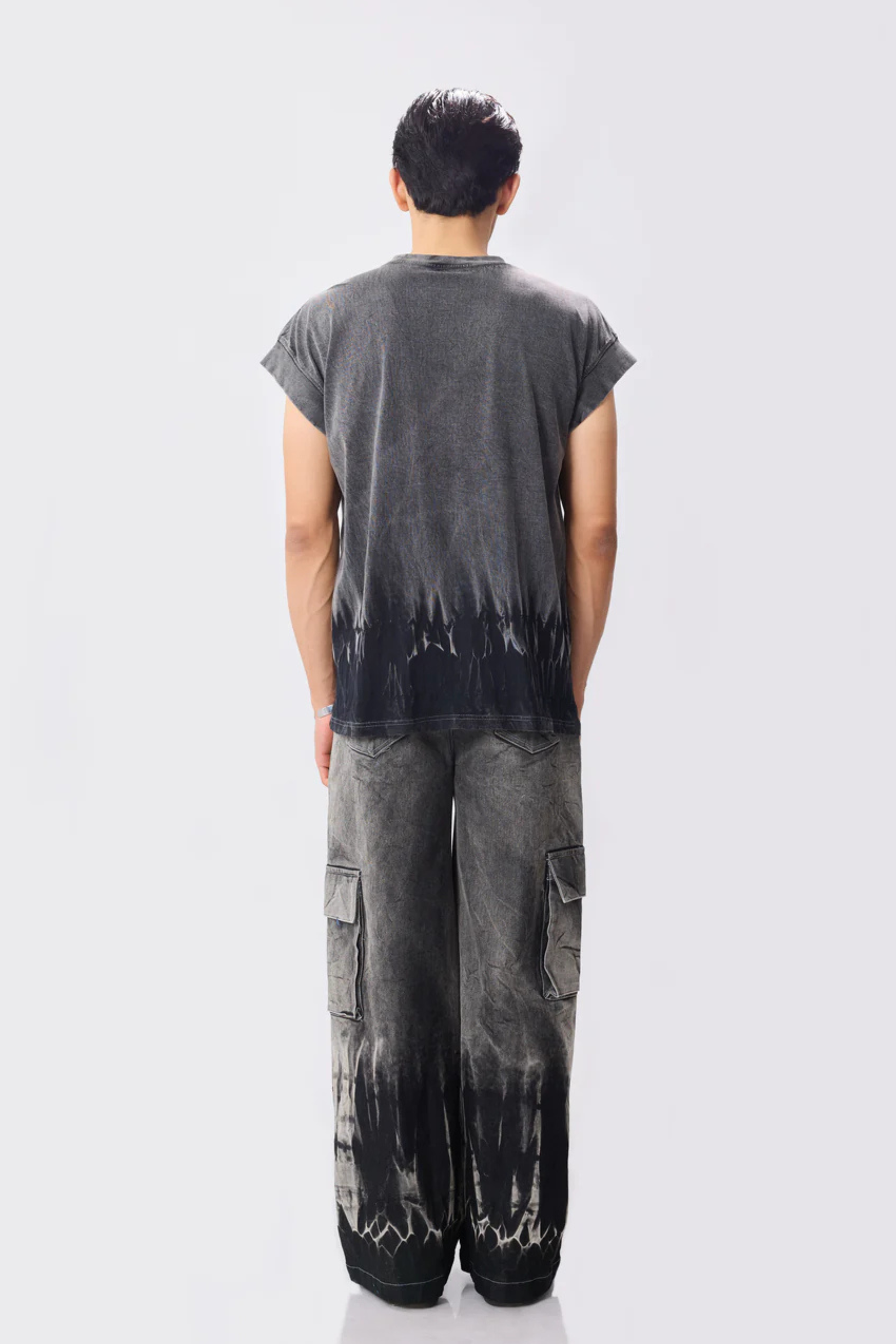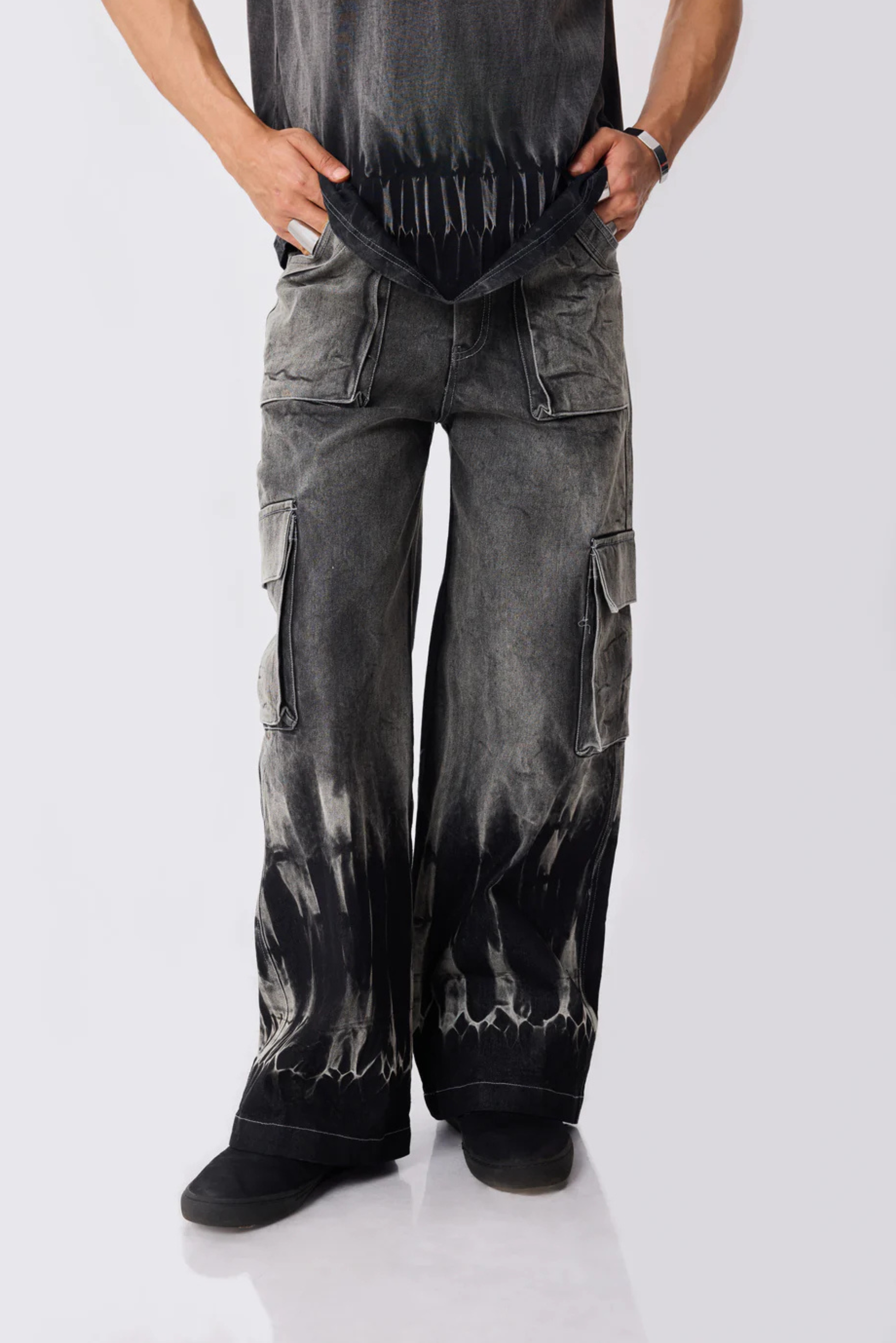 Pants Product Description Wide leg cargo pants made in heavy weight 12oz denim fabric, featuring multiple front and back pockets, along with side box pockets. What makes these pants stand apart is the unique tie dye effect at hem, that gives it a flaming effect after acid wash. Product Code PTTHN067