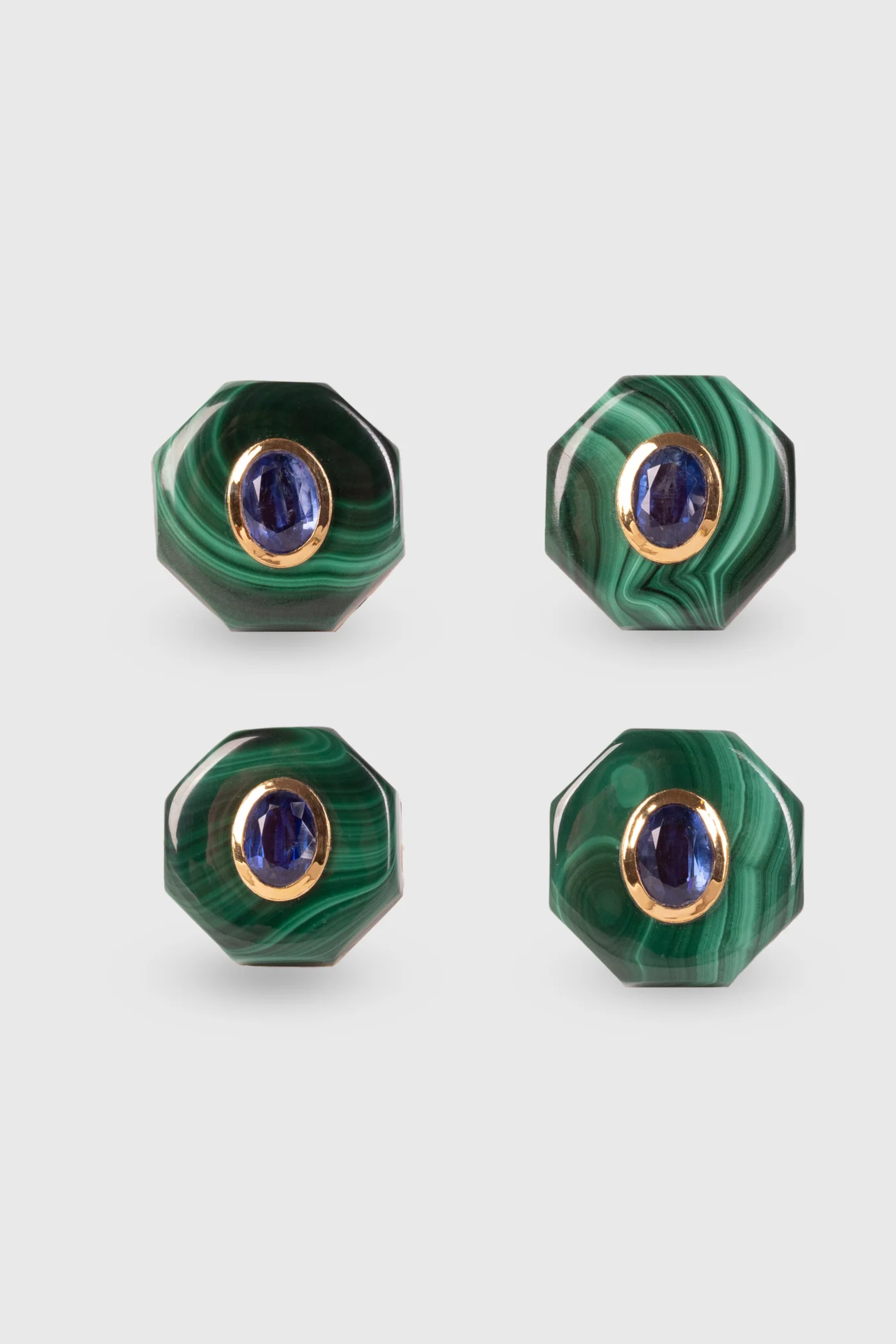 A Malachite hexagon cabochon with unique white patterns and nested within is a Kyanite oval. Product Code