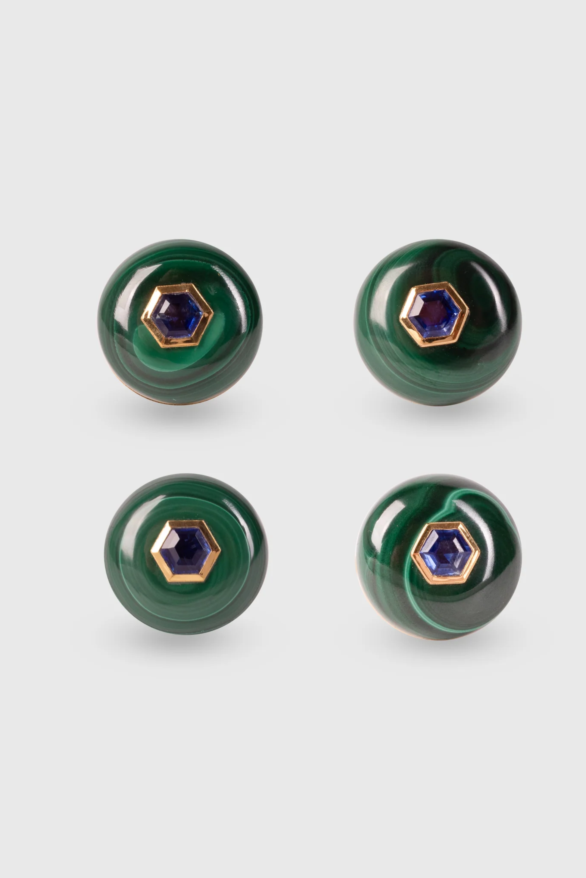 A Malachite round cabochon with unique white patterns and nested within is a Kyanite hexagon. Product Code