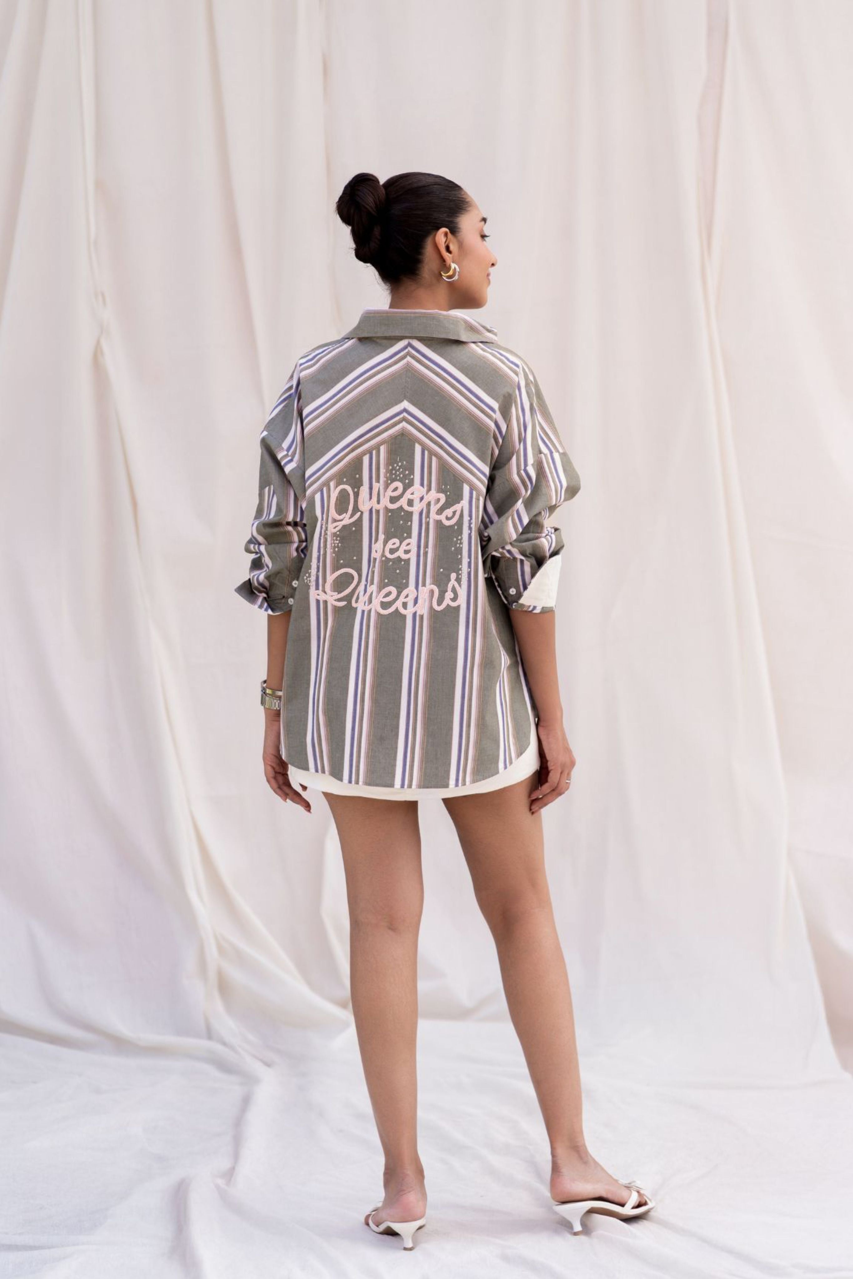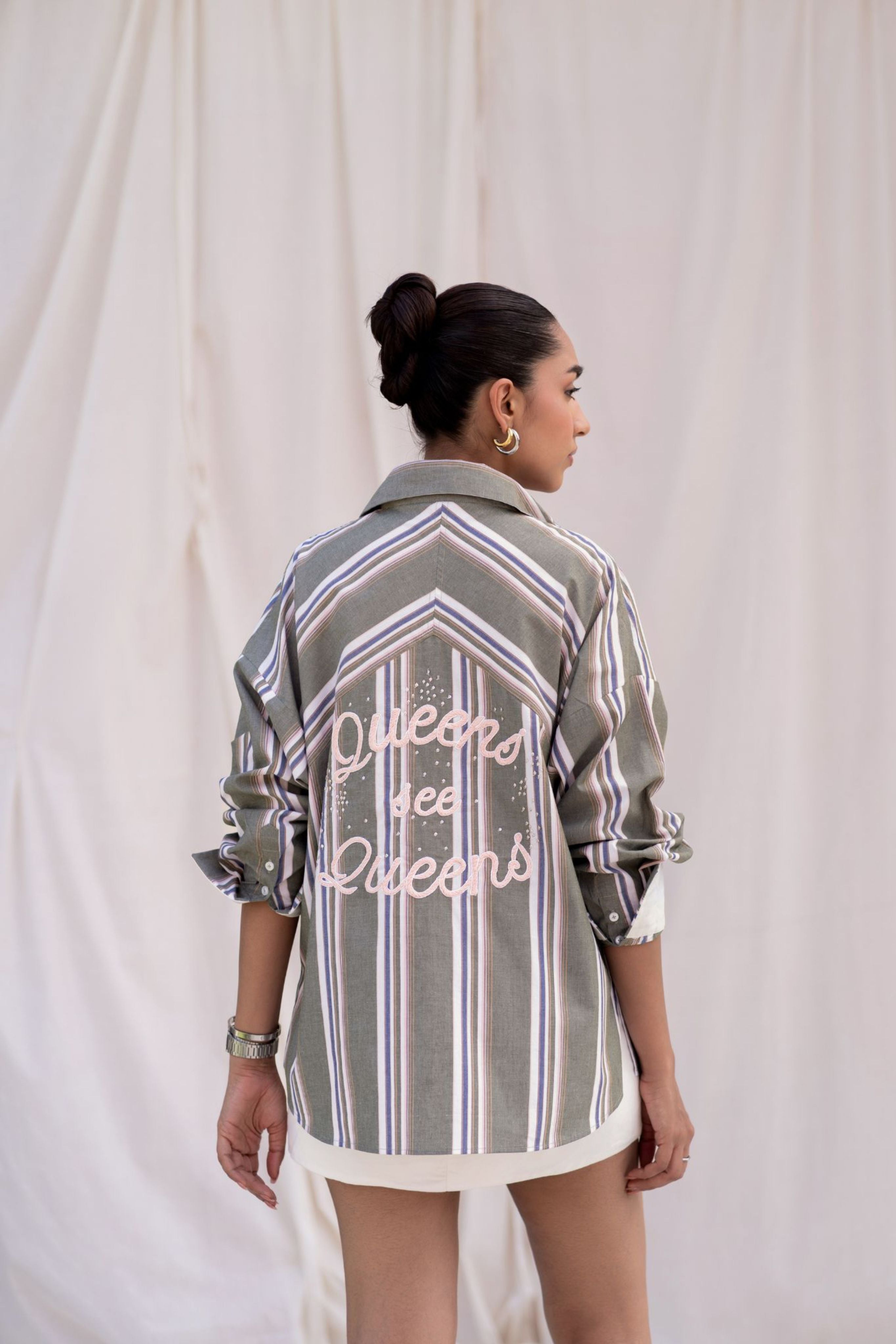 Stand out in this green striped shirt featuring intricate back embroidery and a unique Queens See Queens design on the back. A statement piece perfect for everyday style or standout casual looks.