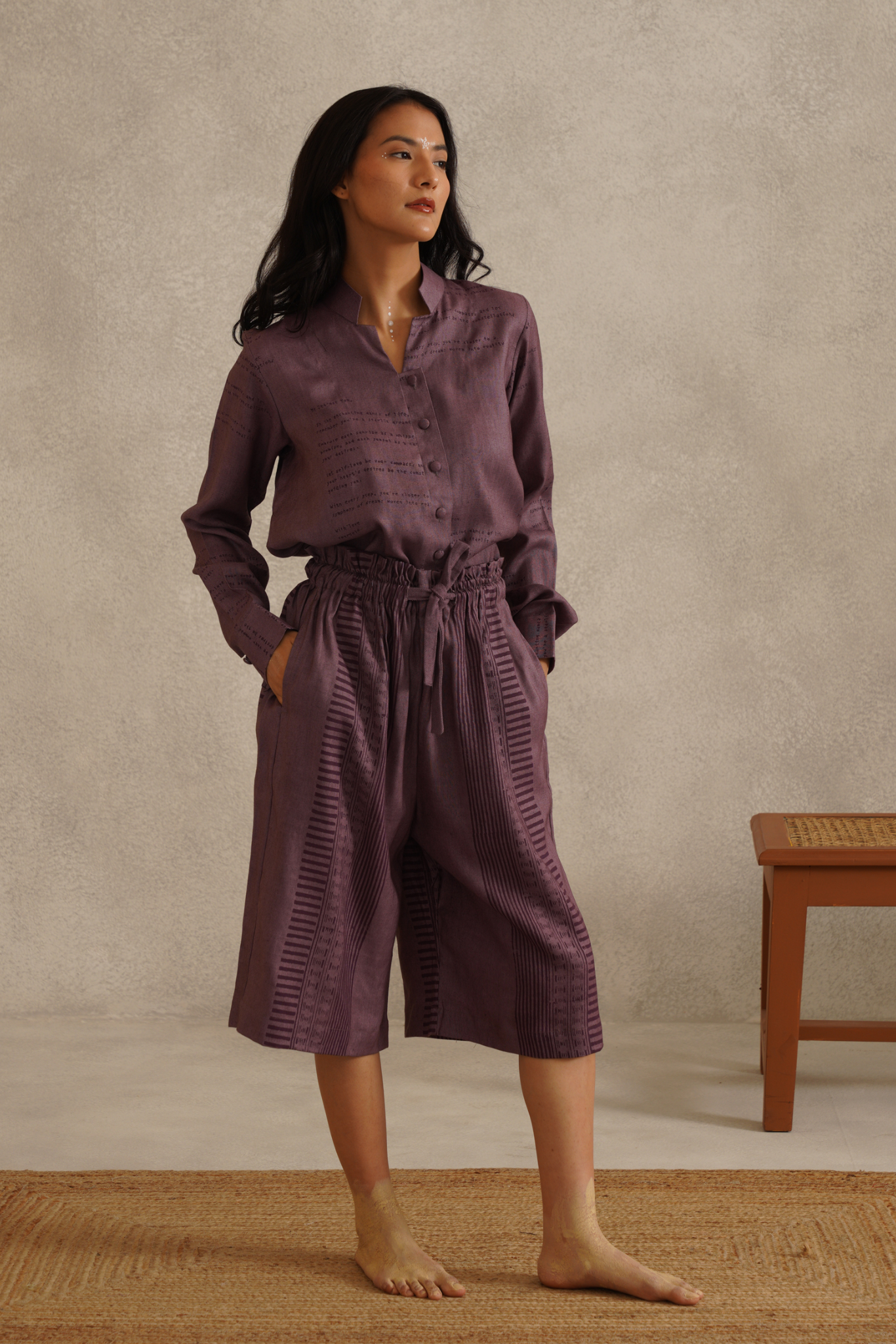 This garment features a design that falls just below the knee, with a paperbag waist and a drawstring for an adjustable fit. Made from kala cotton denim and hand block printed, it combines comfort with sustainable craftsmanship.