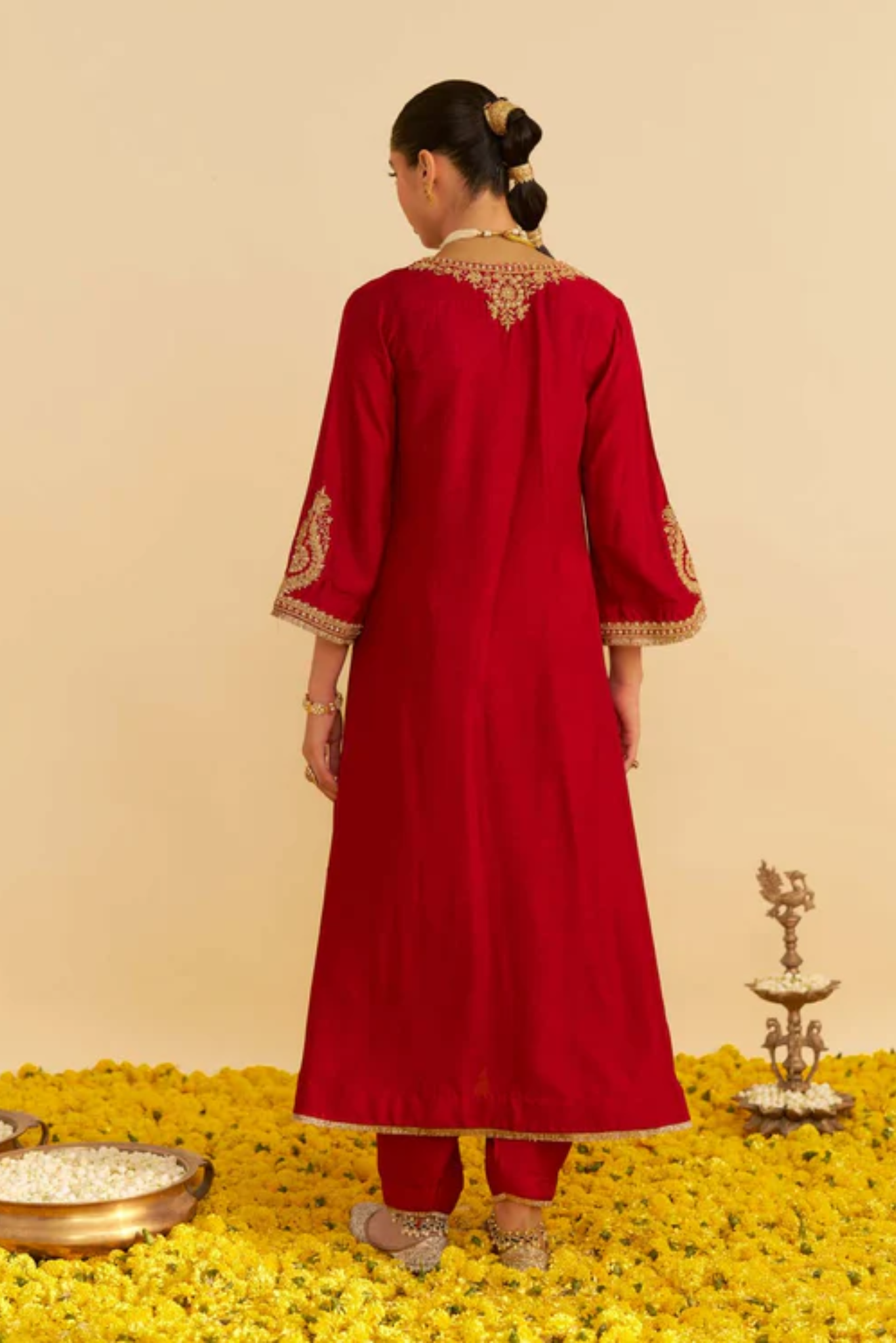 The long kaftan features a broad and deep V-neckline at the front, a zero neckline at the back, and three-quarter sleeves finished with traditional Kiran detailing. It is paired with a classic Dogri salwar, complementing the overall silhouette.