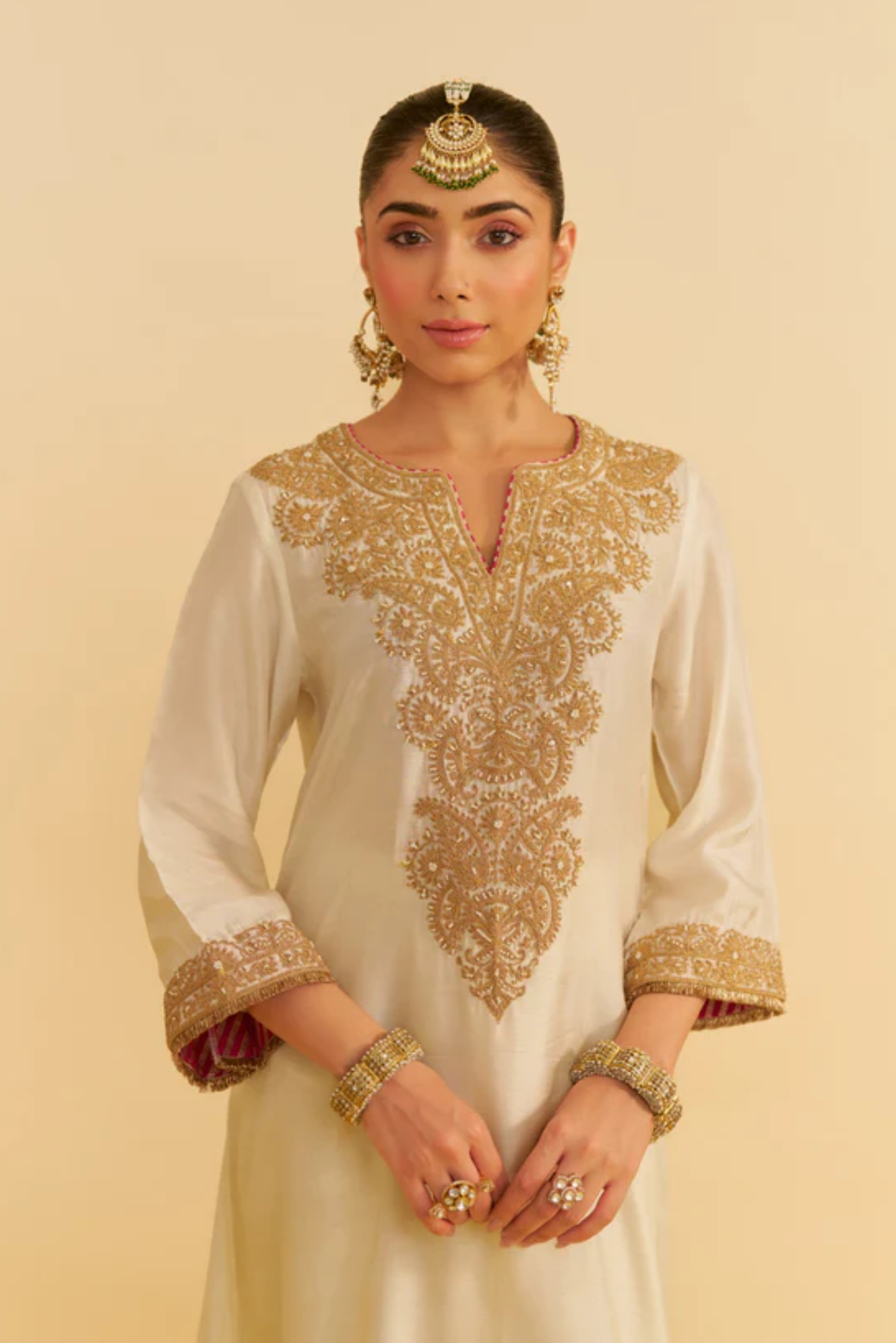 The long kaftan features a zero neckline with a front slit, a zero back, and three-quarter sleeves finished with traditional Kiran detailing. It is paired with a classic Dogri salwar, completing the ensemble with a touch of timeless charm.